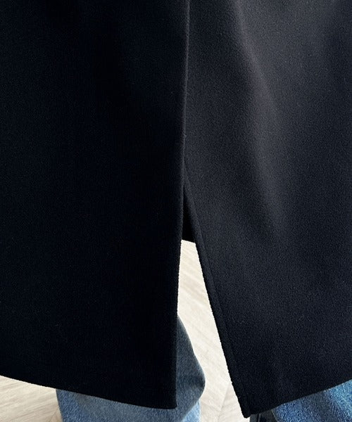 タートルニットやミニボトムスとも絶妙にマッチするアウター。