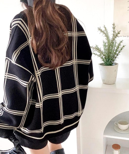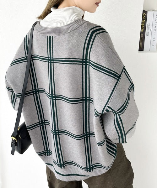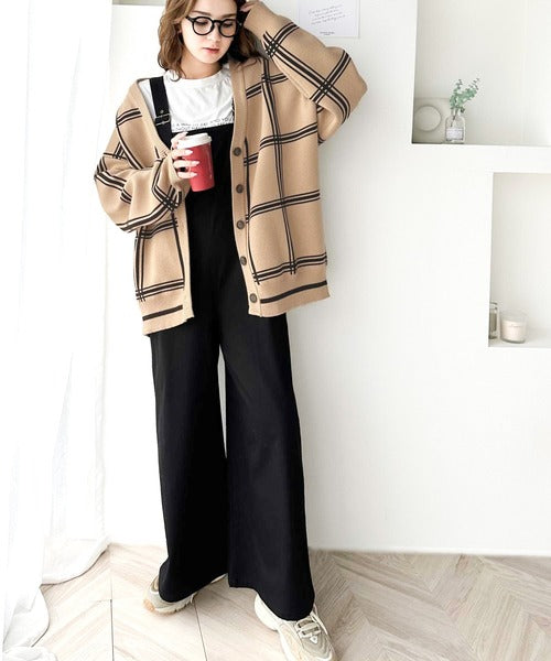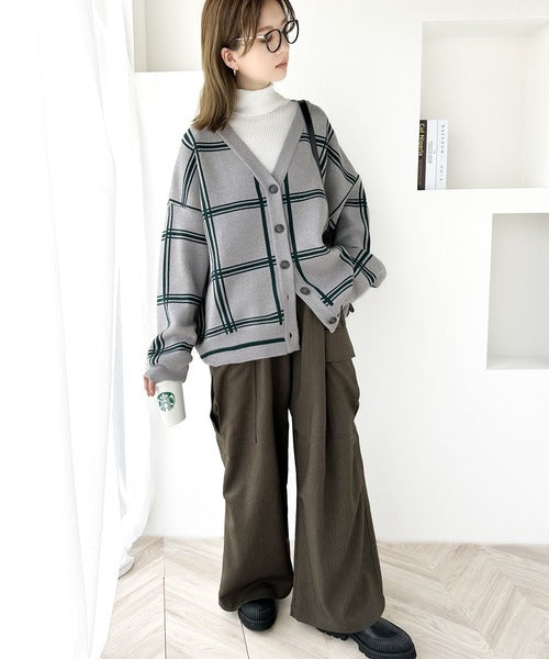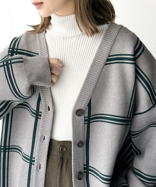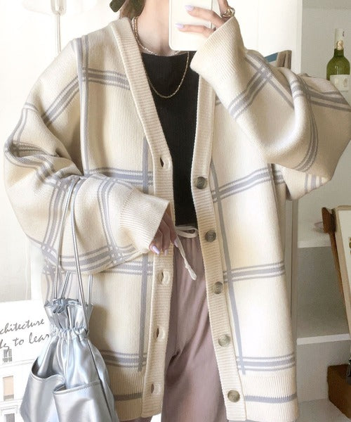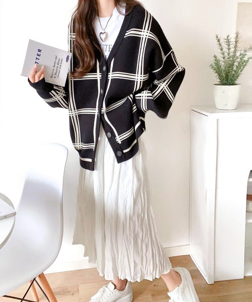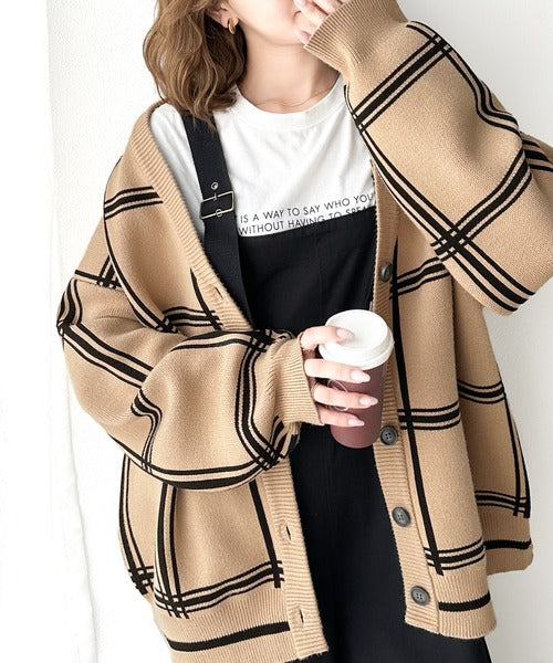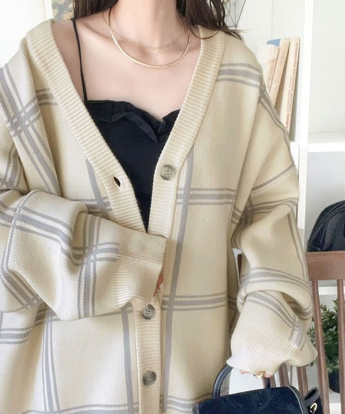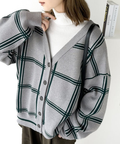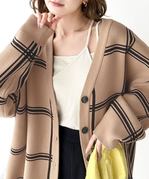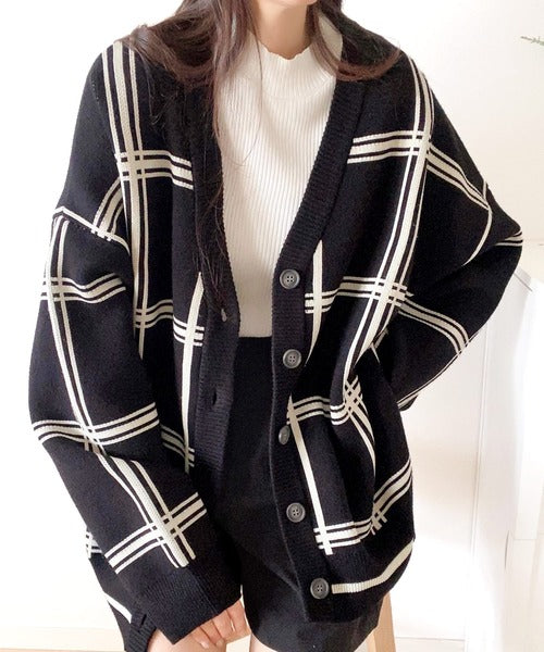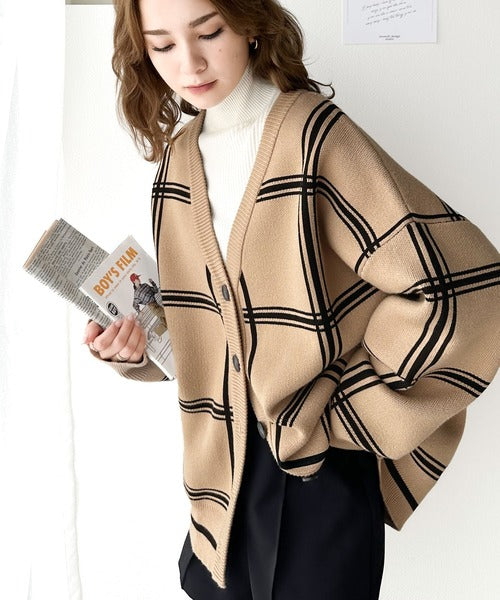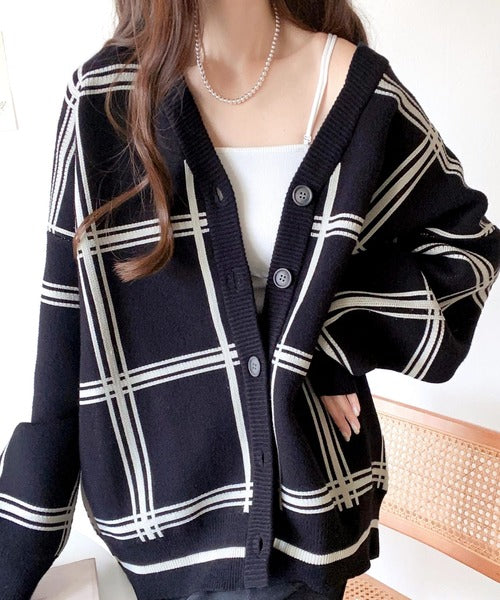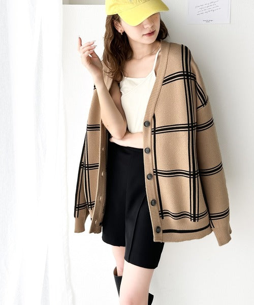 トレンドの韓国風チェック柄が存在感を引き立てるニットカーディガン。