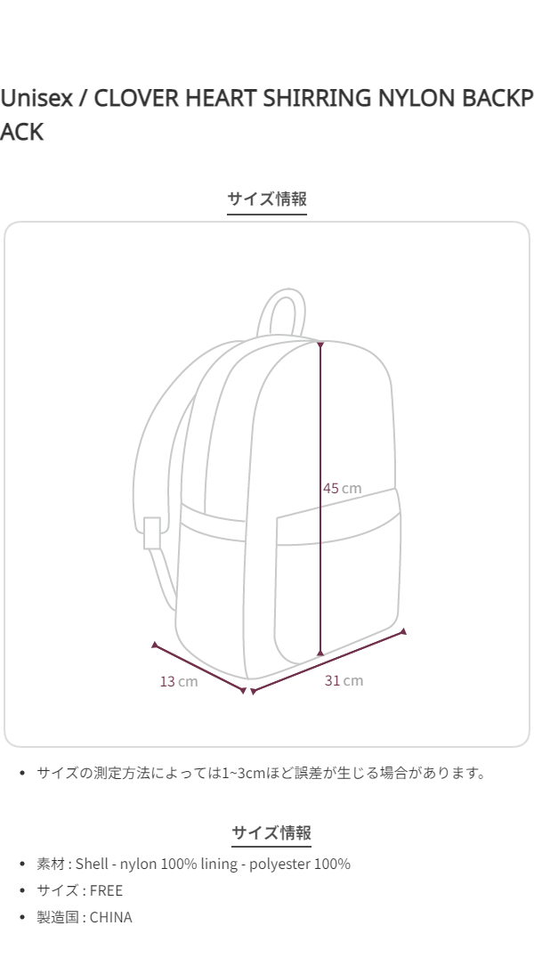 ソフトタッチ感とシャーリングポケットポイントとリボンディテールがポイントのクローバーハートシャーリングナイロンバックパック