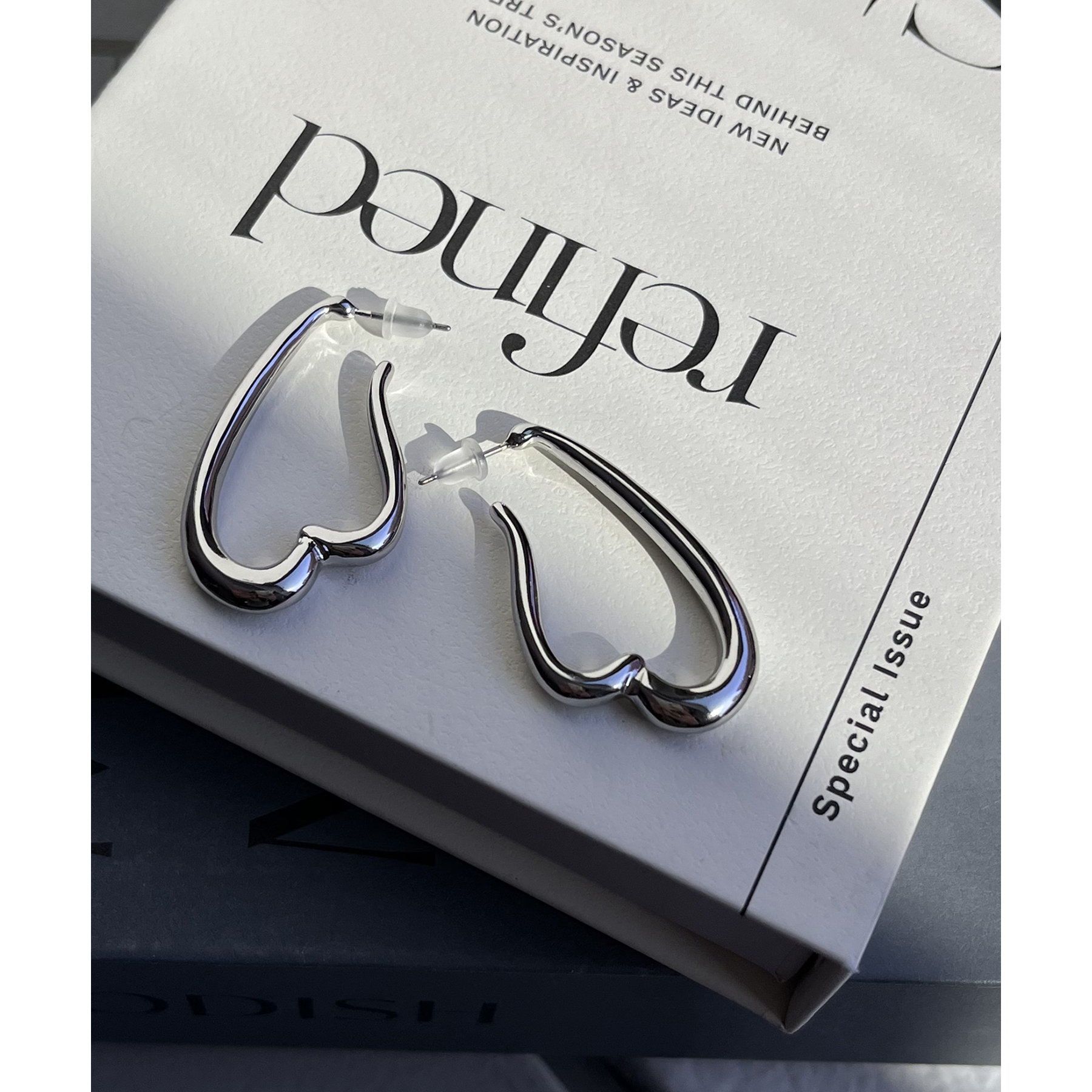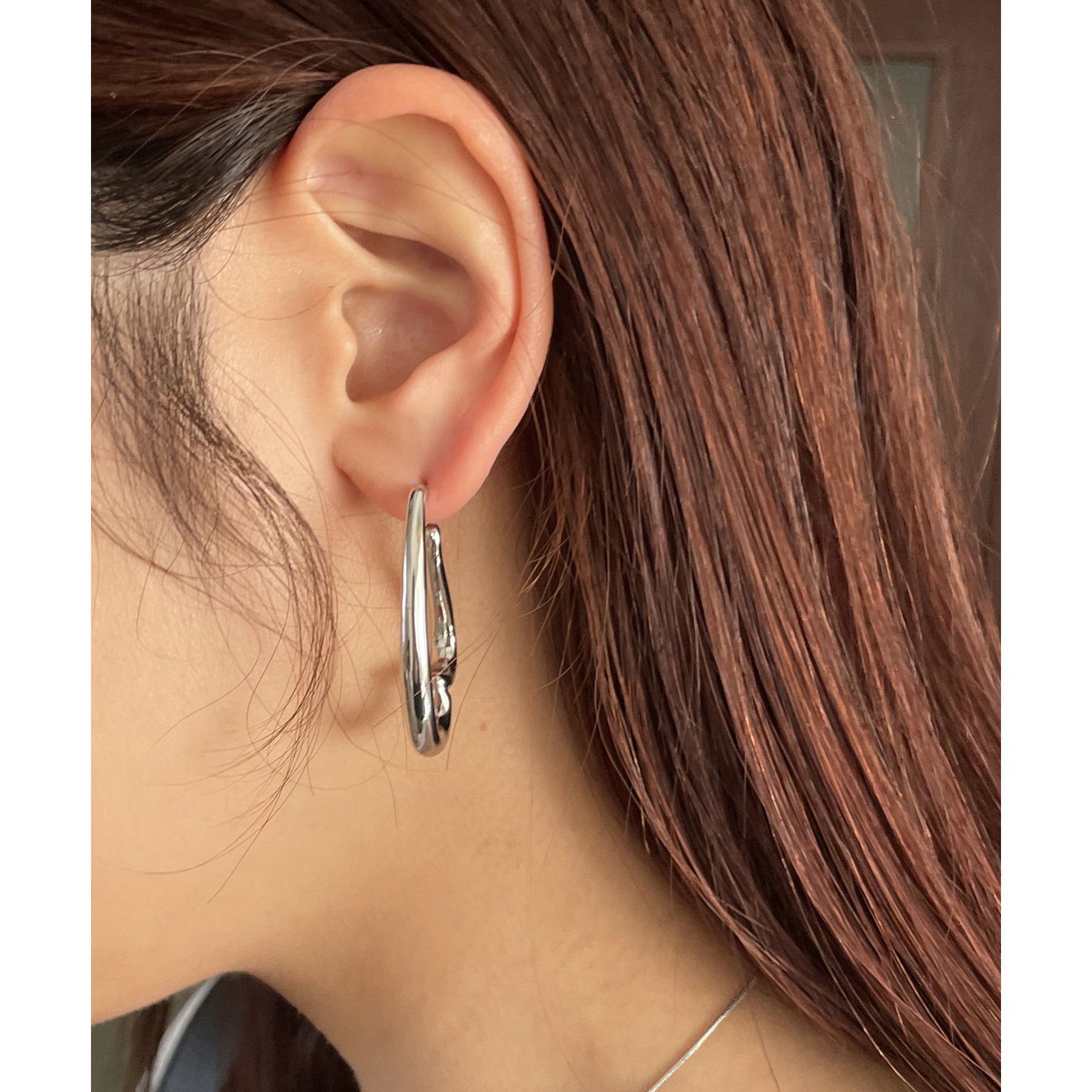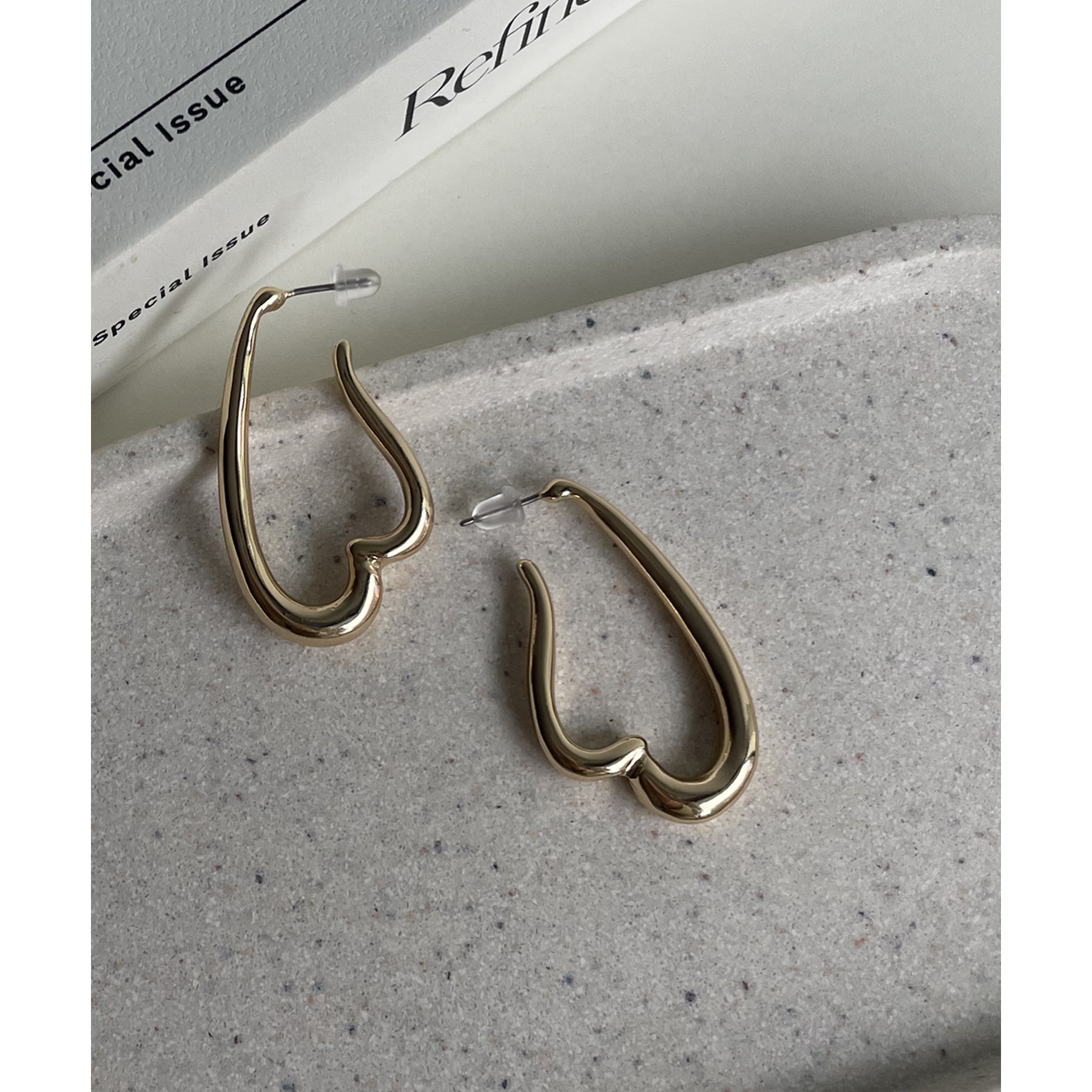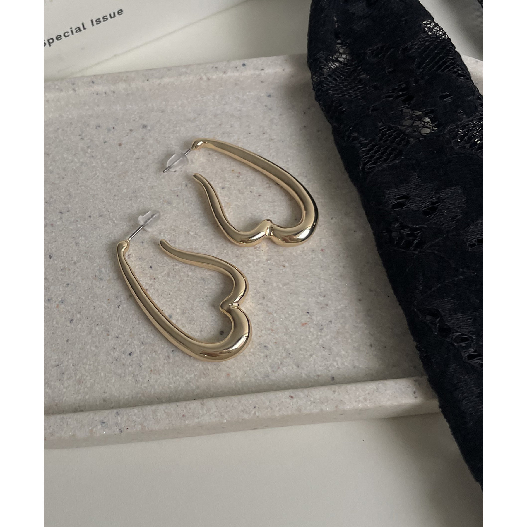 スタイリングのアクセントになるハート型のフープピアス