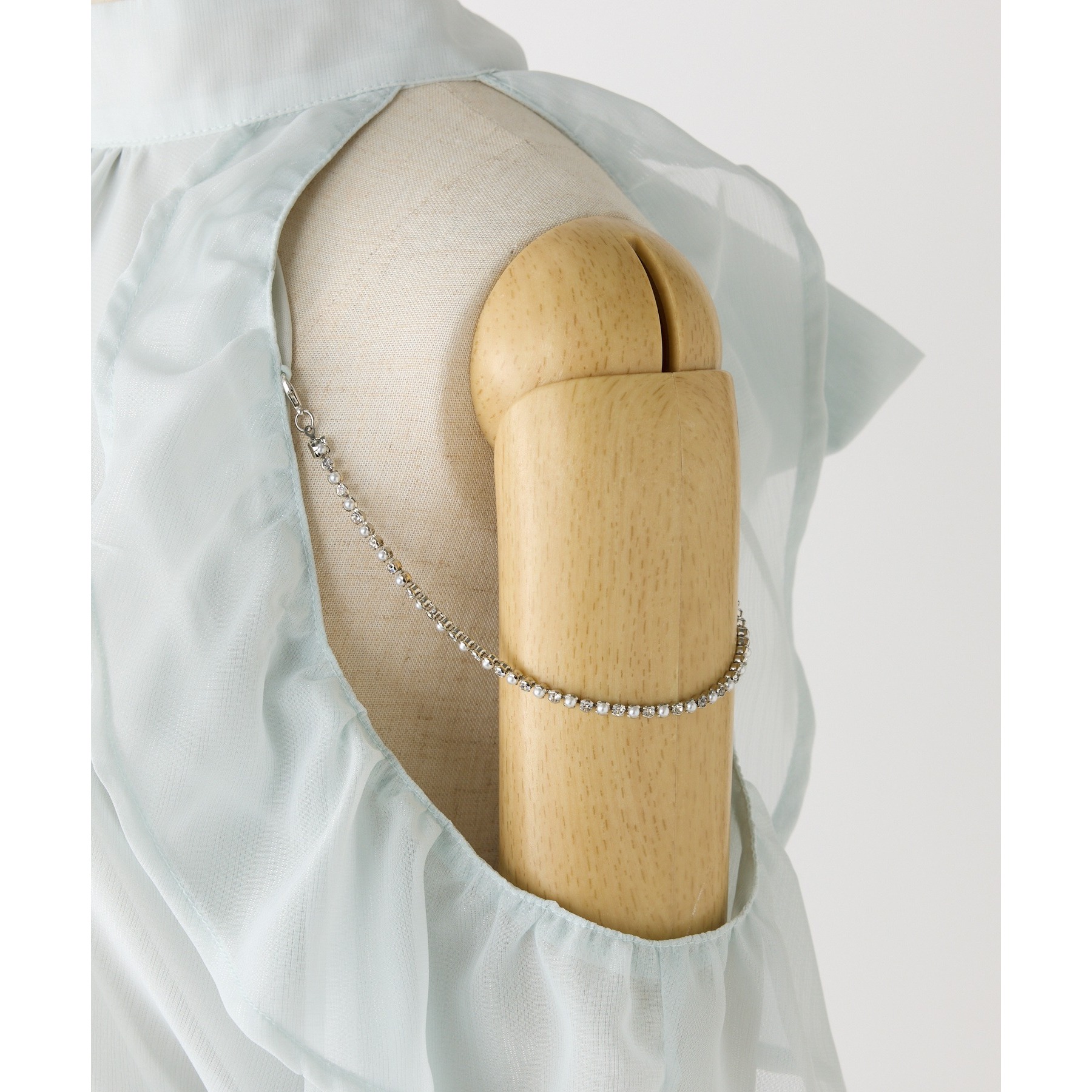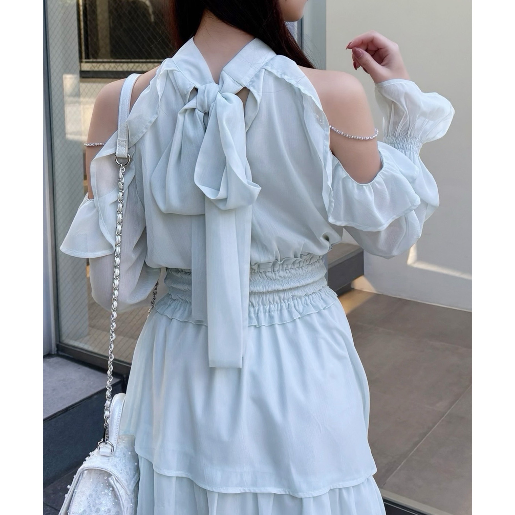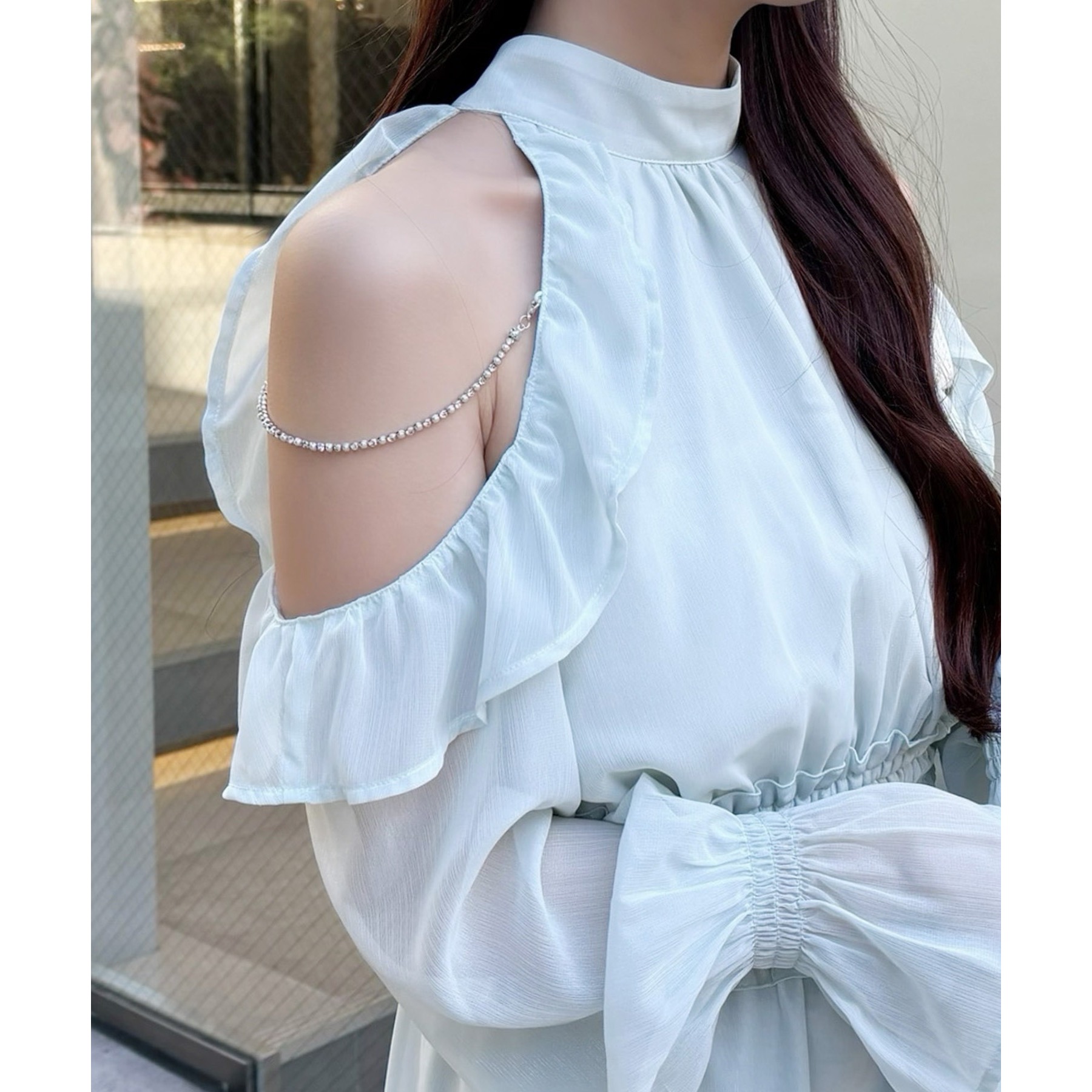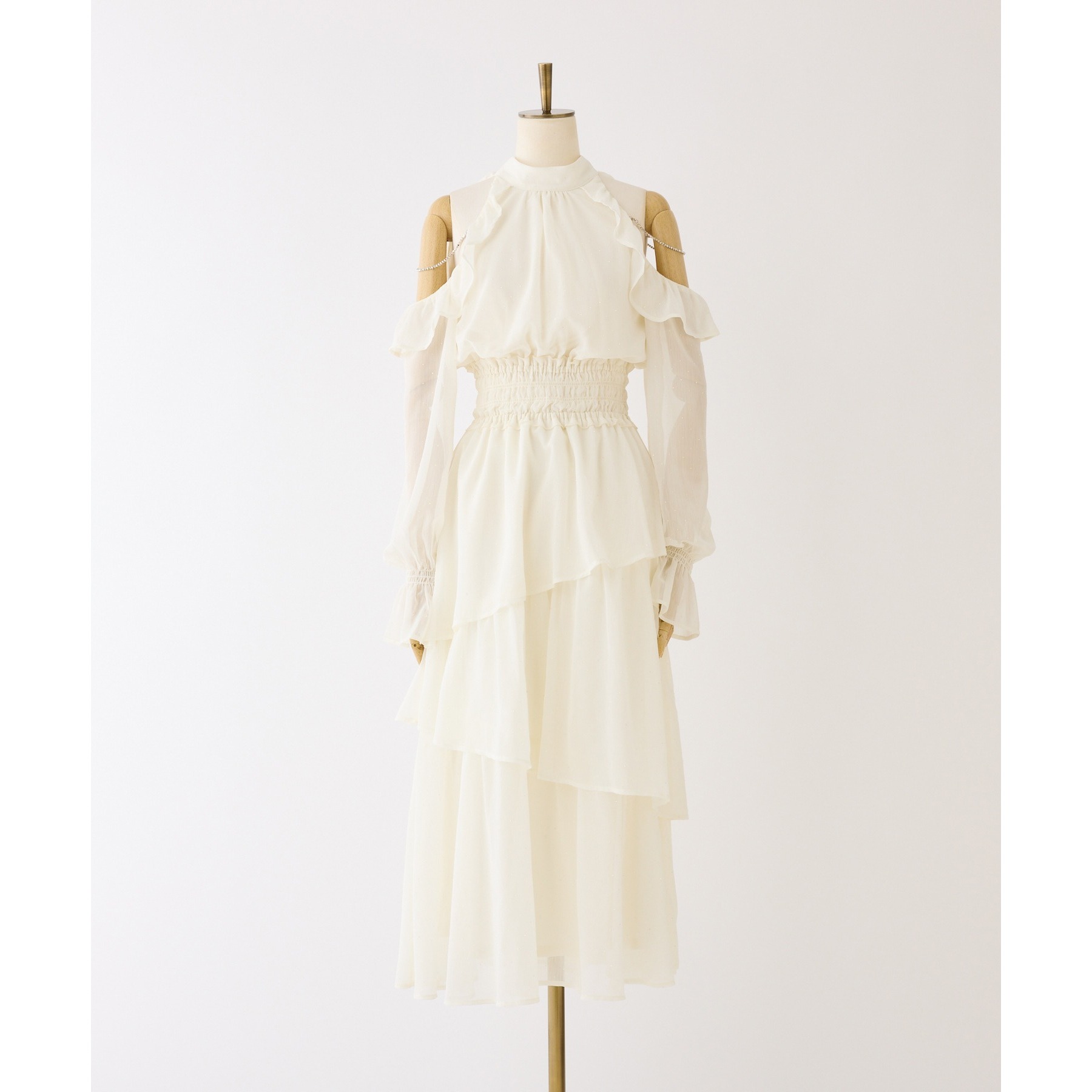 アメスリデザインで肩にはビジューが施され、女性らしさを引き立ててくれる1枚。