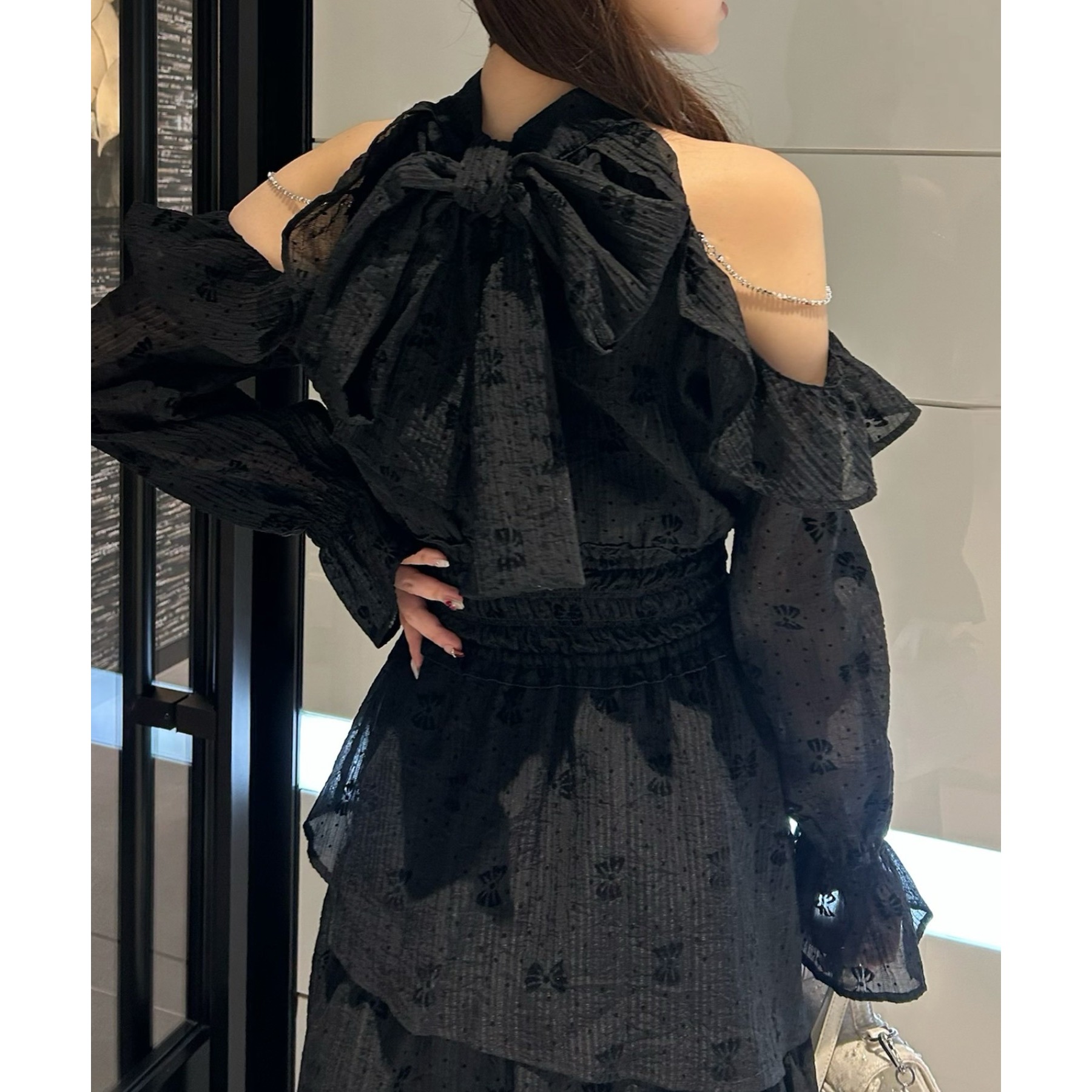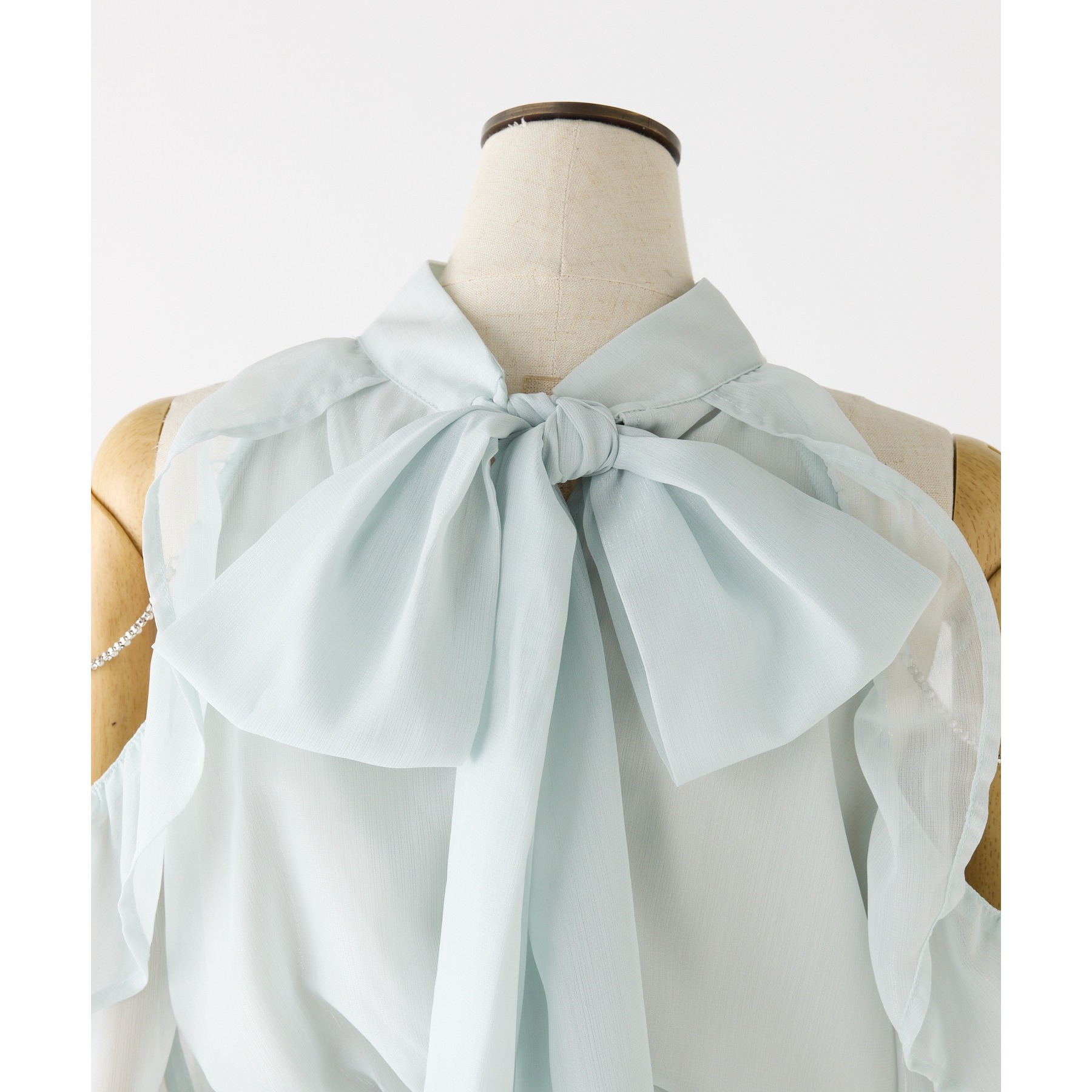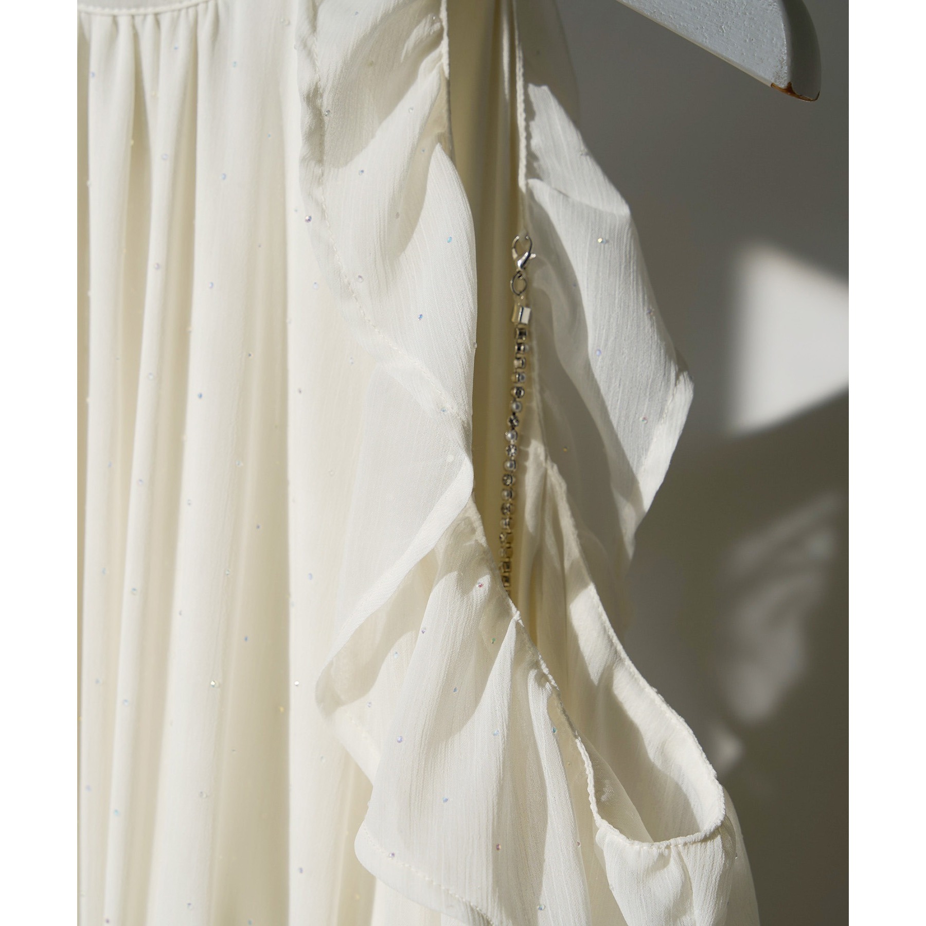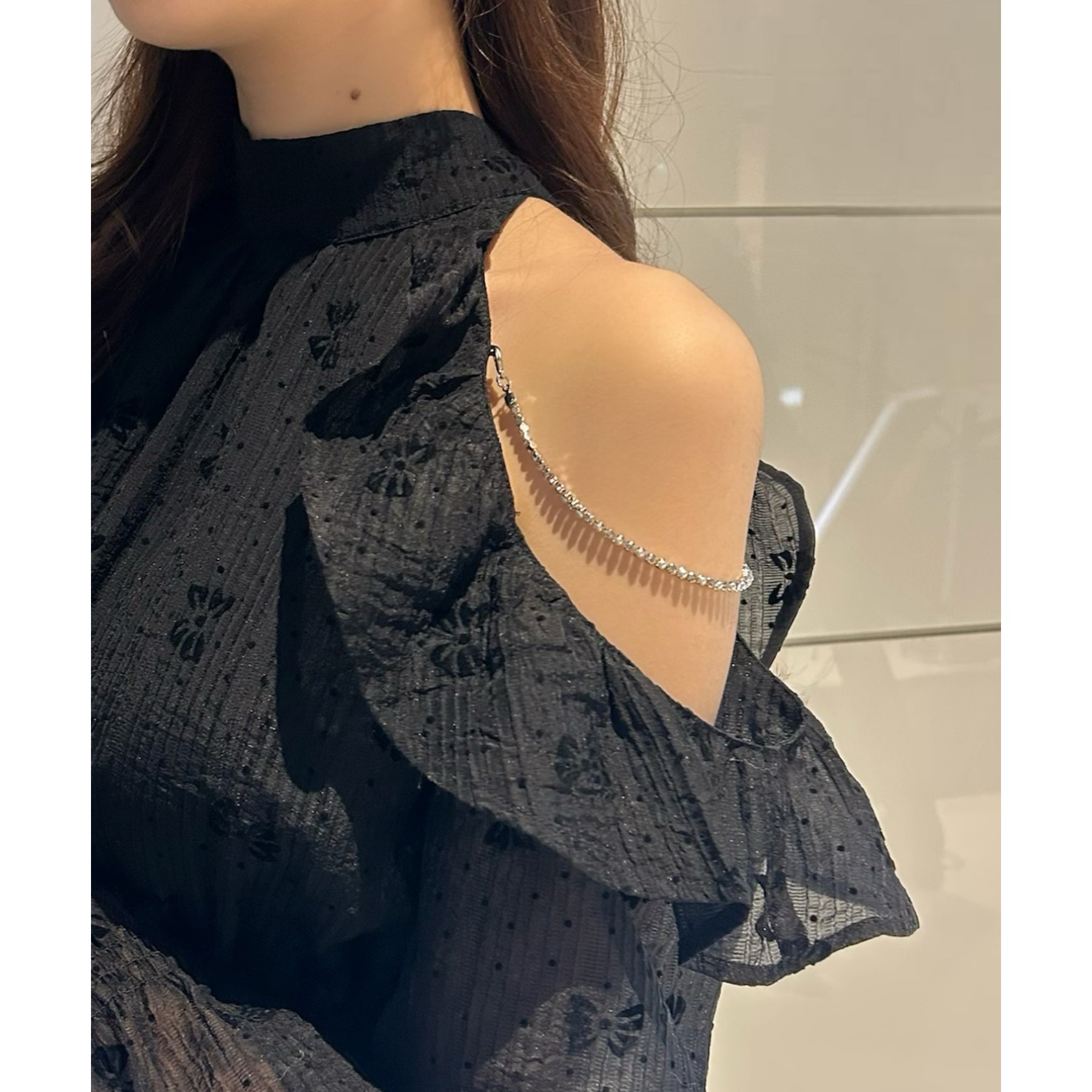 アメスリデザインで肩にはビジューが施され、女性らしさを引き立ててくれる1枚。