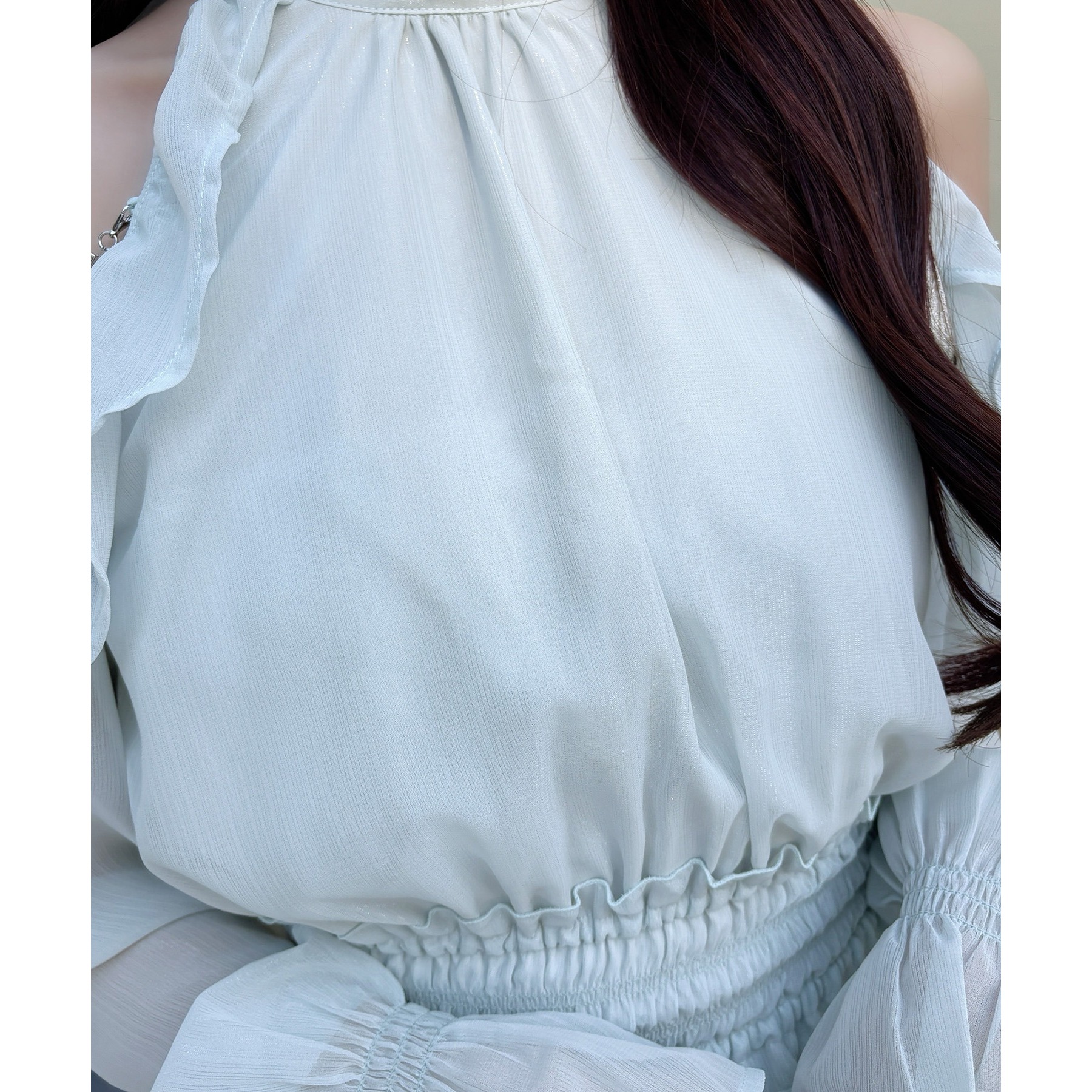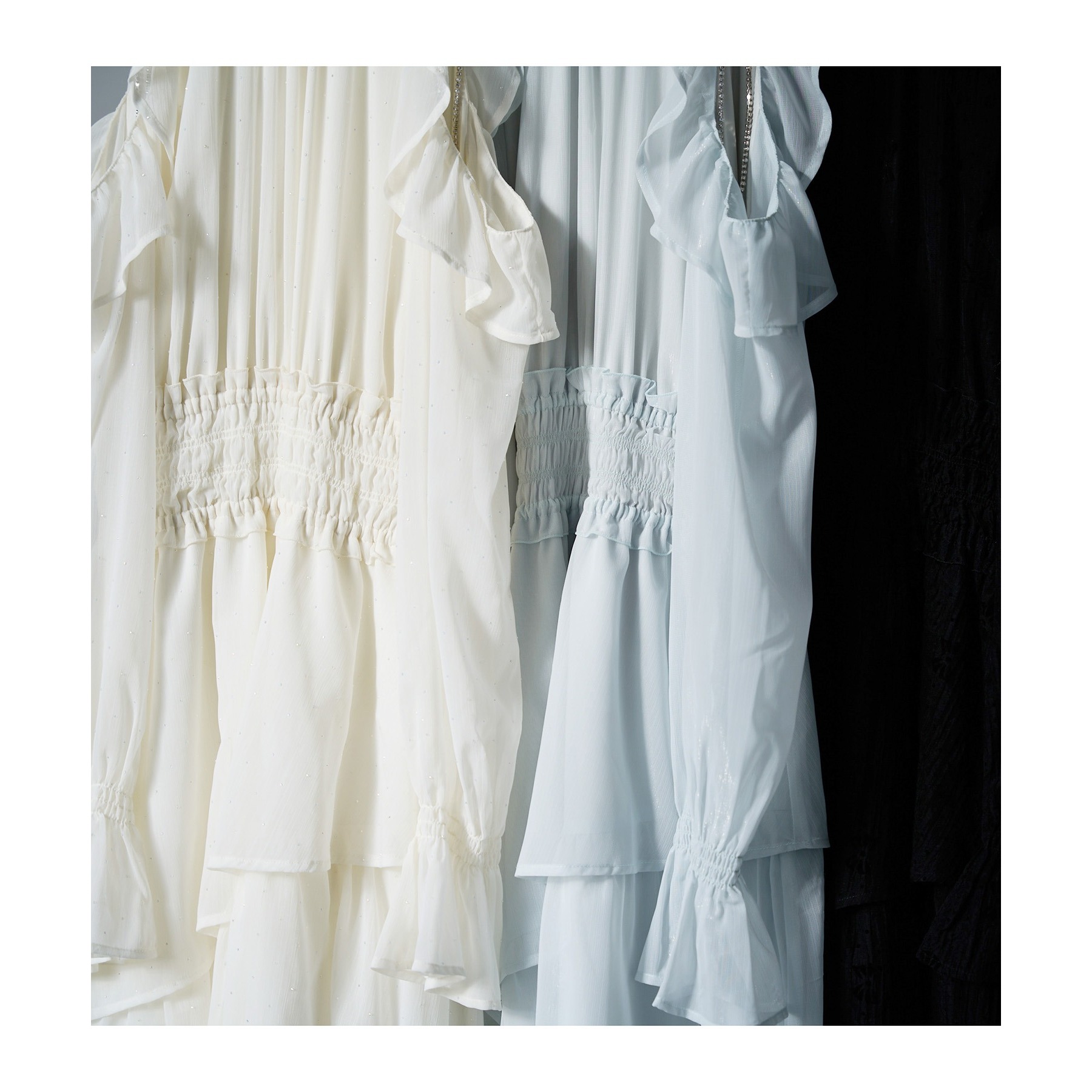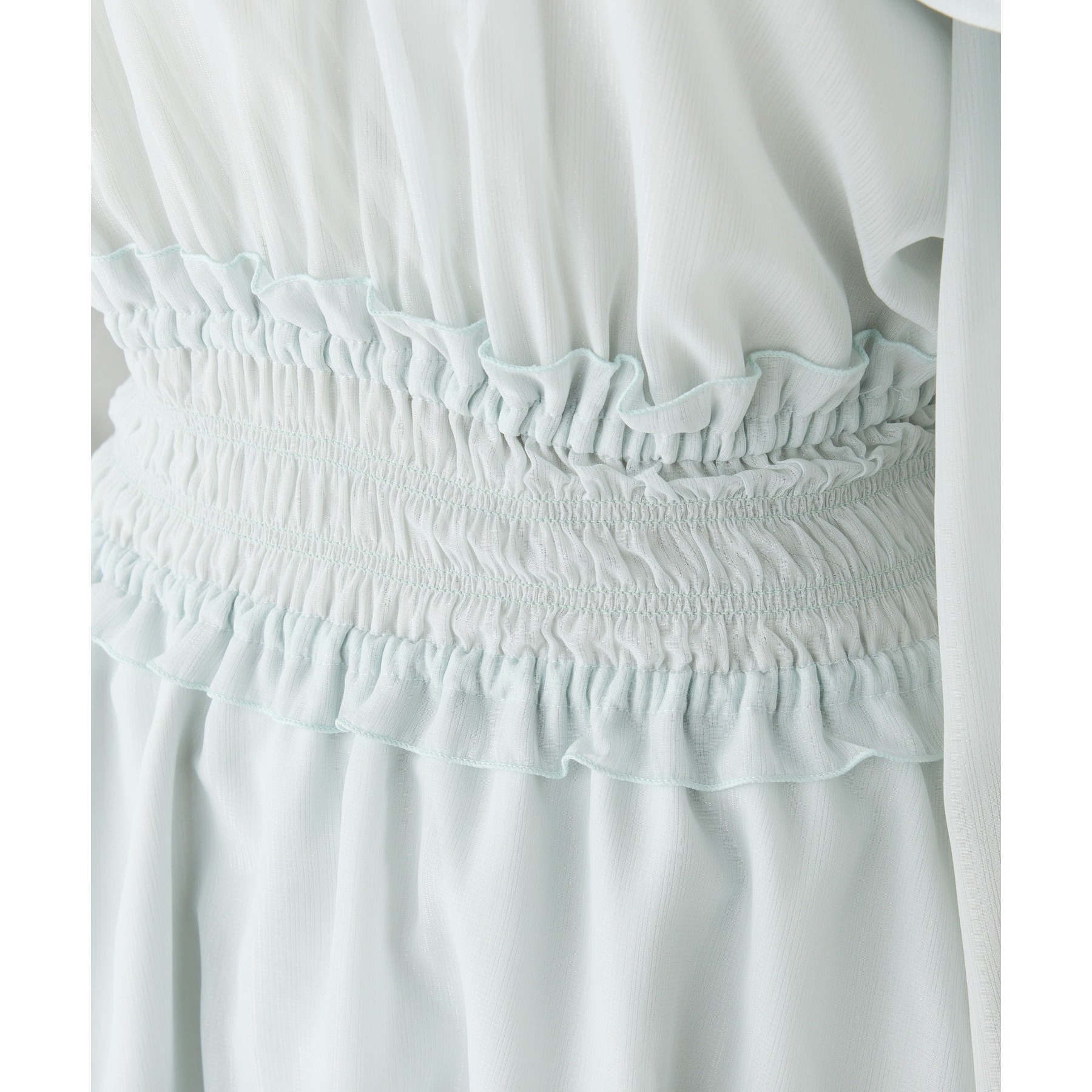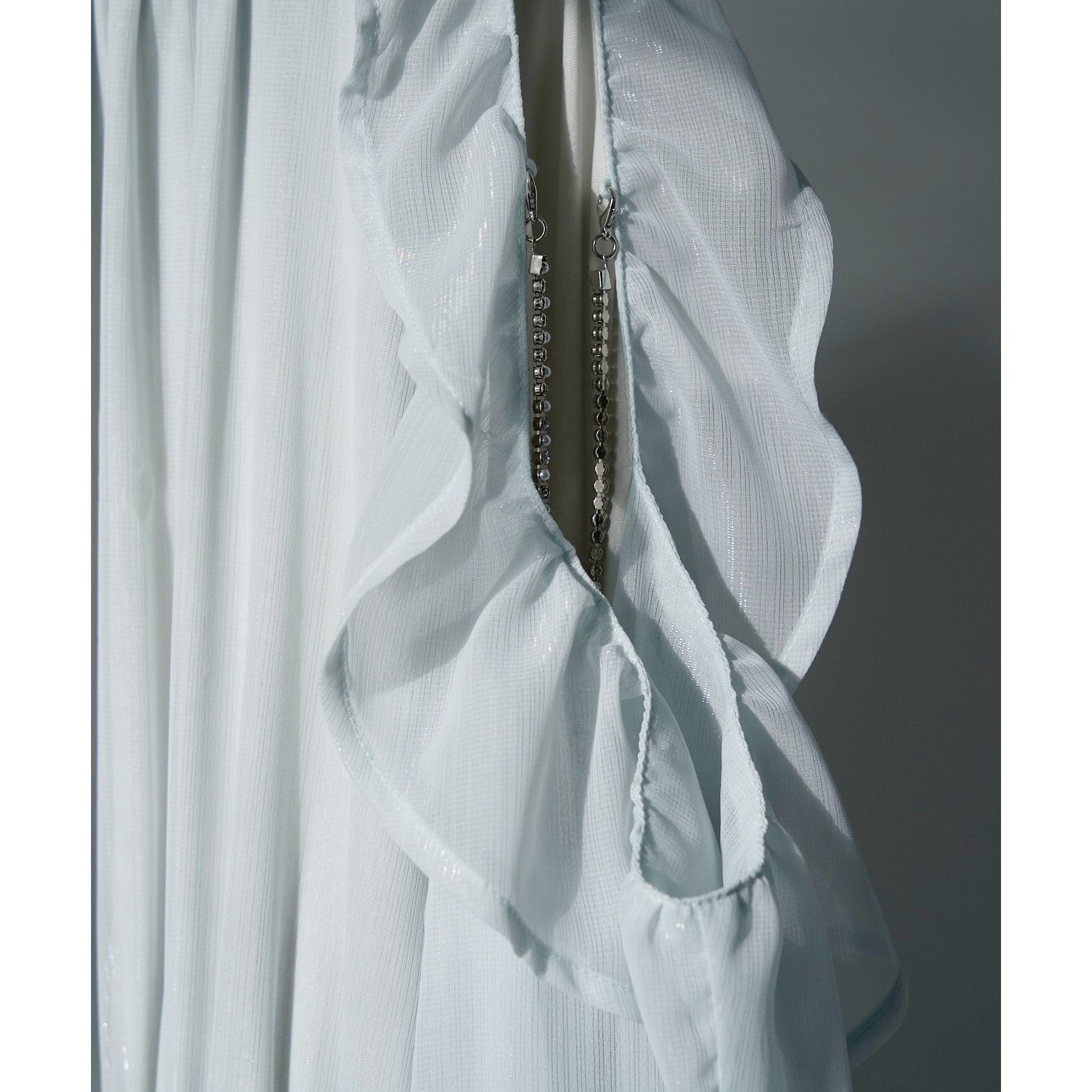 アメスリデザインで肩にはビジューが施され、女性らしさを引き立ててくれる1枚。
