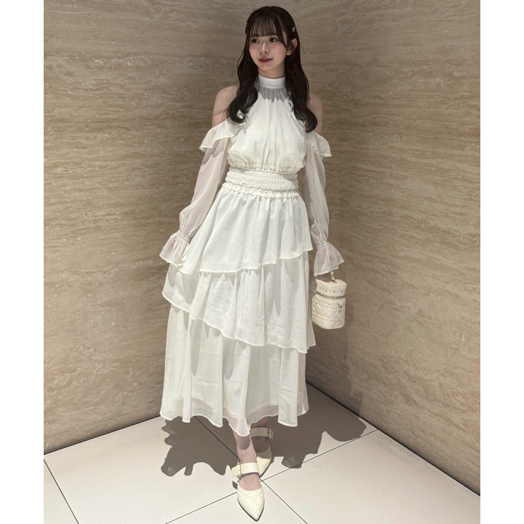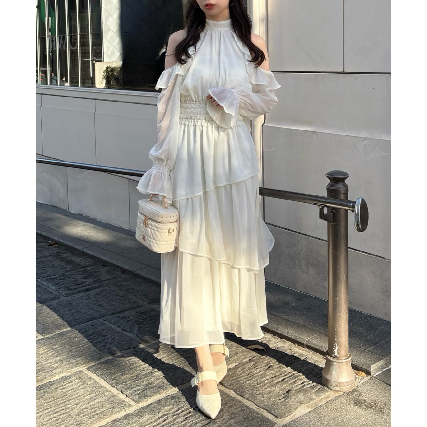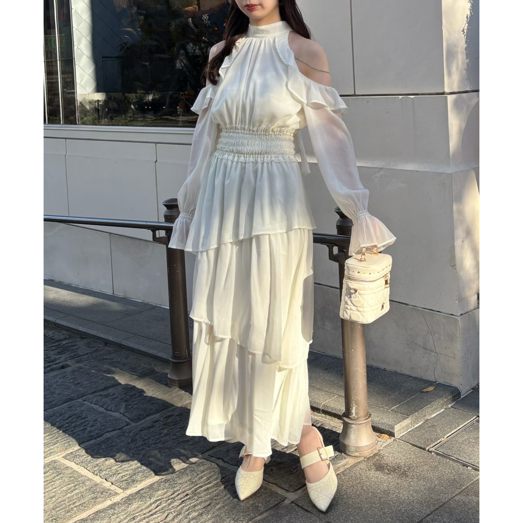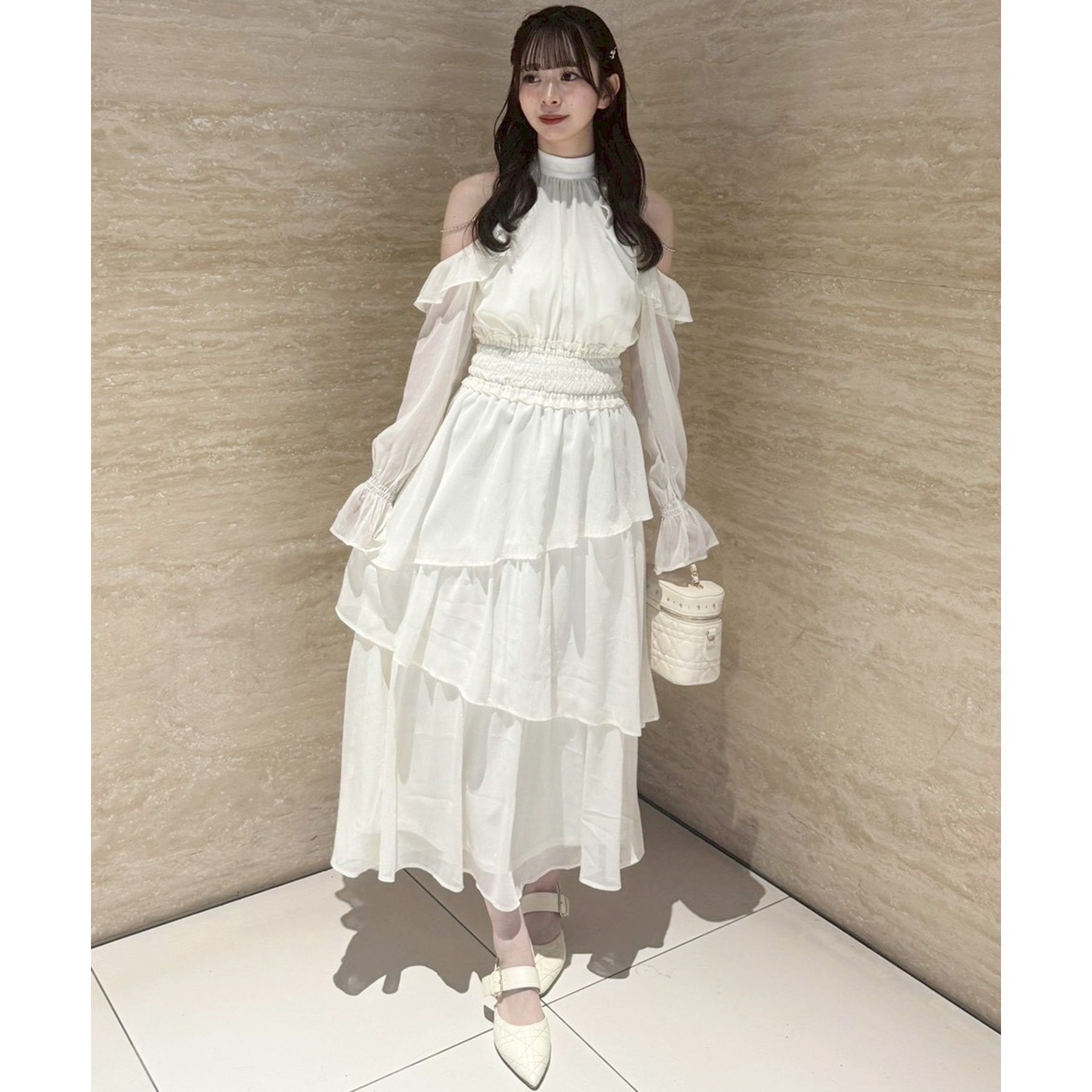 小さめショルダーバッグを添えると、よりフェミニンな雰囲気に仕上がります。