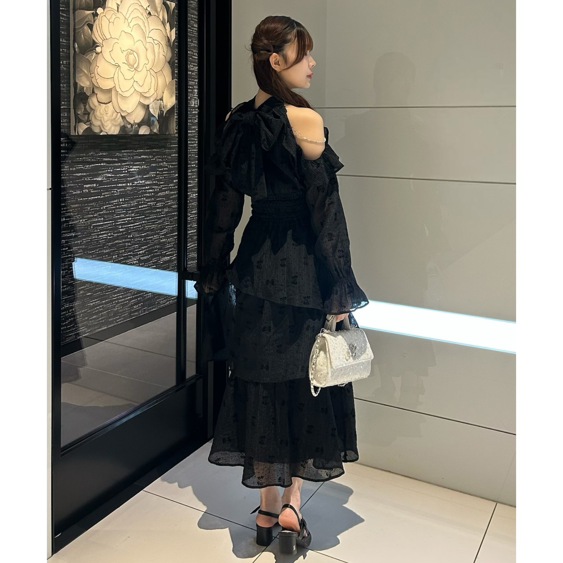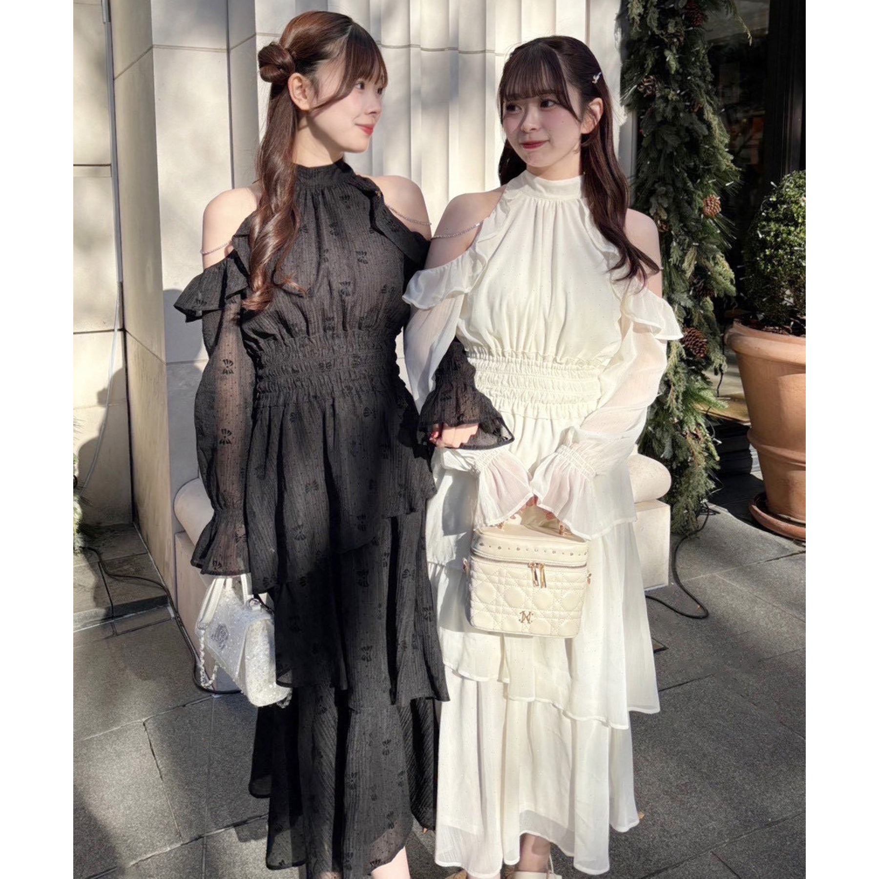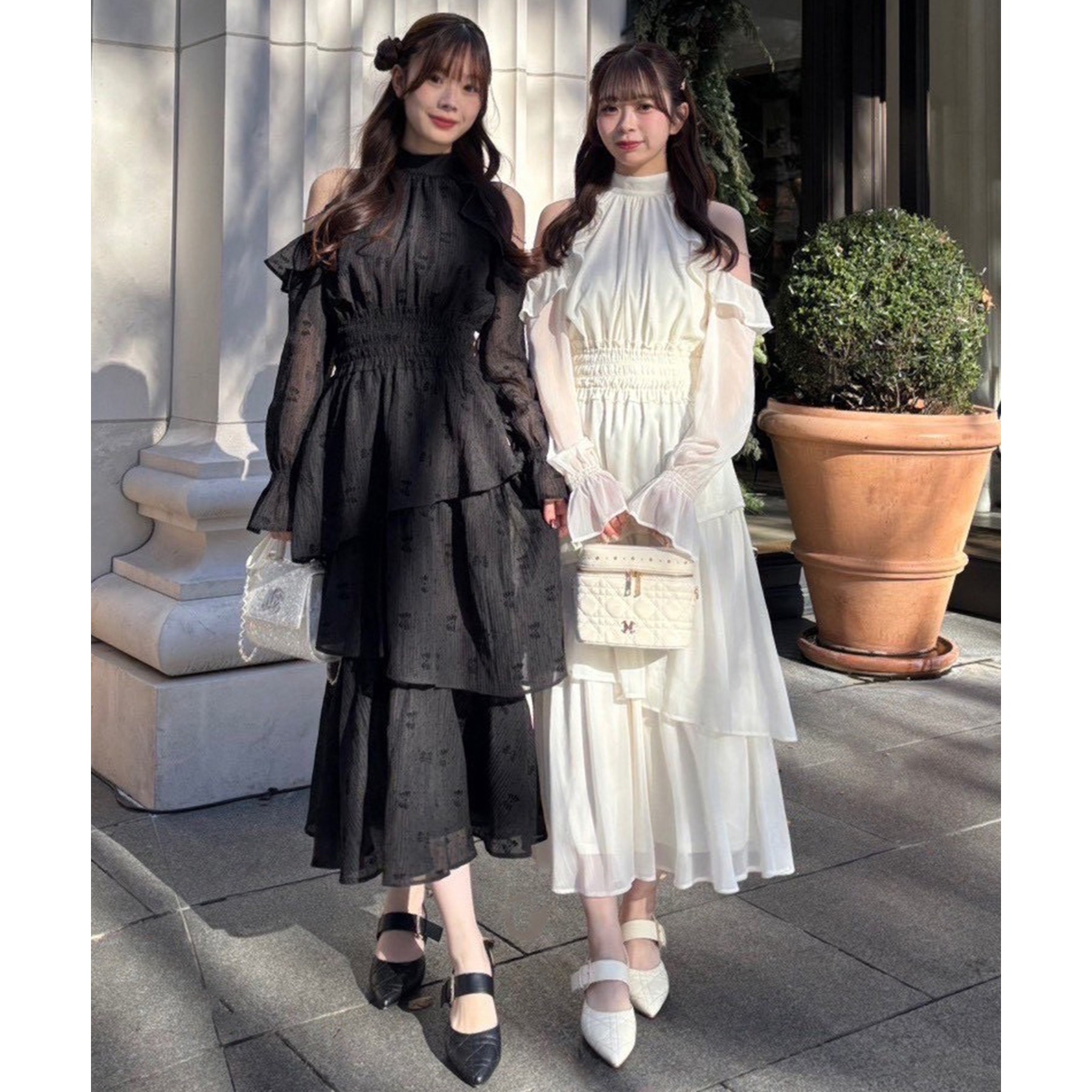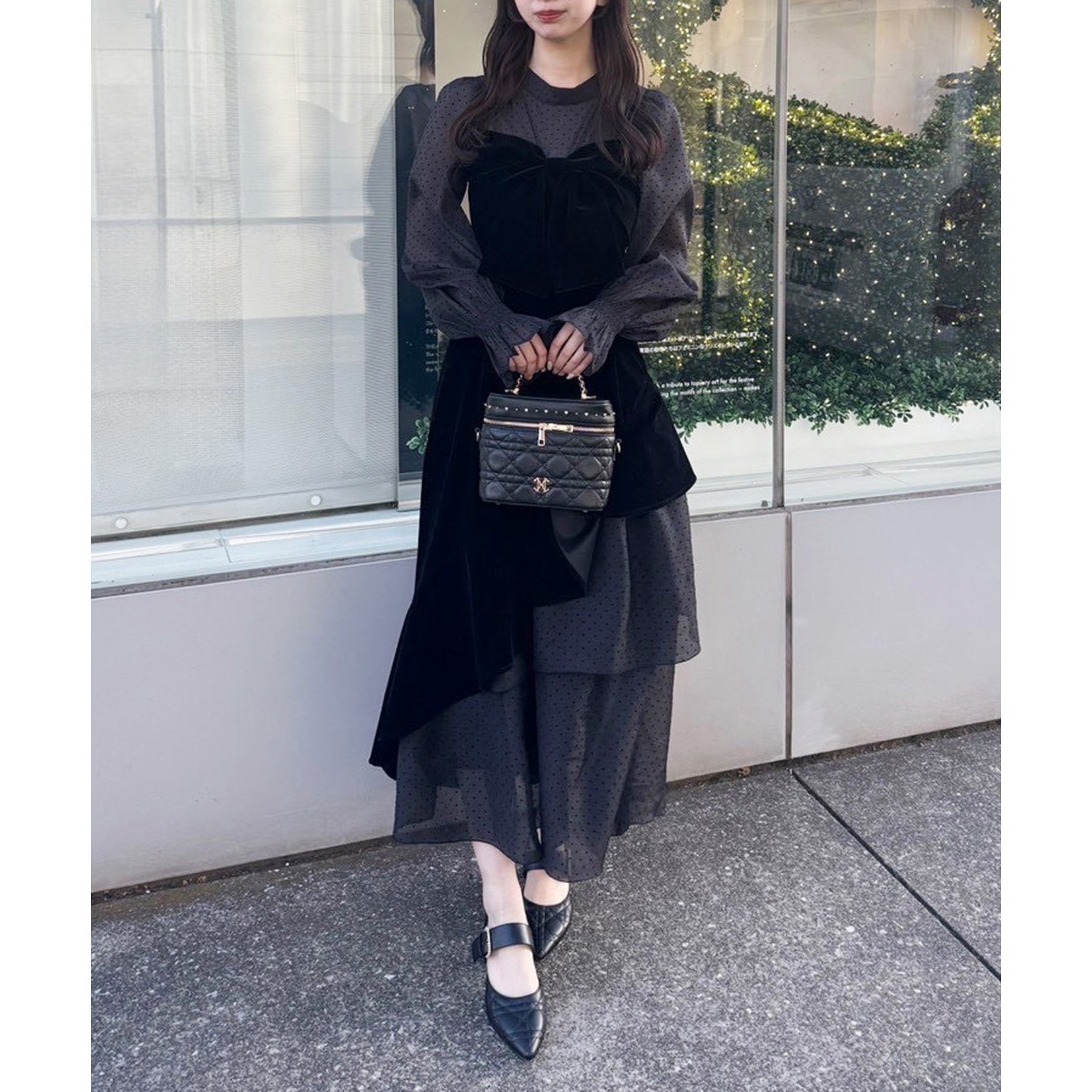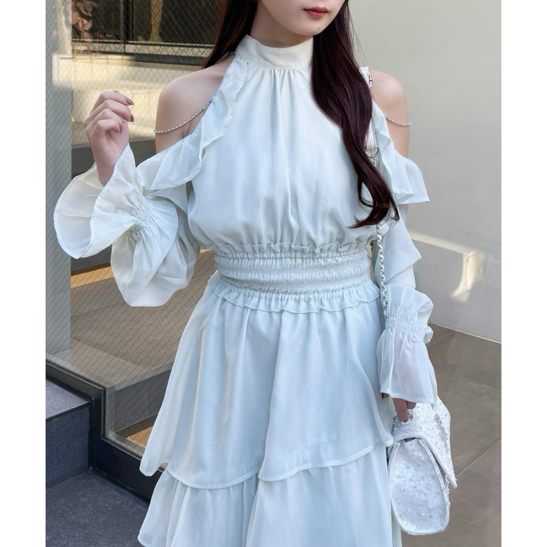 小さめショルダーバッグを添えると、よりフェミニンな雰囲気に仕上がります。