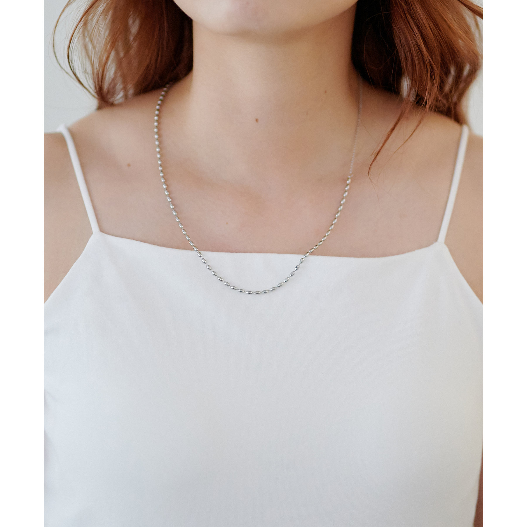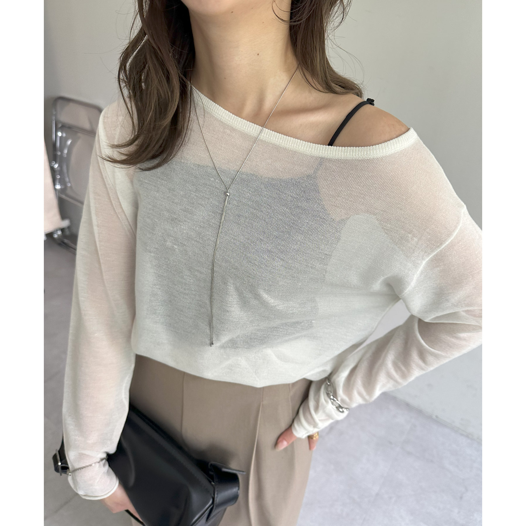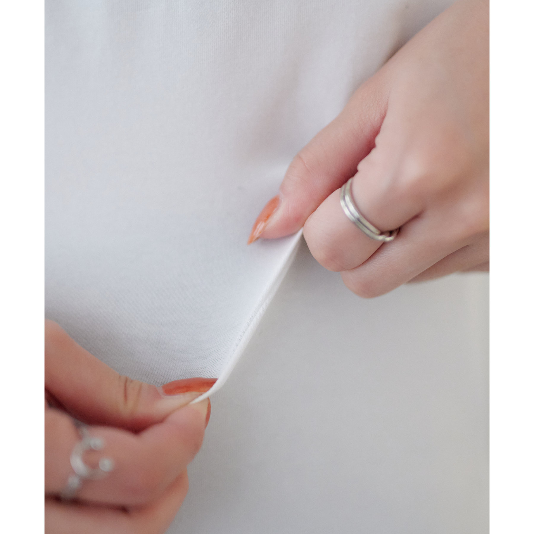 155cmスタッフ(Mサイズ着用):スクエアネックがデコルテをきれいに見せてくれて、ネックレスとの相性も◎胸元も開きすぎず、安心して1枚で着られます。