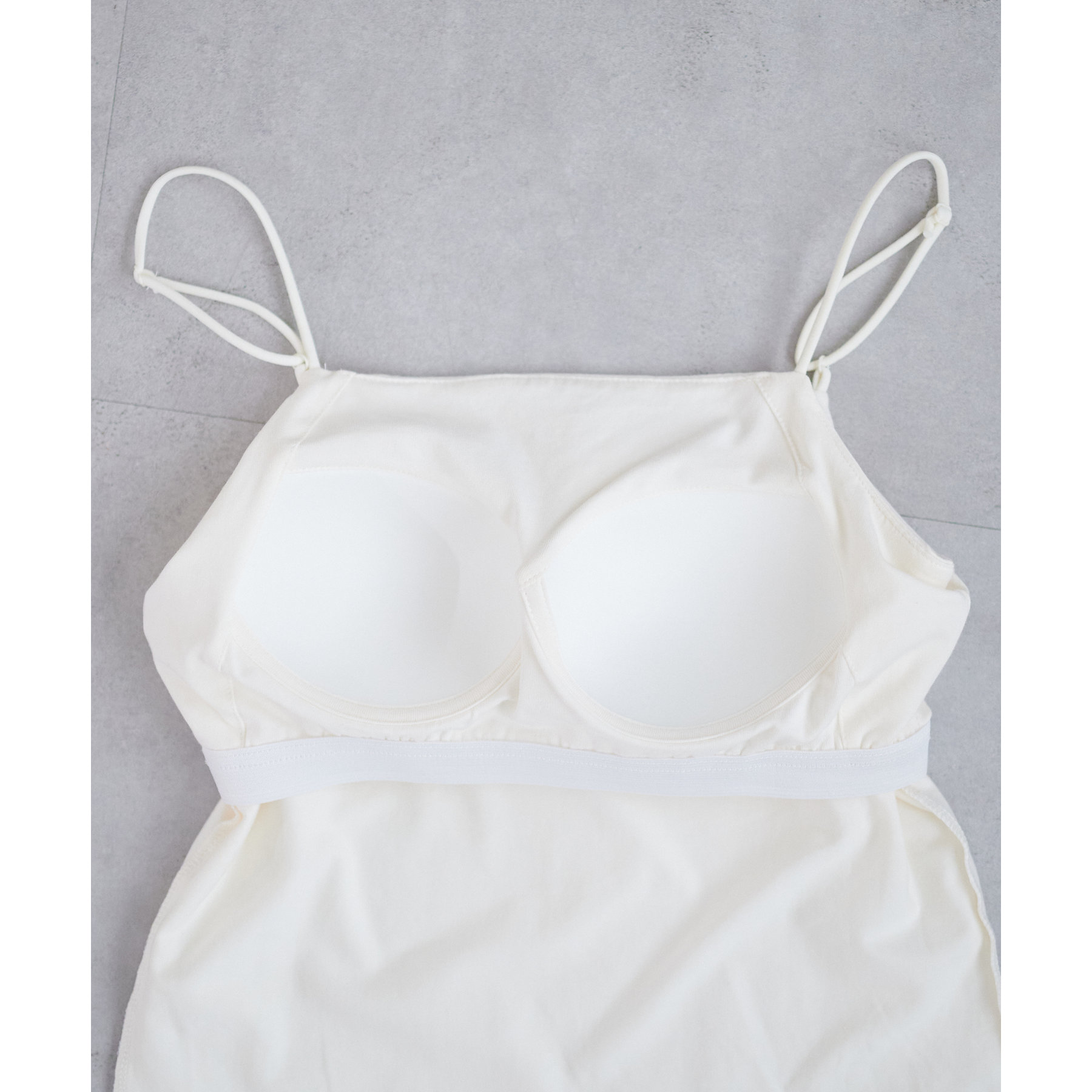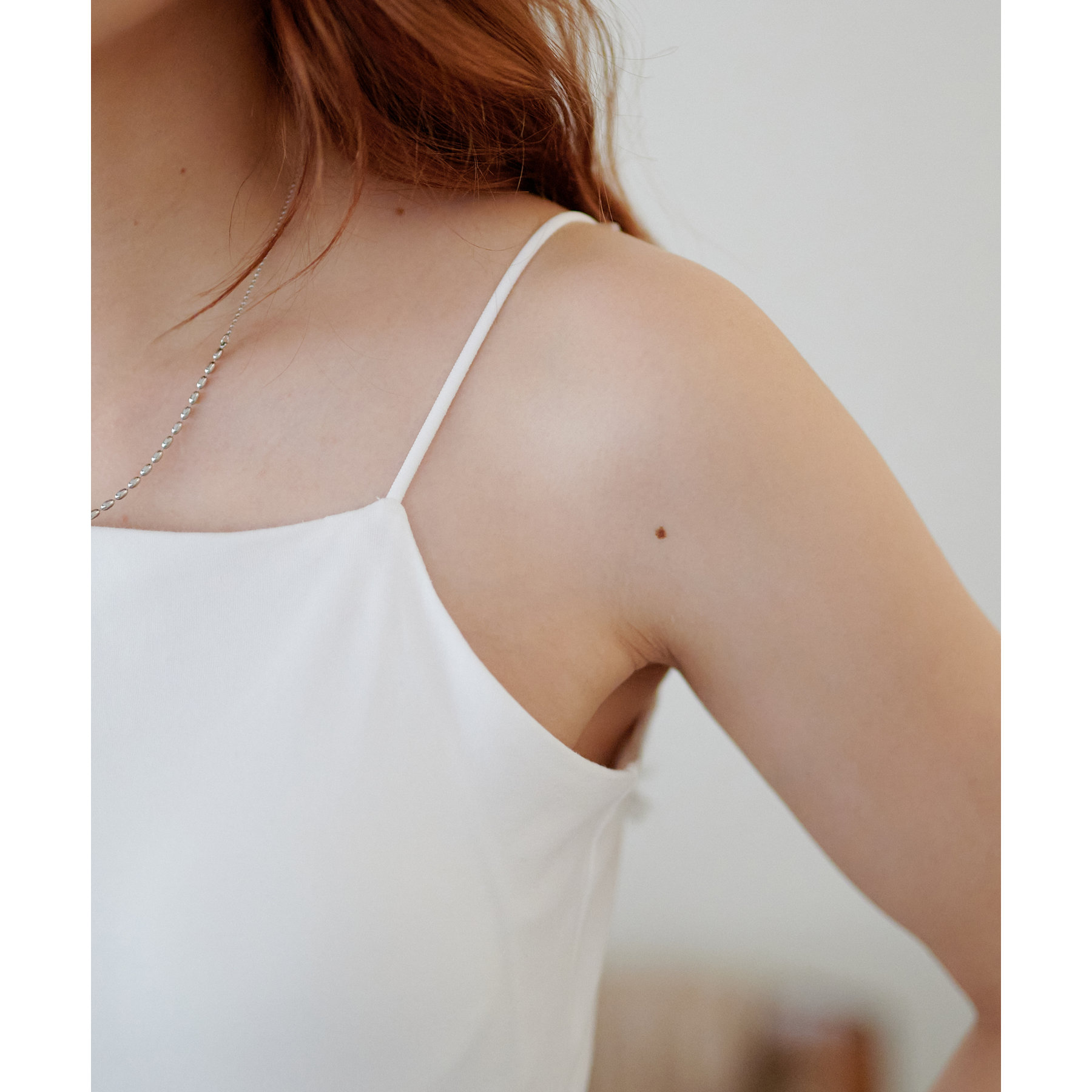 細めのストラップやスクエアネックのラインがデコルテを美しく見せてくれます。背中側はやや丸みを帯びたカーブデザインで、ヘルシーな肌見せが叶い、抜け感を演出。