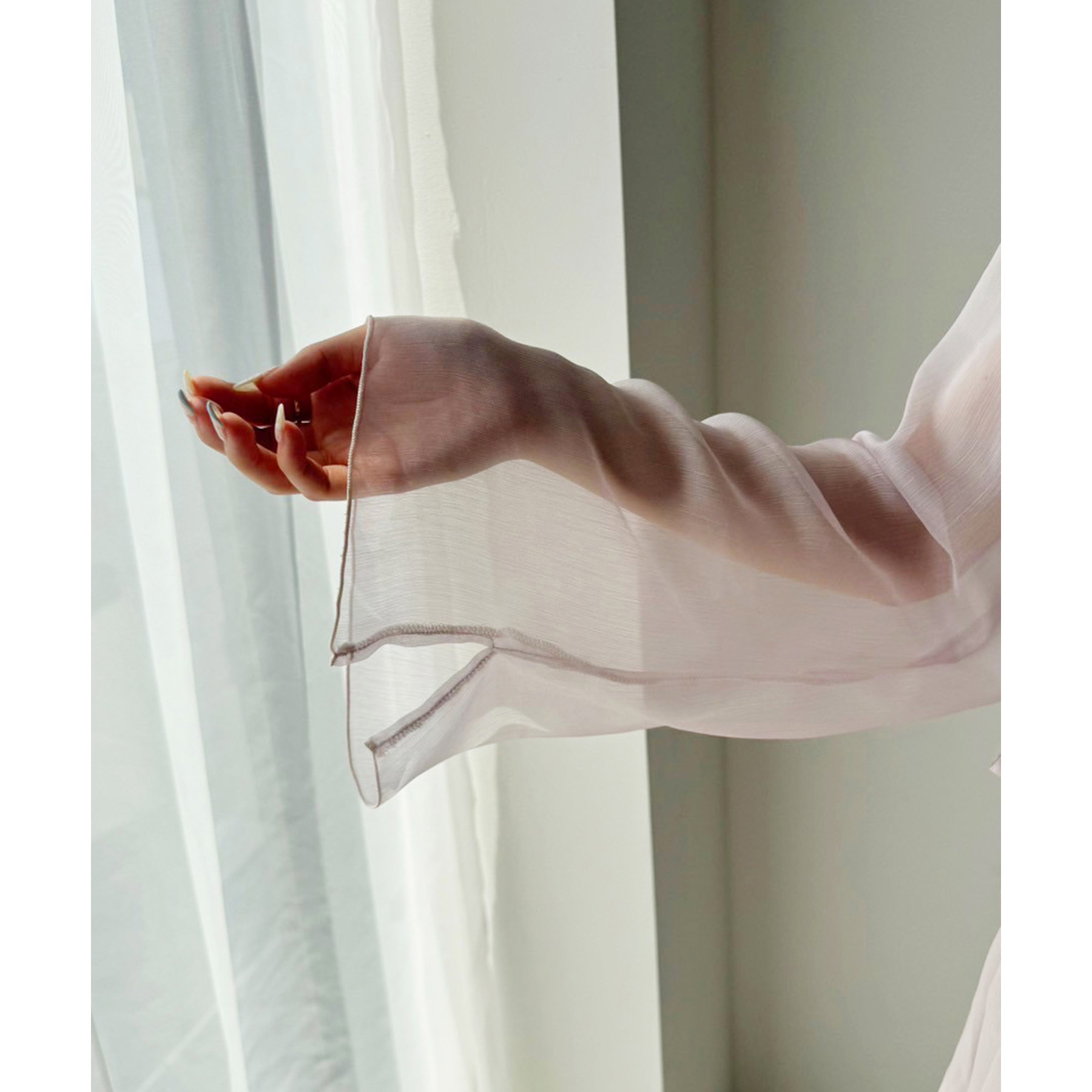 袖口にあしらわれたスリット入りのベルスリーブが、女性らしい雰囲気を演出します。