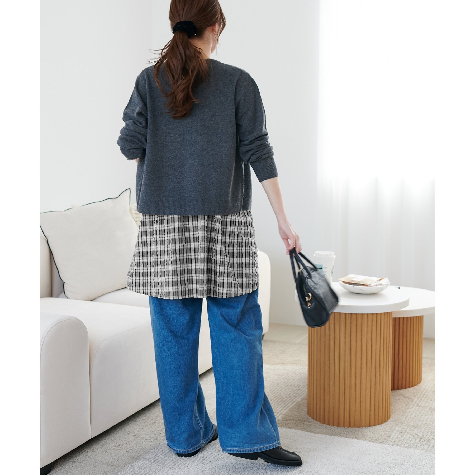 細身のパンツやデニムと合わせてバランス良く着こなせます。