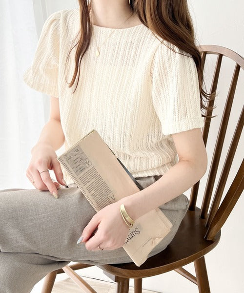 ラッセルレース素材と大きくとった袖のタックがクラシックな印象の1枚。