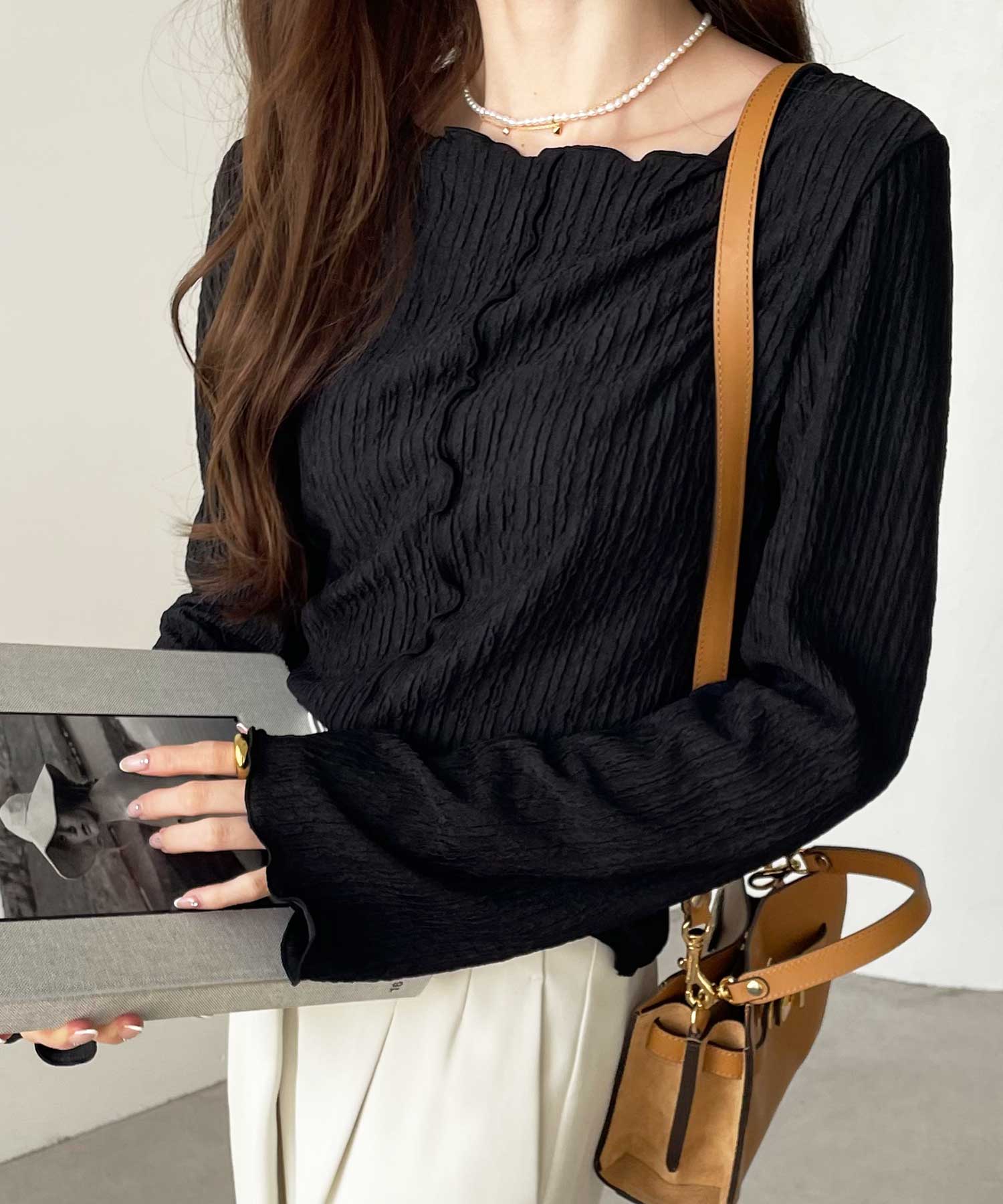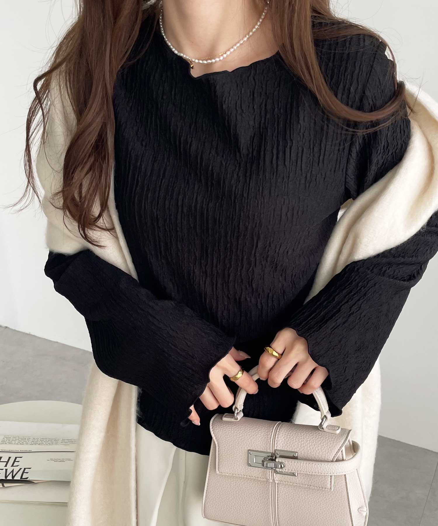 程よい光沢感のあるジャカード素材が着映えるトップス。