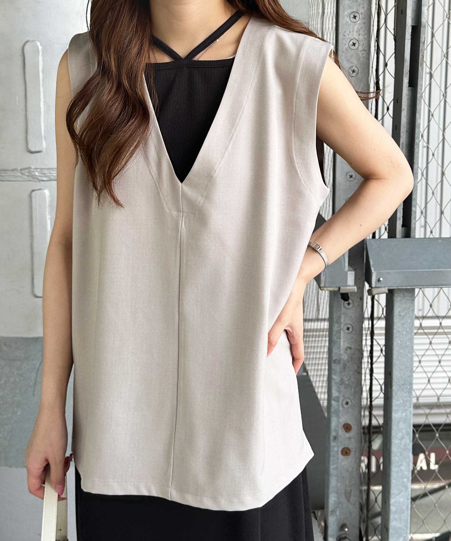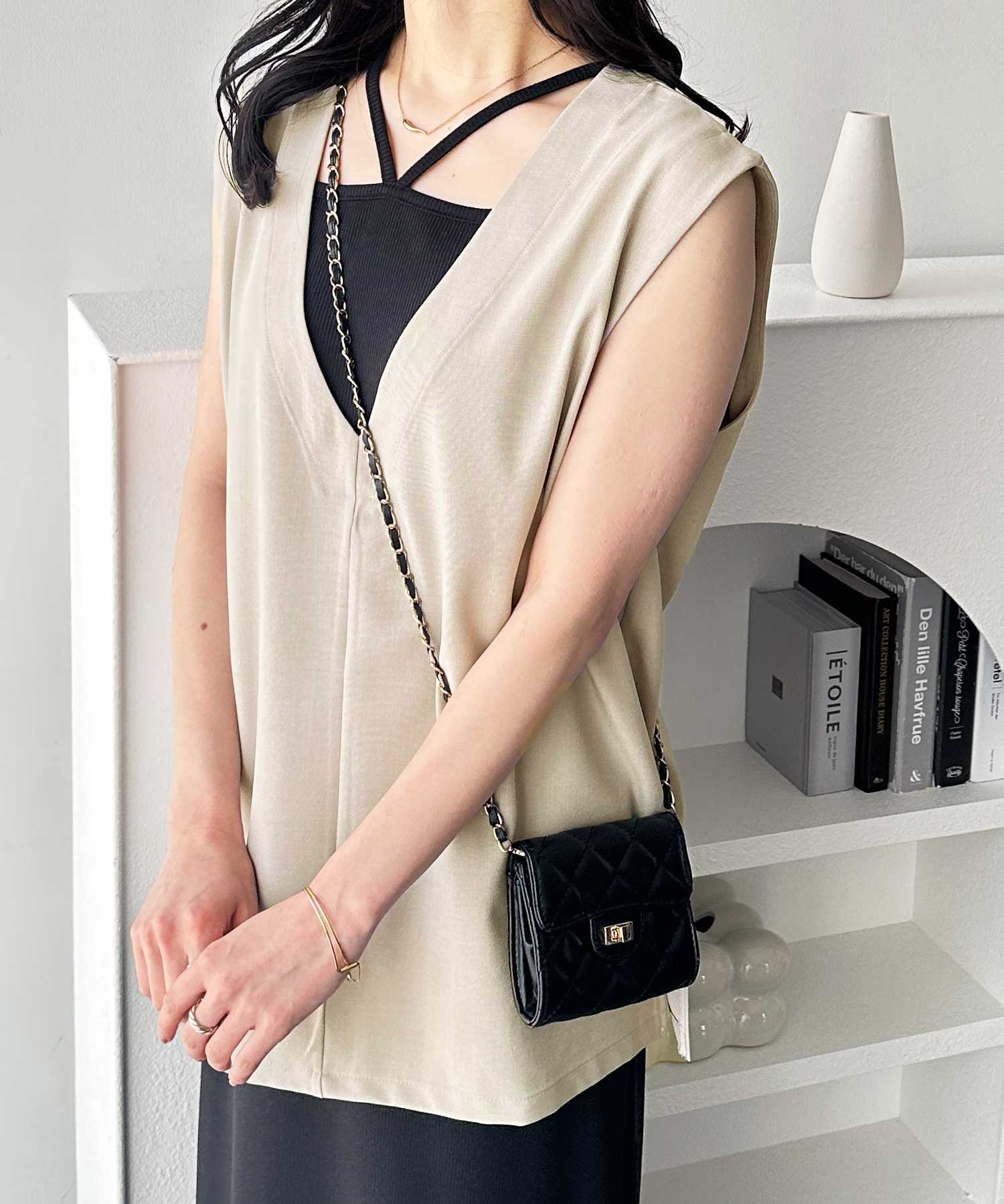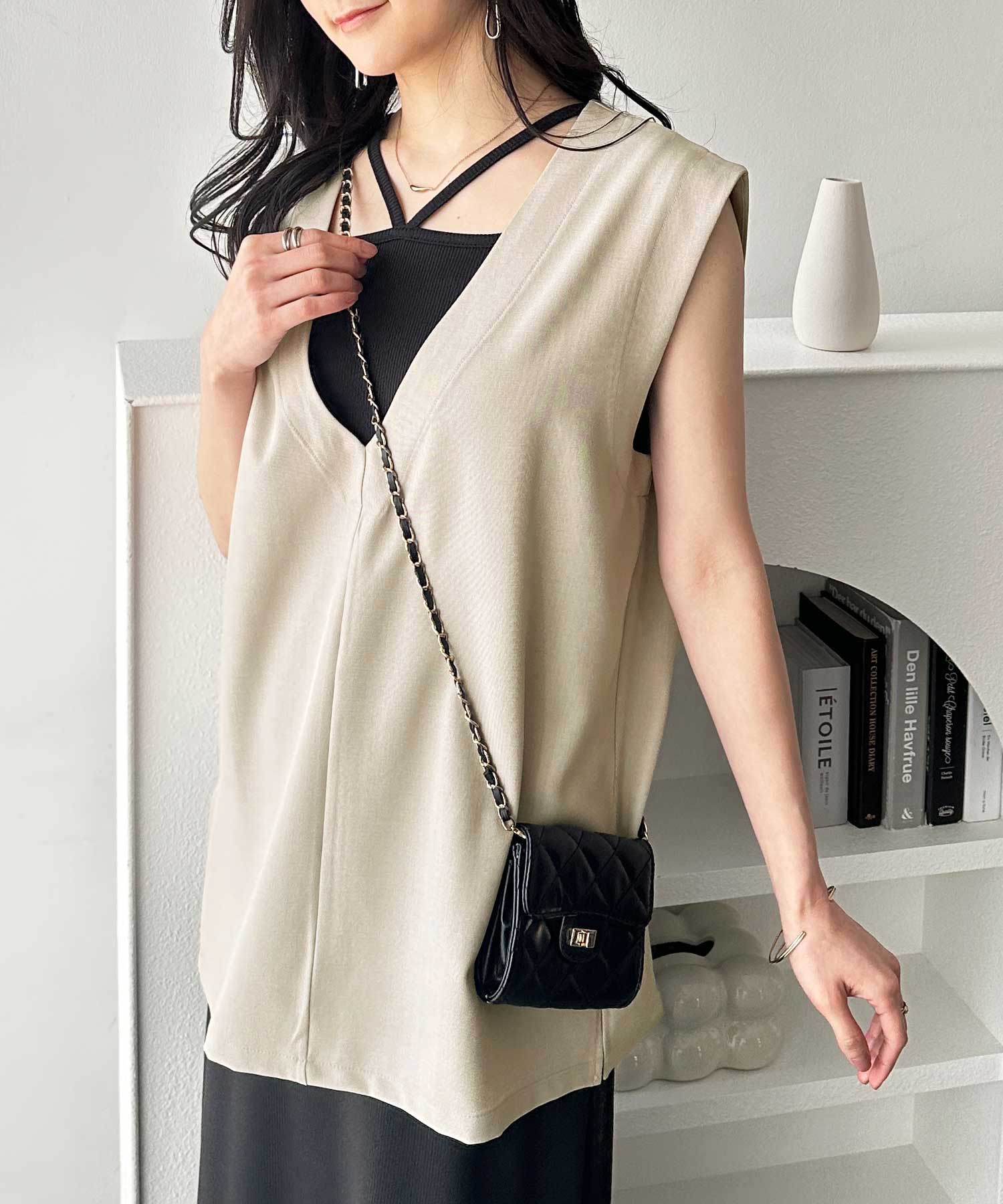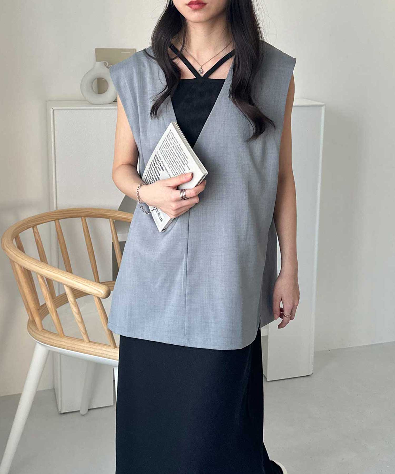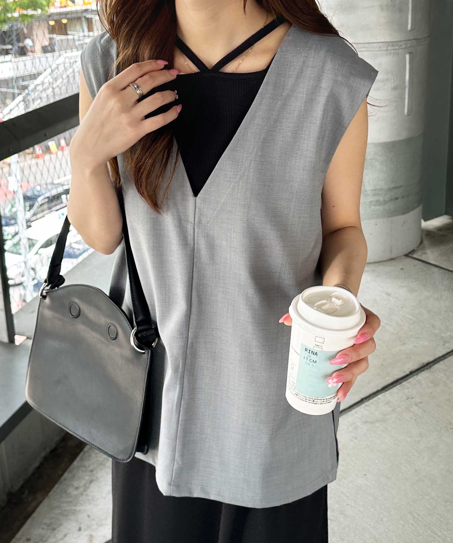 ベストをキャミソールと合わせた肌見せスタイルで、トレンドコーデを楽しんでいただけます。
