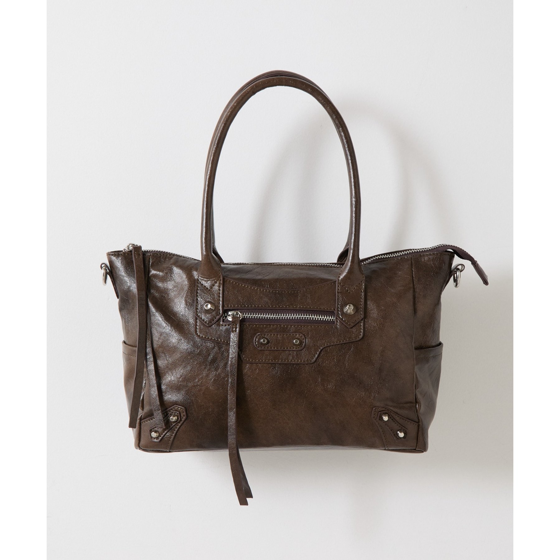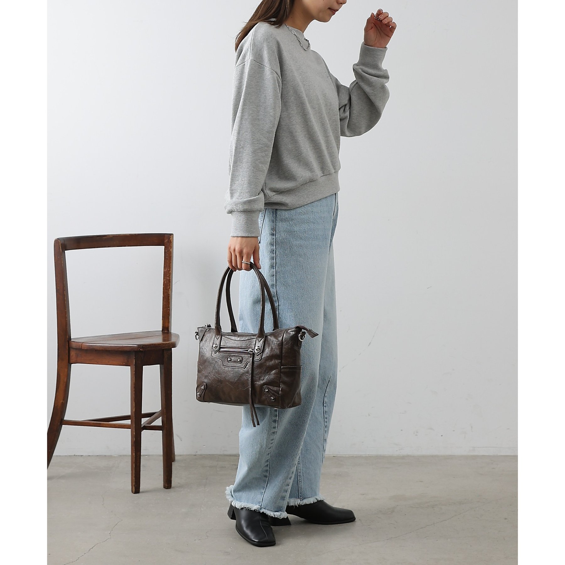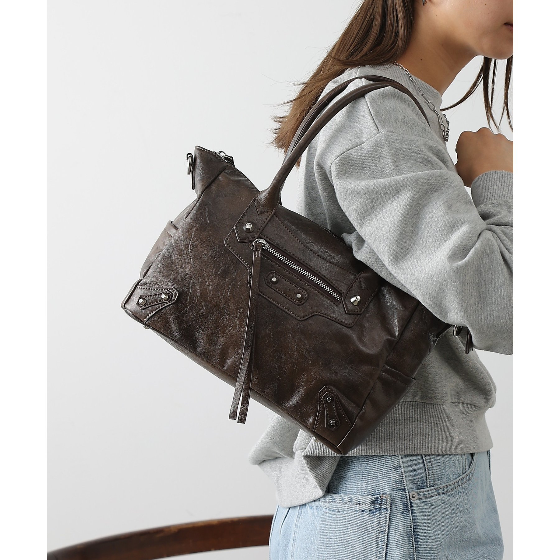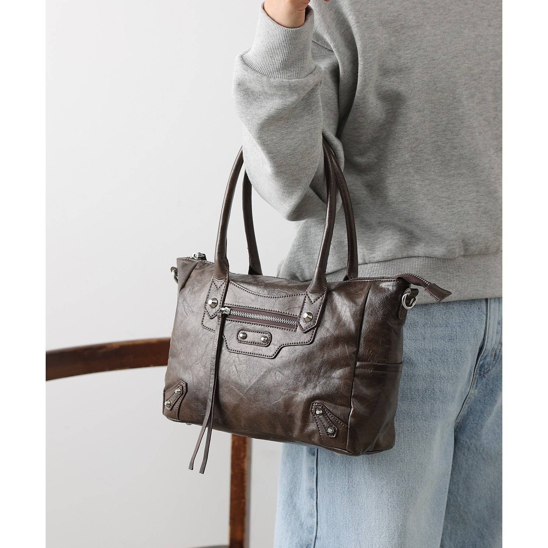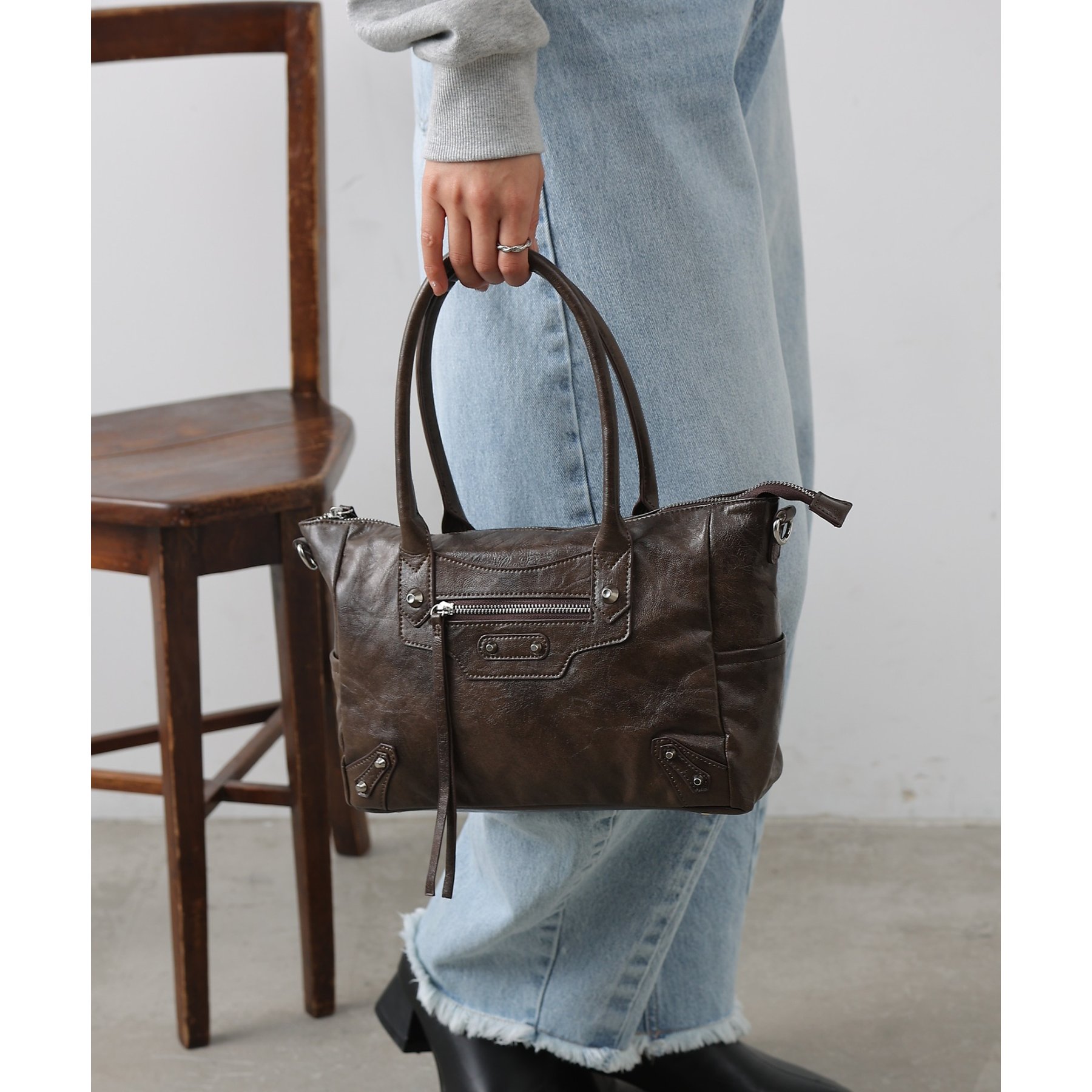 ヴィンテージライクな風合いとさりげないスタッズデザインが魅力のハンドバッグです。