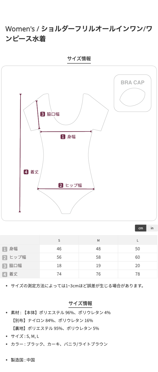 【L】カップ:C-E推奨、トップスバスト:100、インナーバスト:74、トップスヒップ:120、インナーヒップ:78、股下:9、裾幅:45