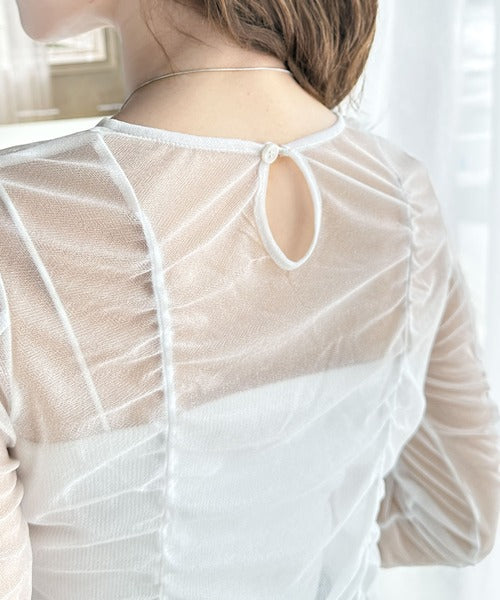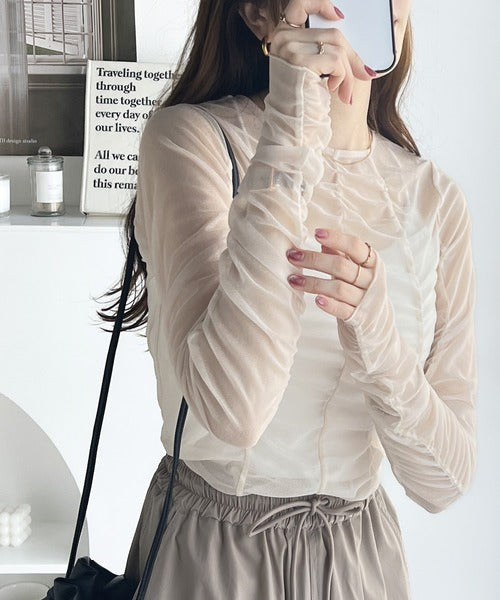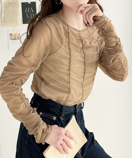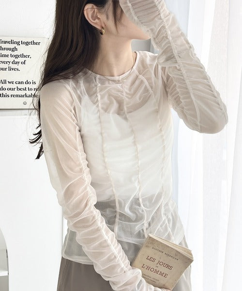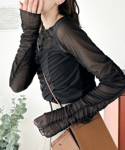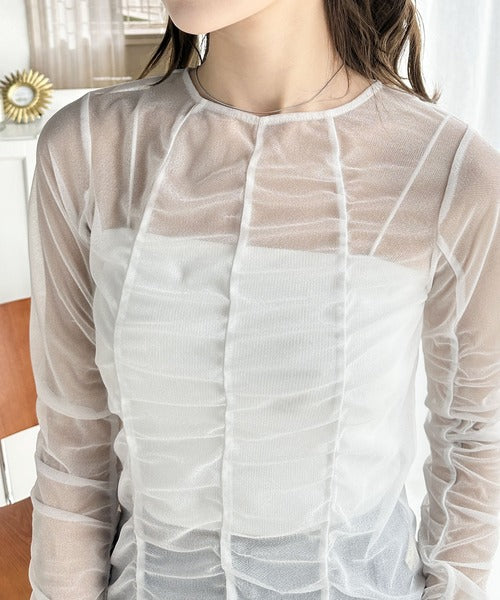 トレンドのチュール素材を採用し、全体にギャザーをあしらった華やかなトップスです。