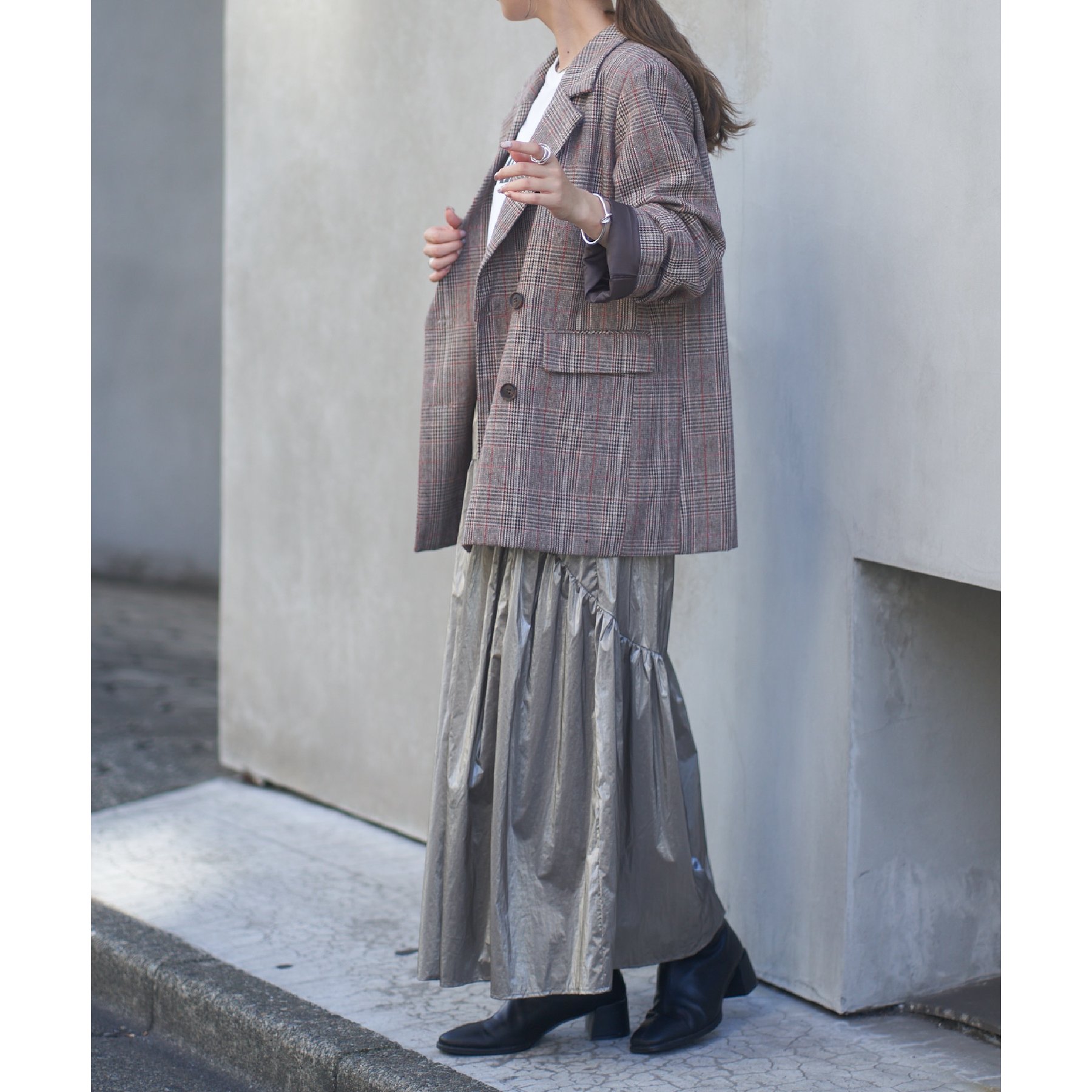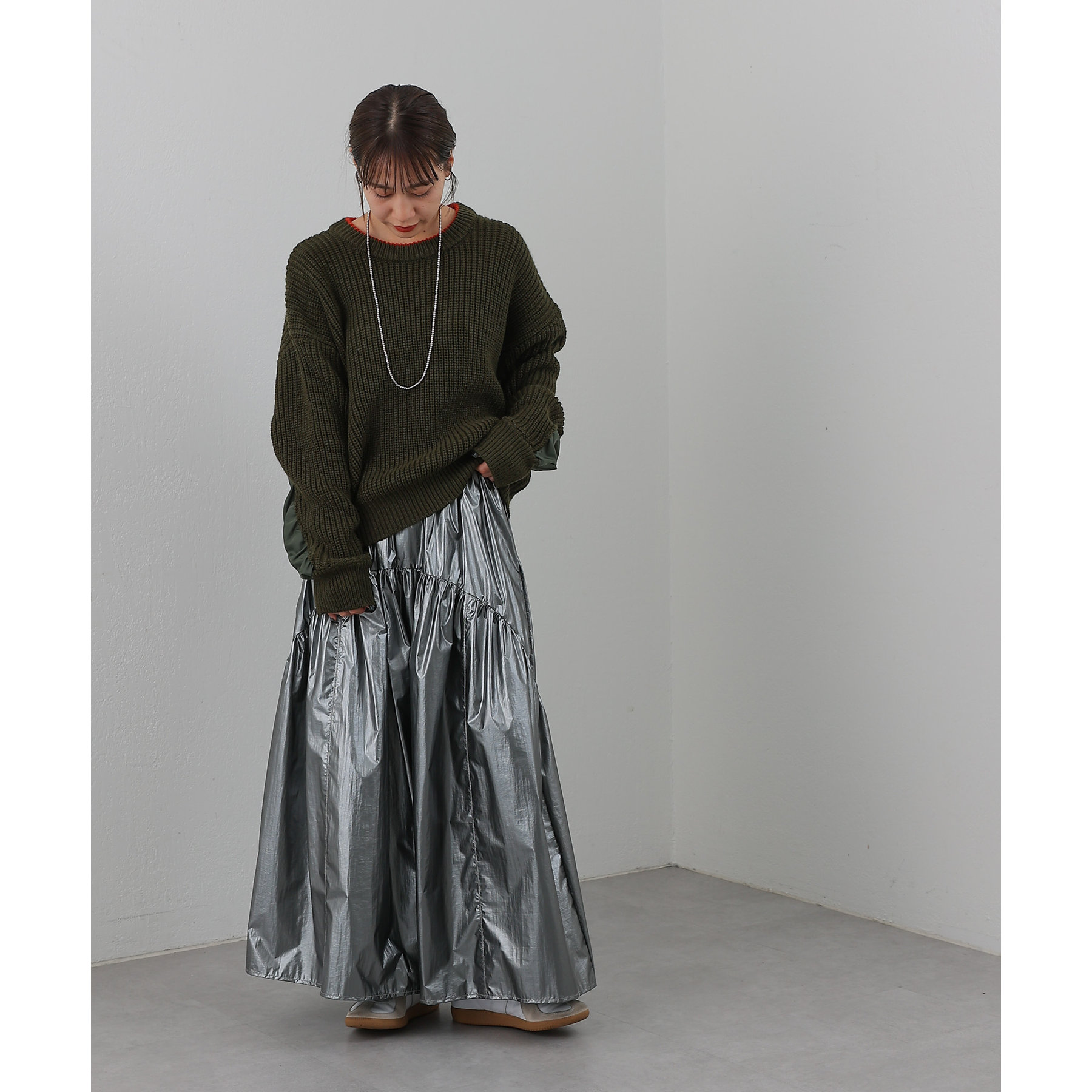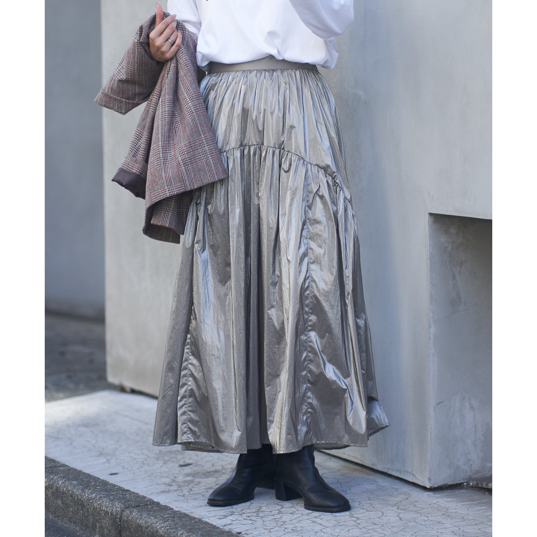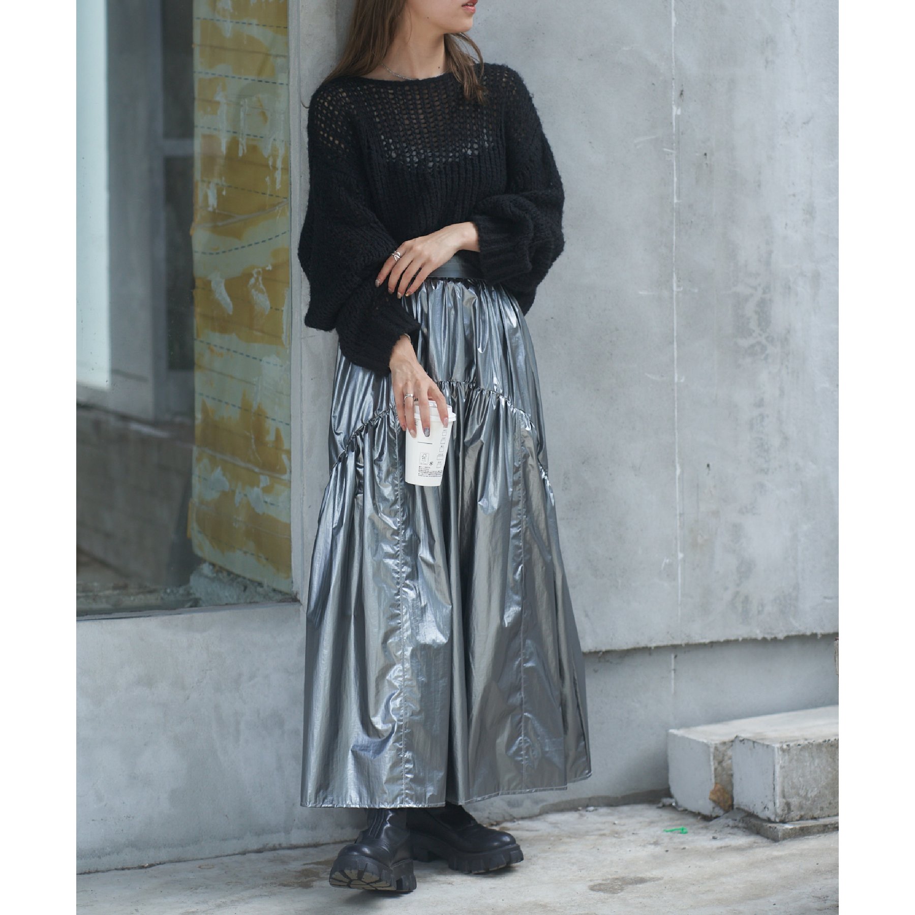 【ラウンドラインがポイントのメタリックスカート】