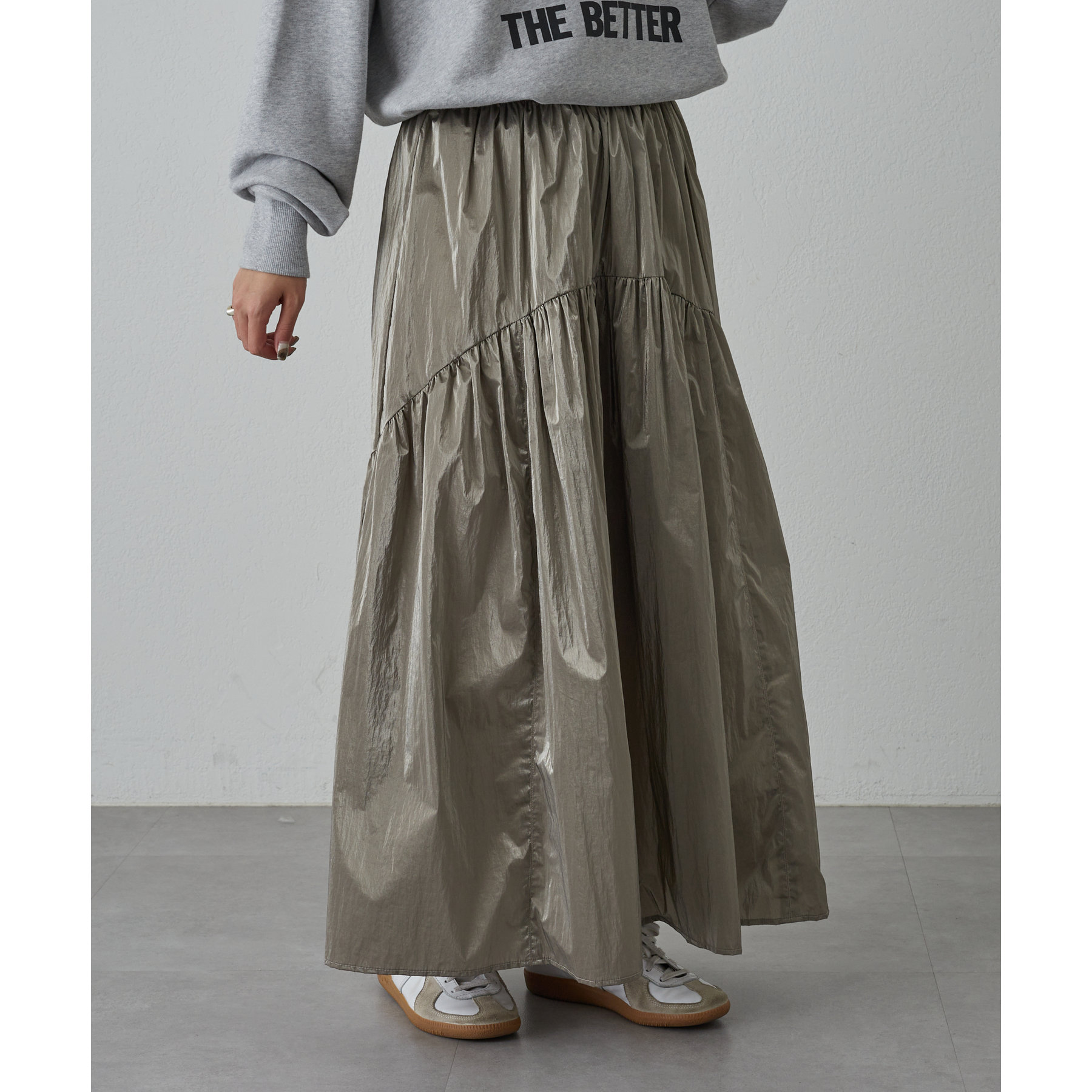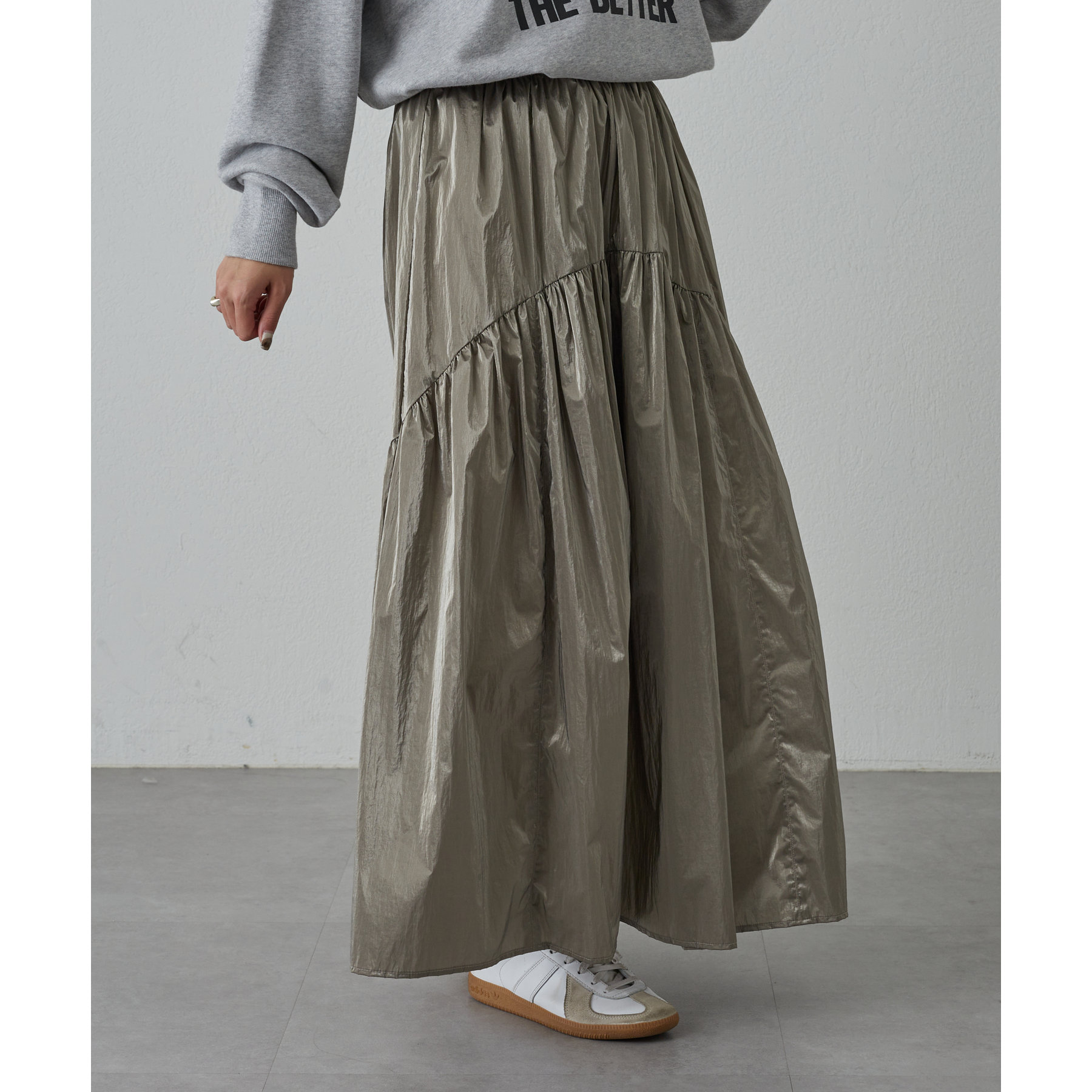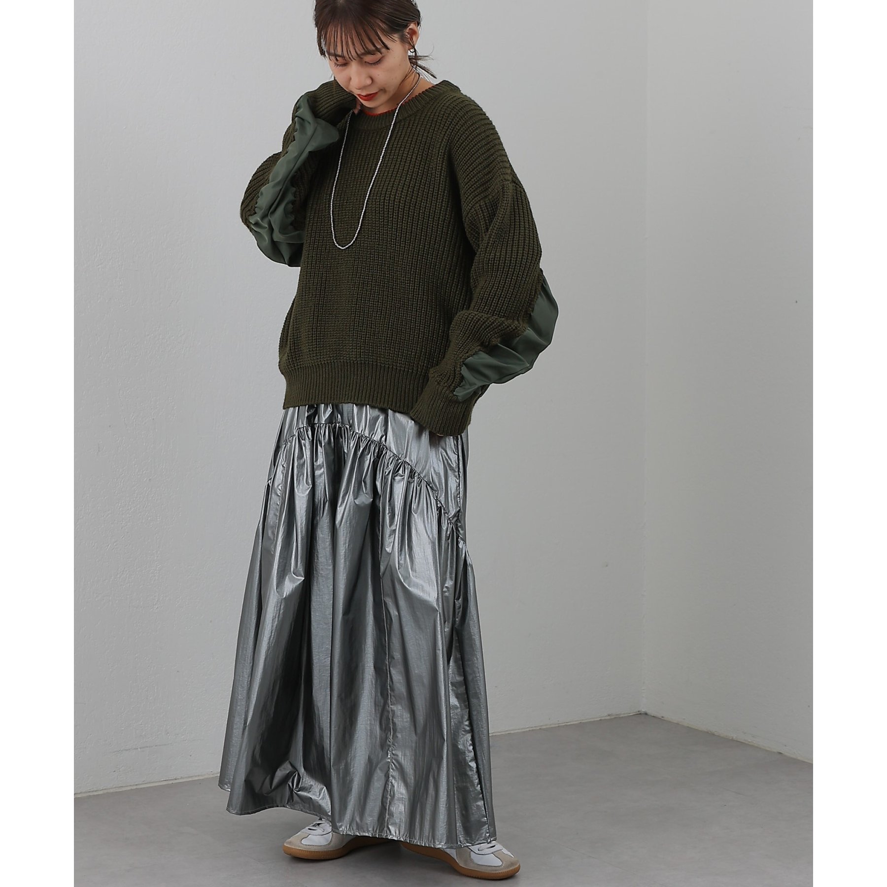 今年らしいシャカっとした素材で、スカートで取り入れることでスポーティーすぎず◎