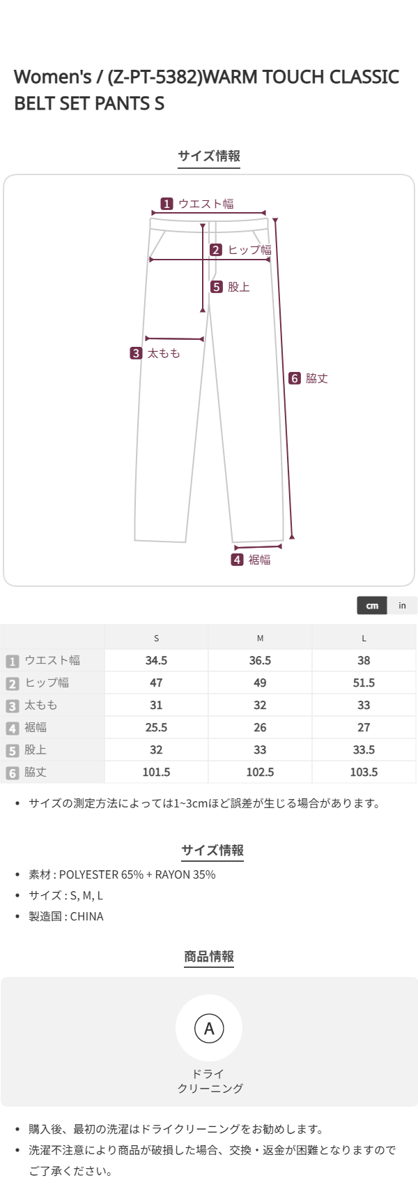(Z-PT-5382)WARM TOUCH CLASSIC BELT SET PANTS S