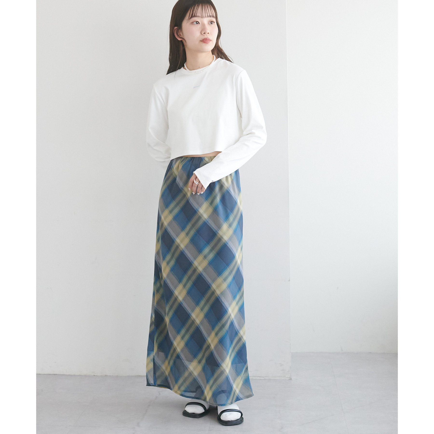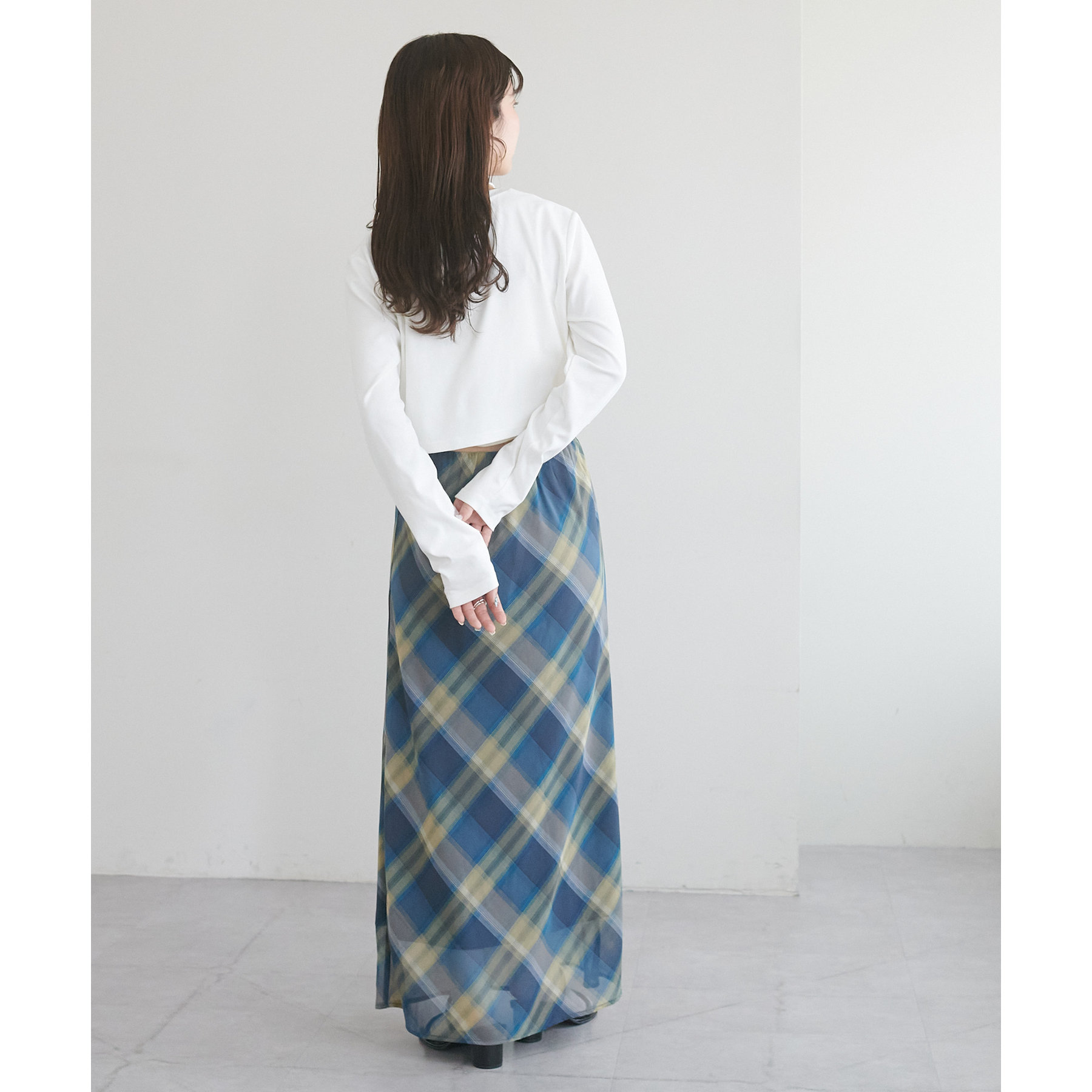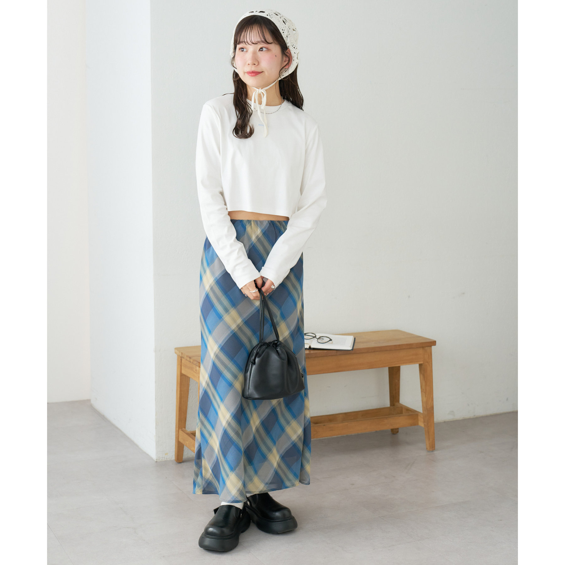 160cmスタッフ(Fサイズ着用):チェックのスカートと合わせて、韓国風に着てみました。