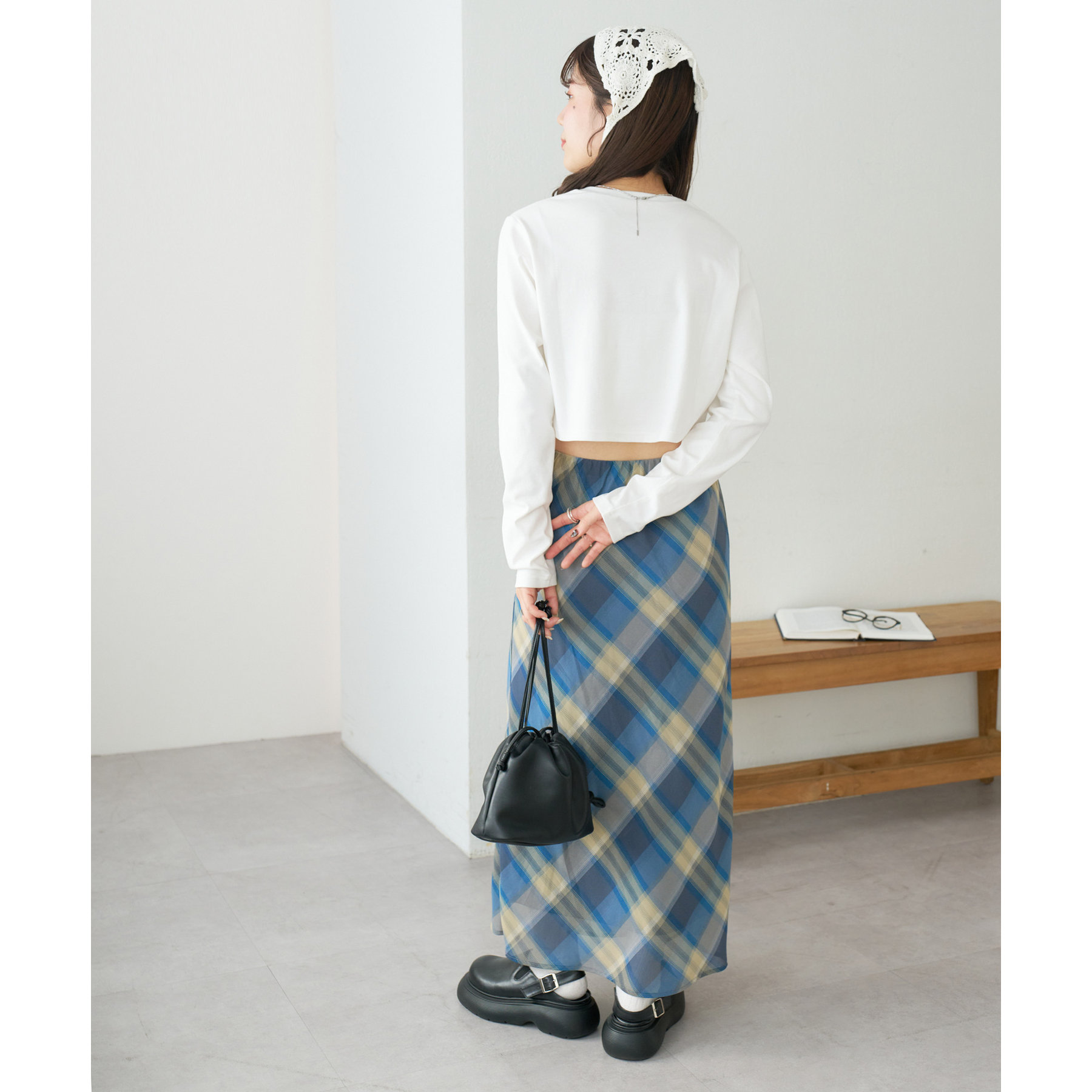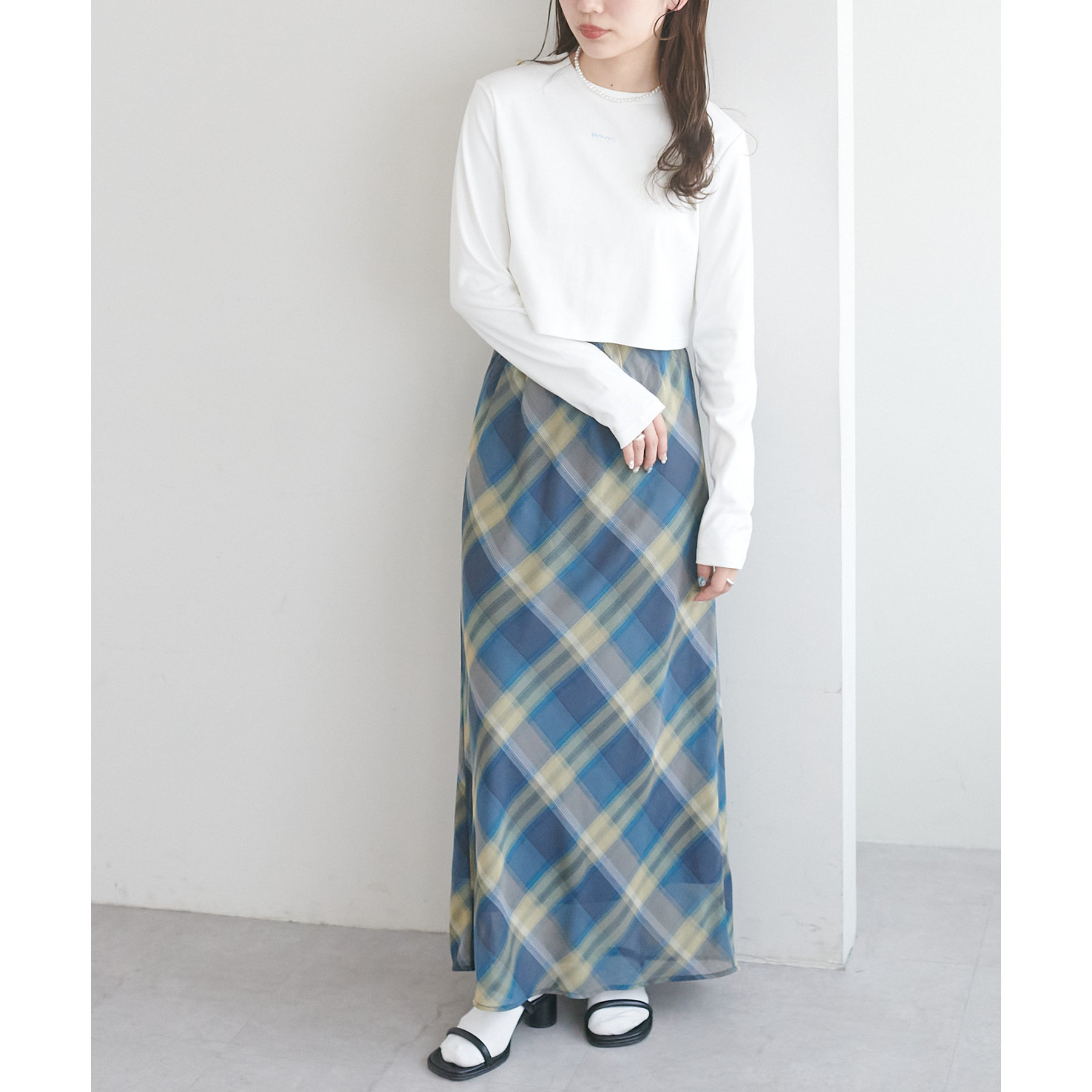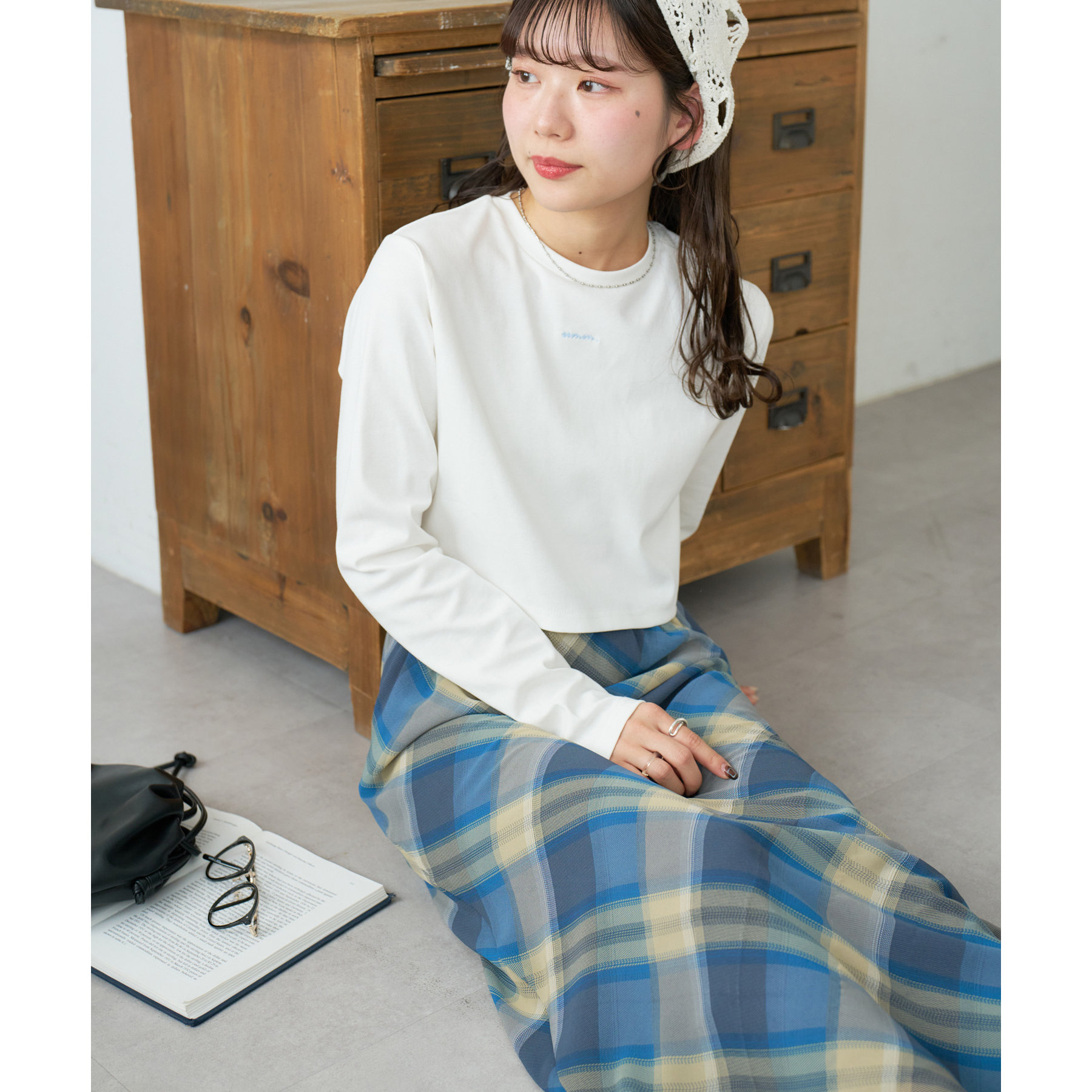 160cmスタッフ(Fサイズ着用):チェックのスカートと合わせて、韓国風に着てみました。