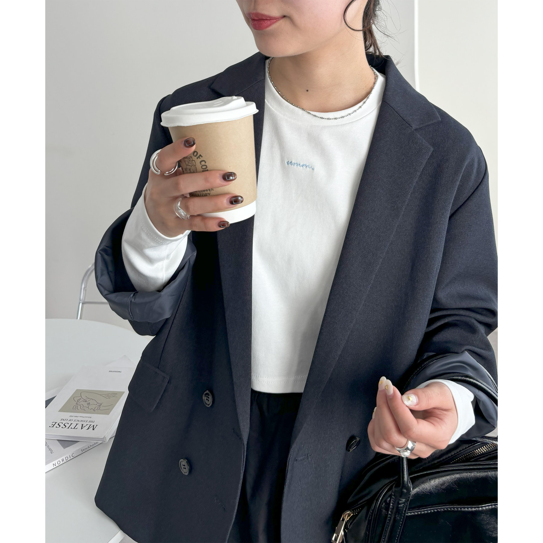 さりげなく胸元に施されたミニマルなロゴが、シンプルながらもこなれた雰囲気を演出。