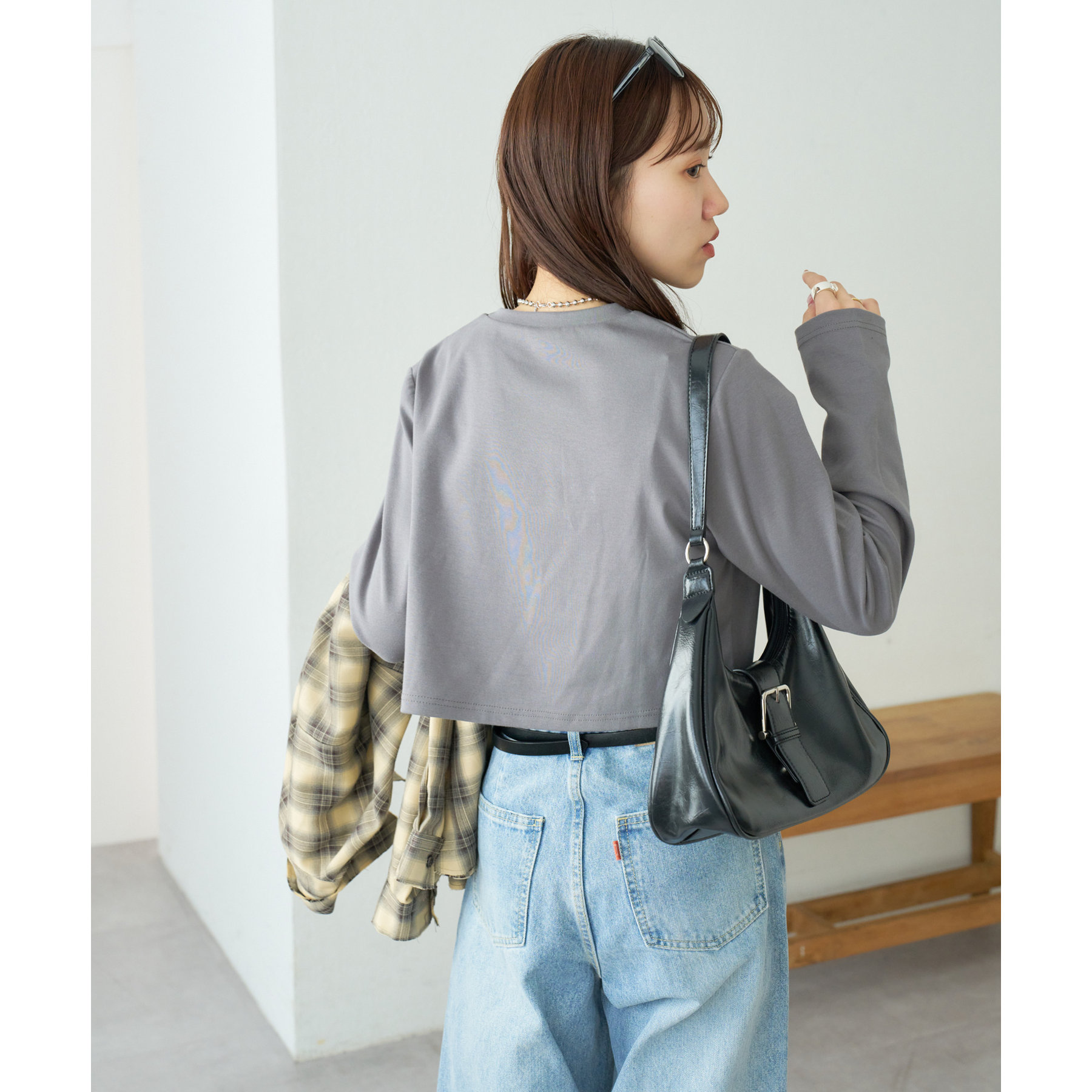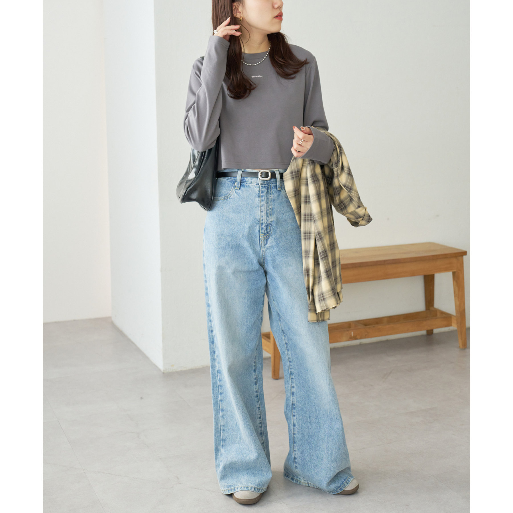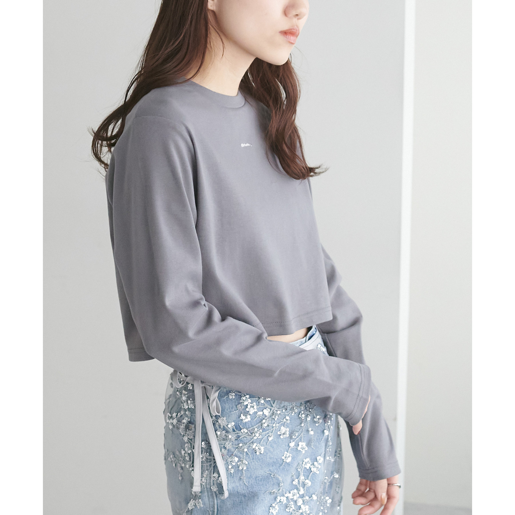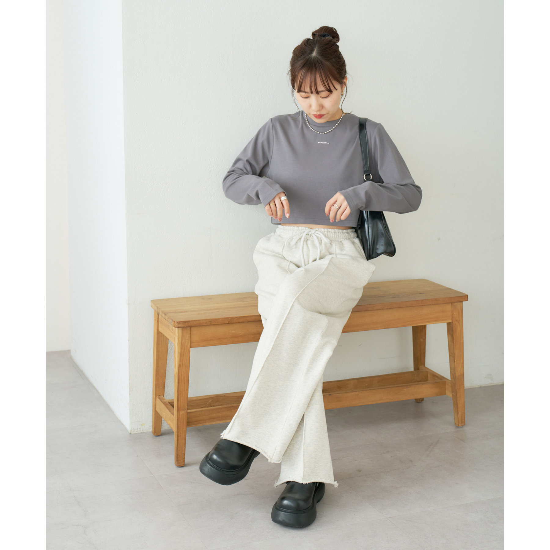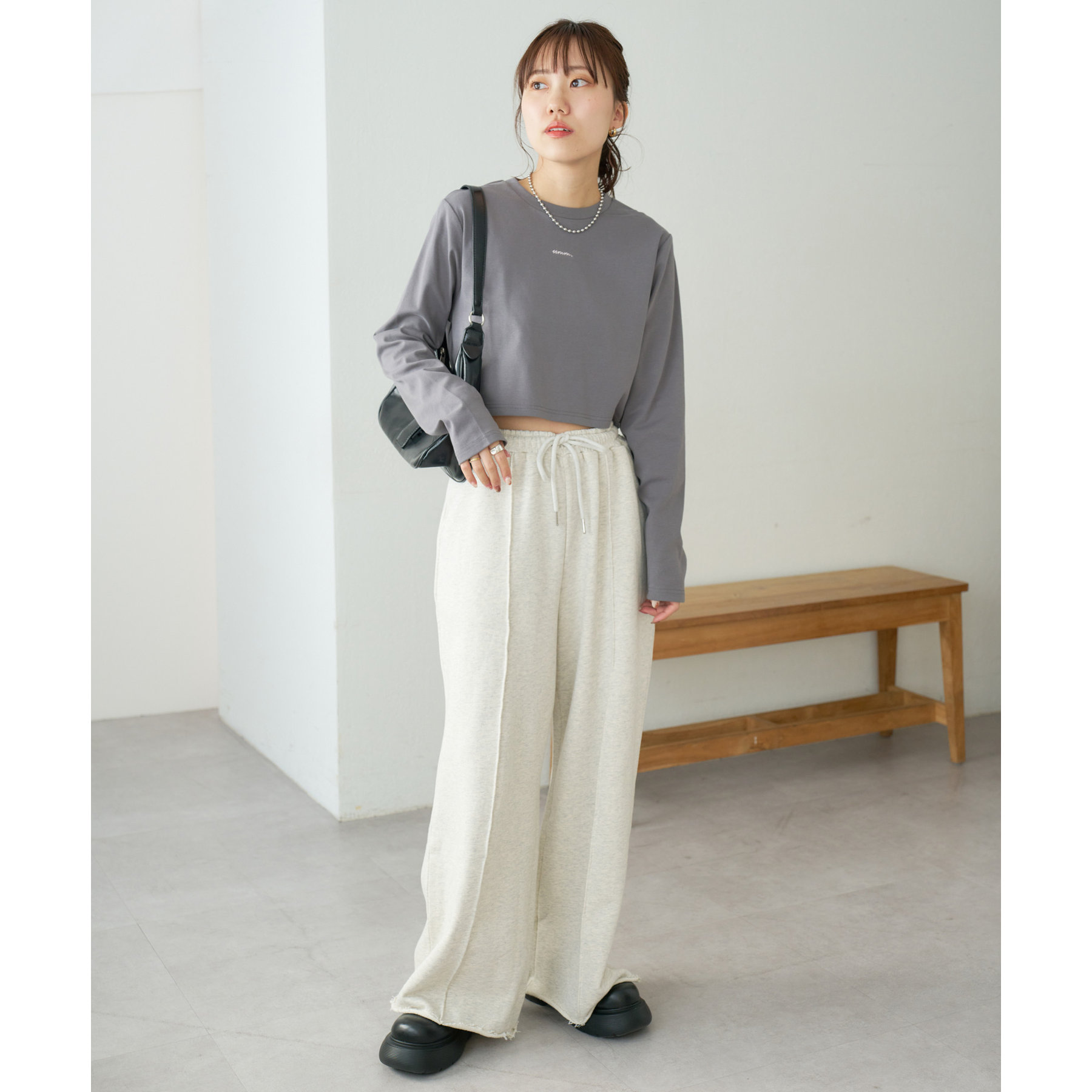 ショート丈だからこそ、ハイウエストボトムと合わせることでスタイルアップ効果が期待できます!