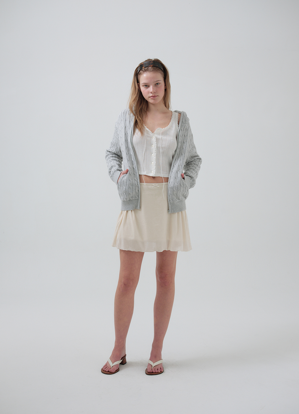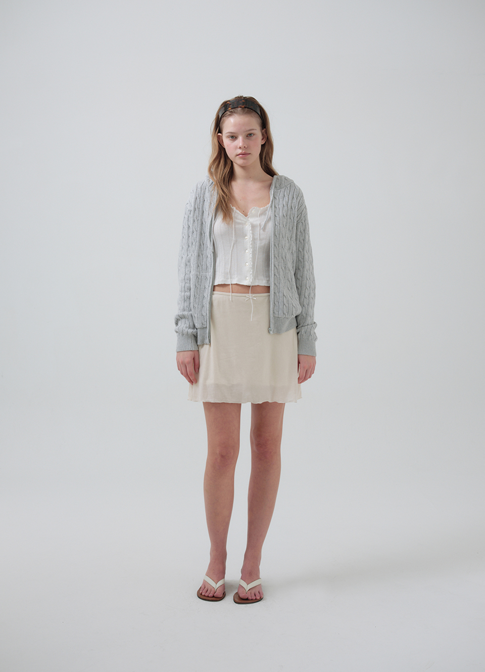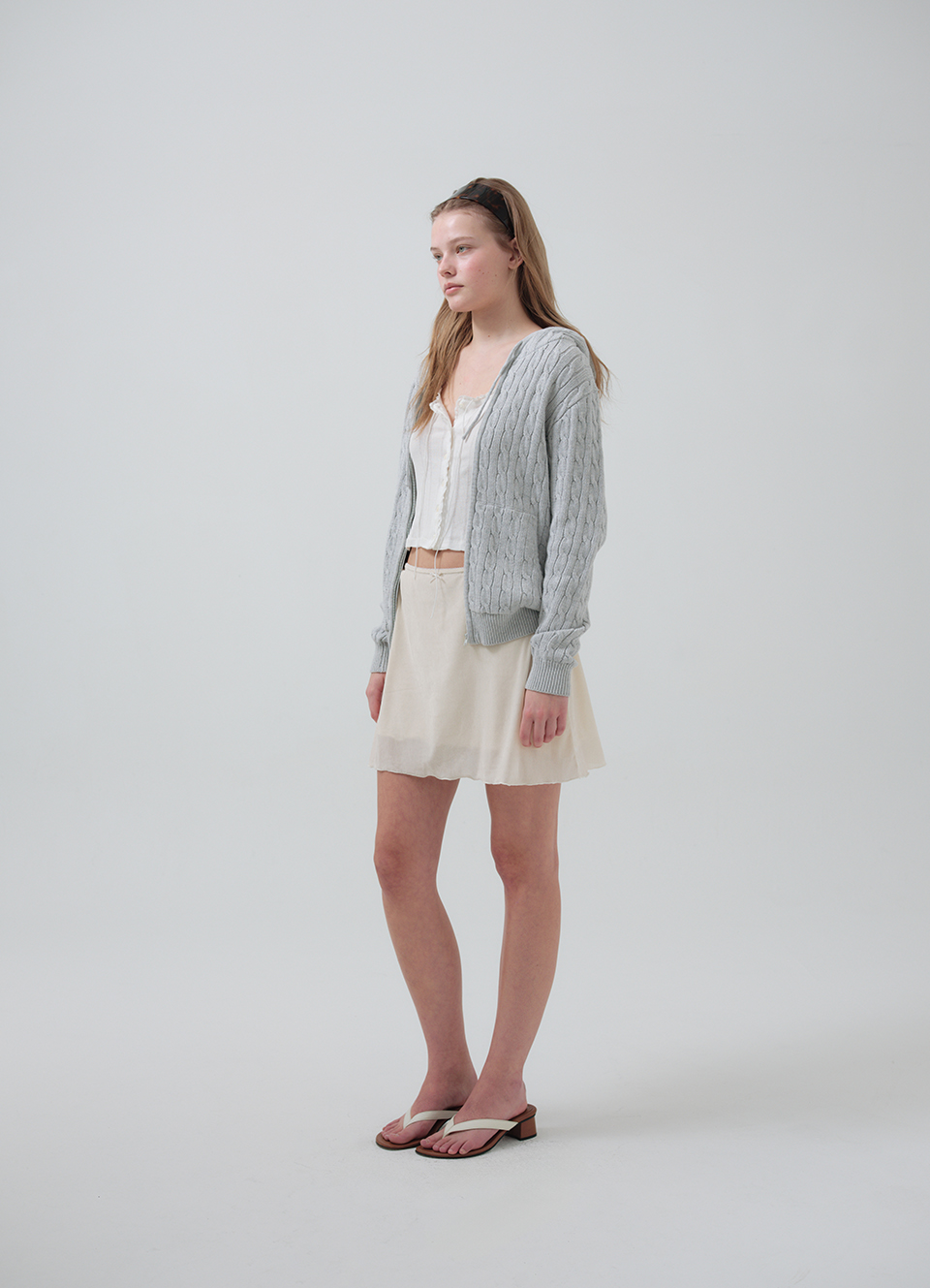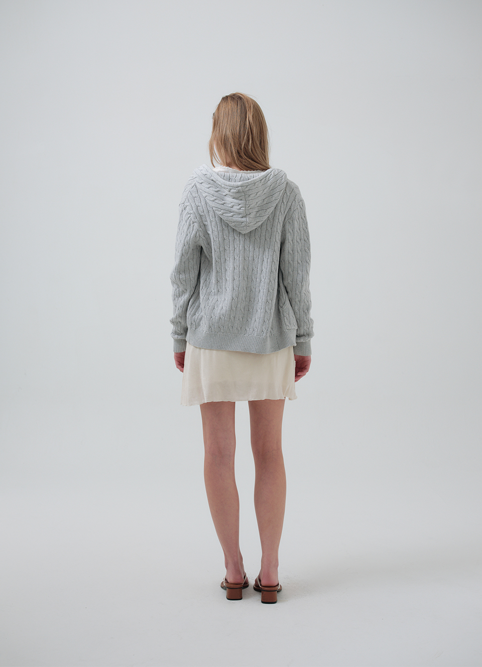 *ディープネイビーカラーの、軽く柔らかなタッチのコットンニット *ワンウェイジッパーで開閉できるニットフードジップアップアイテム *ケーブル柄のしなやかな素材感で、デイリーに演出しやすいデザイン