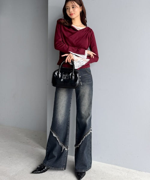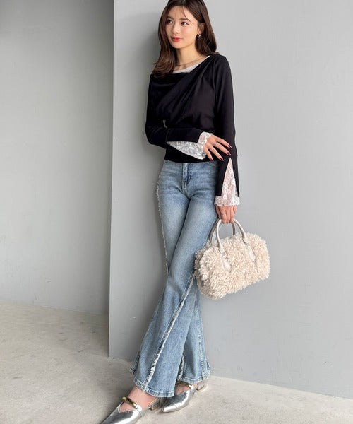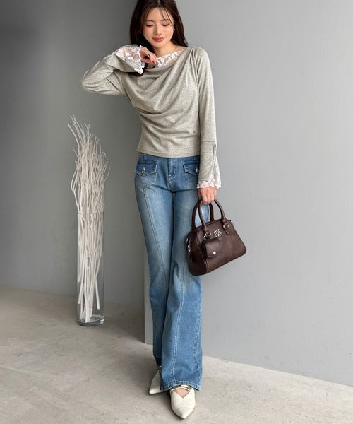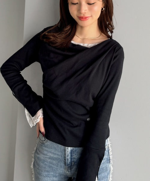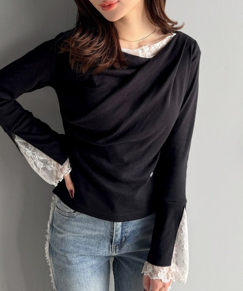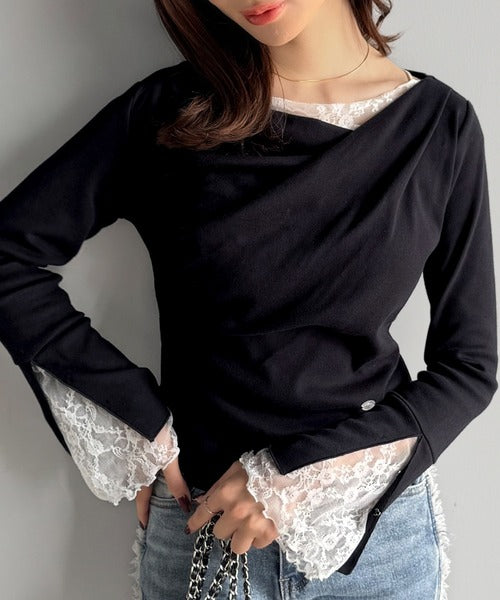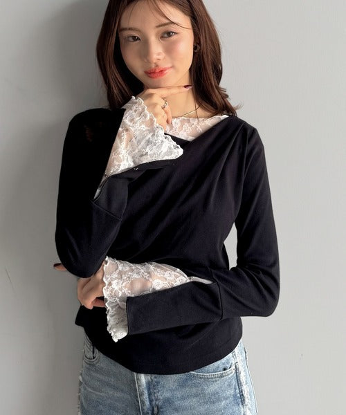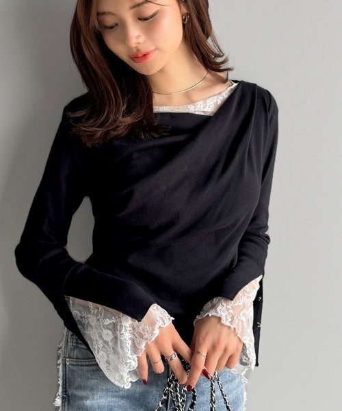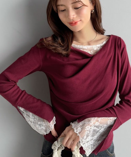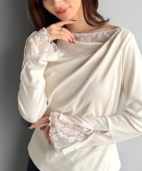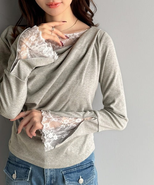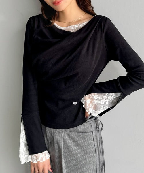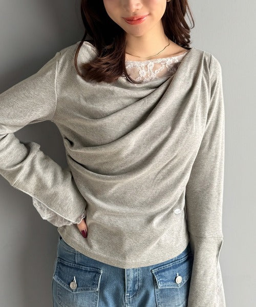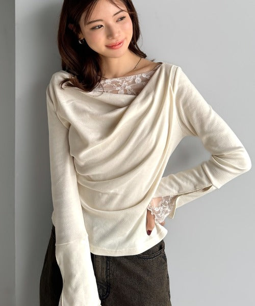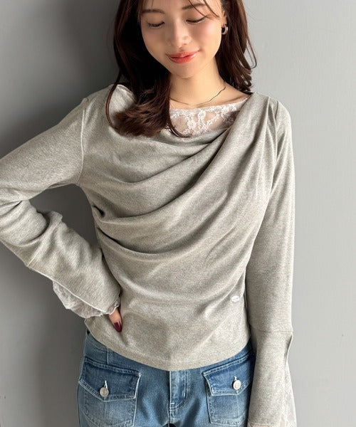 【mily bilet】「ちら見え」が可愛い♪レース切替え胸元ドレープフレアスリーブプルオーバー(長袖) mi1359019