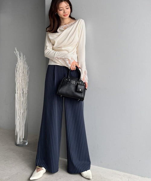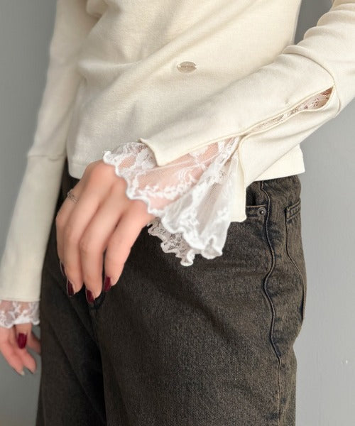 胸元と袖口にあしらわれたレースが大人のフェミニンさを演出し、