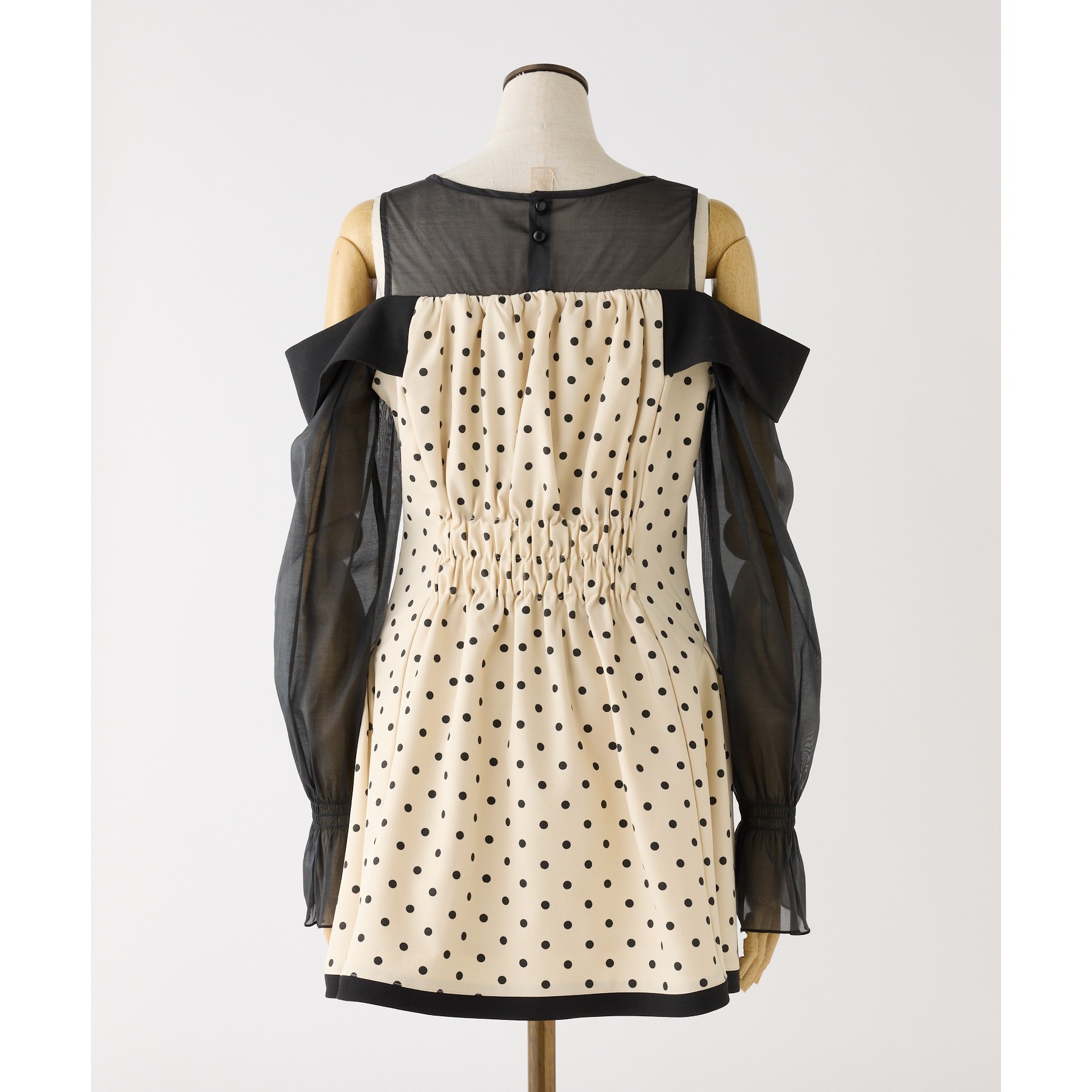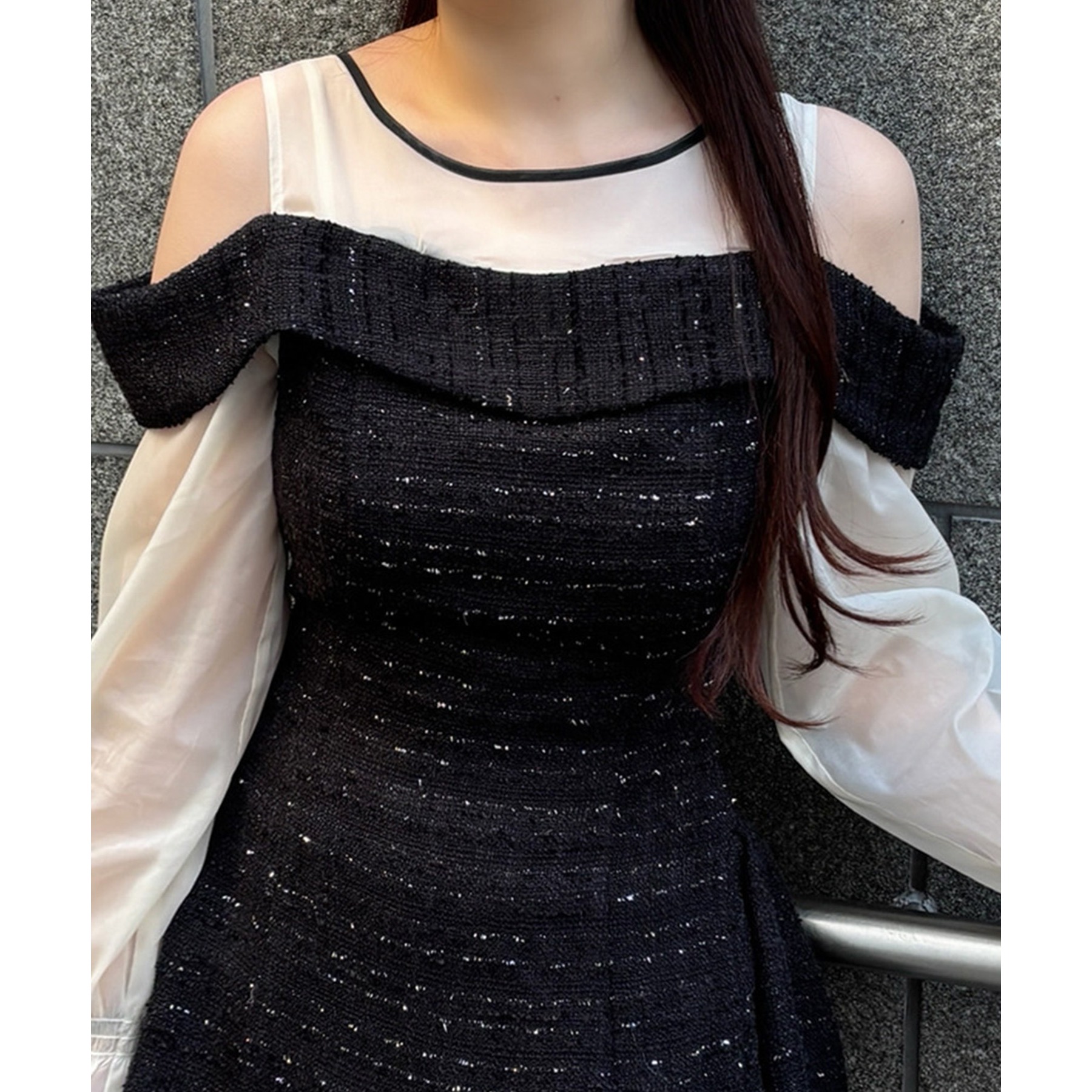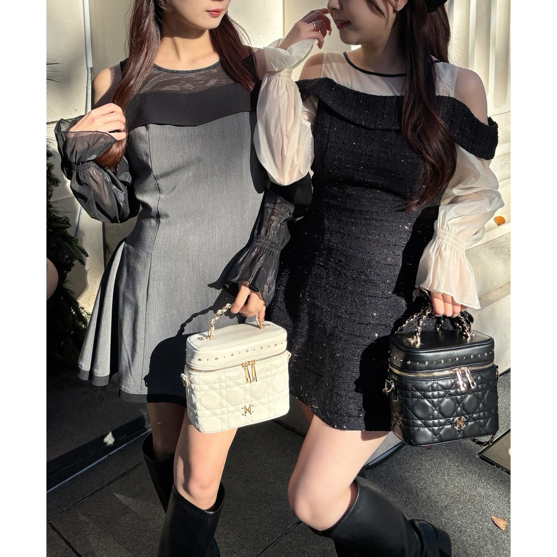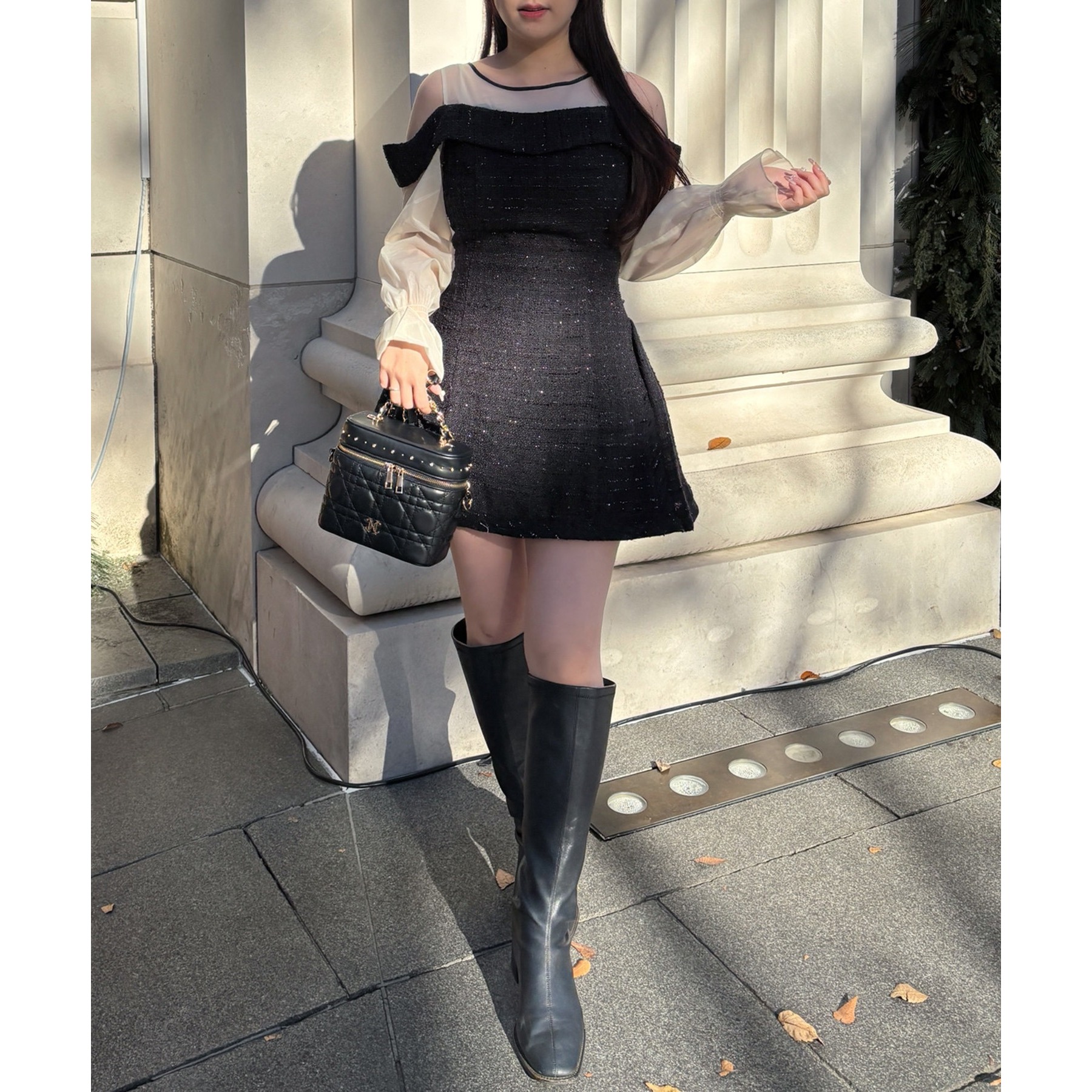 ほんのり肌見せが叶うシアー素材をデコルテと袖に使用したミニワンピース。