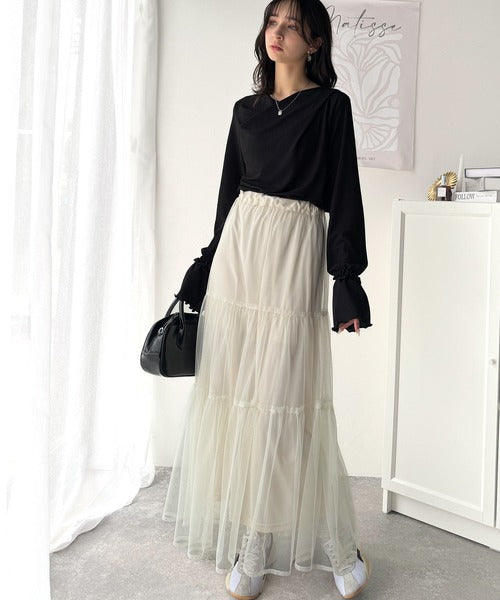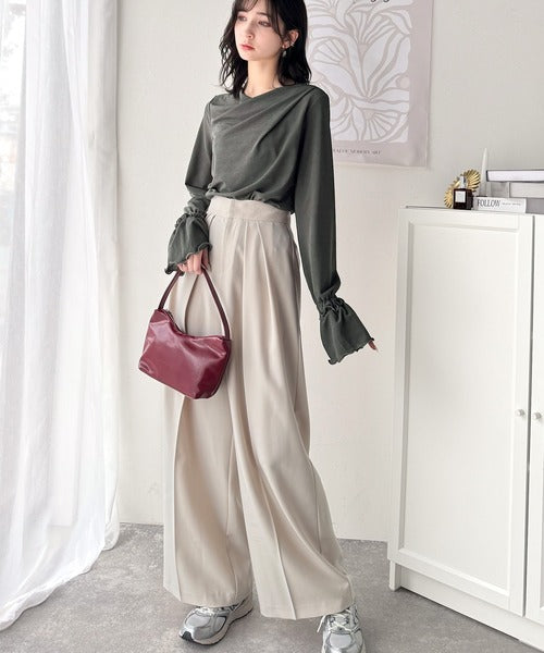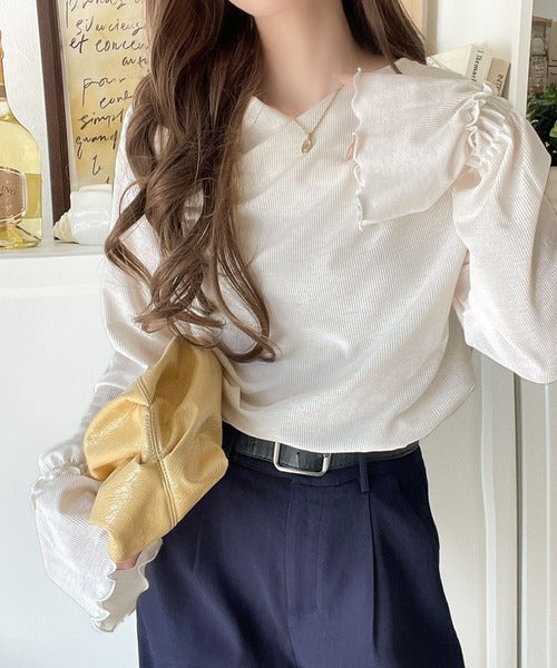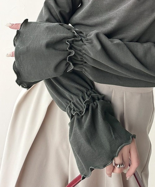 袖のメローフリルはアウターを着た際にも、ちらりと見えるアクセントとなり
