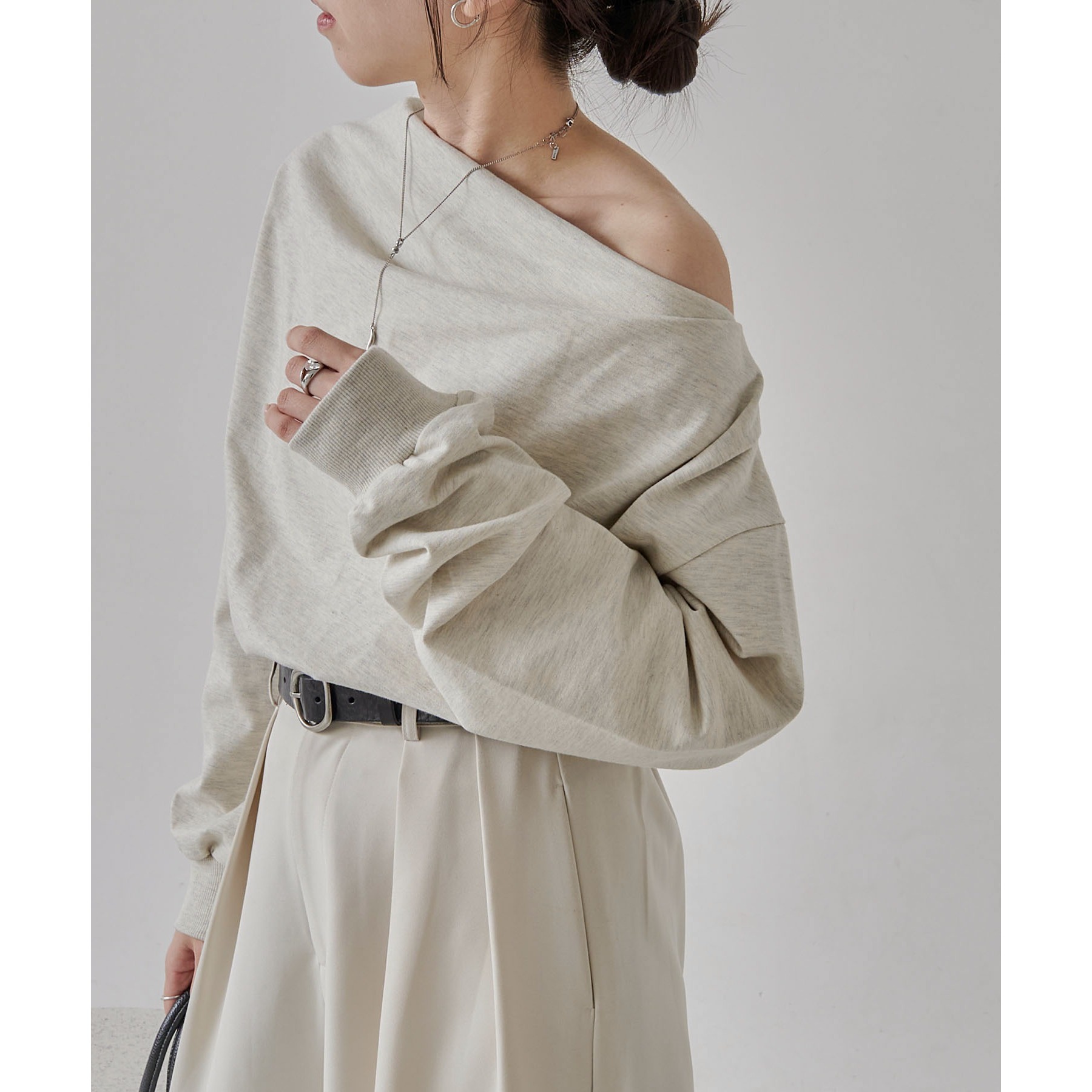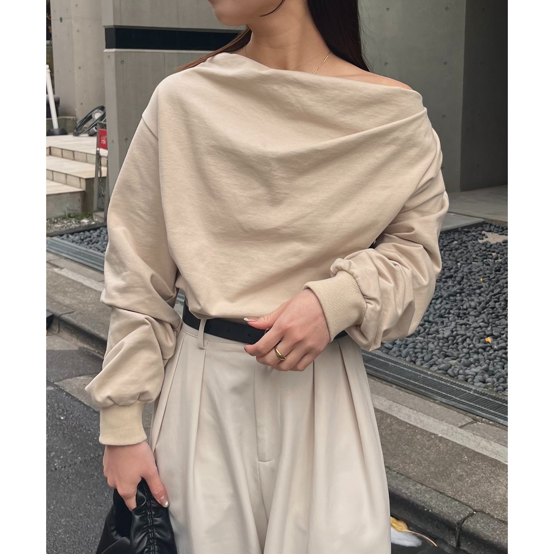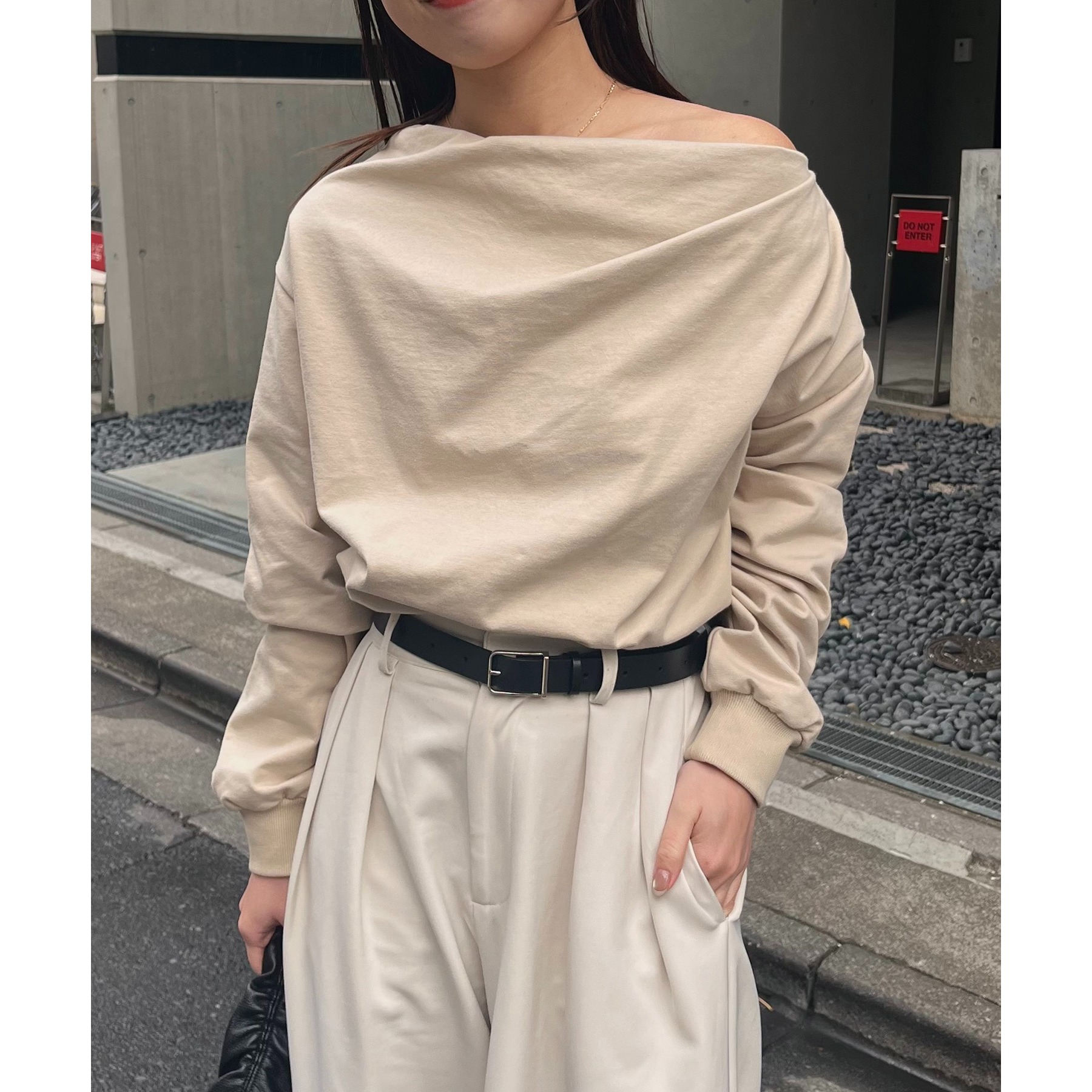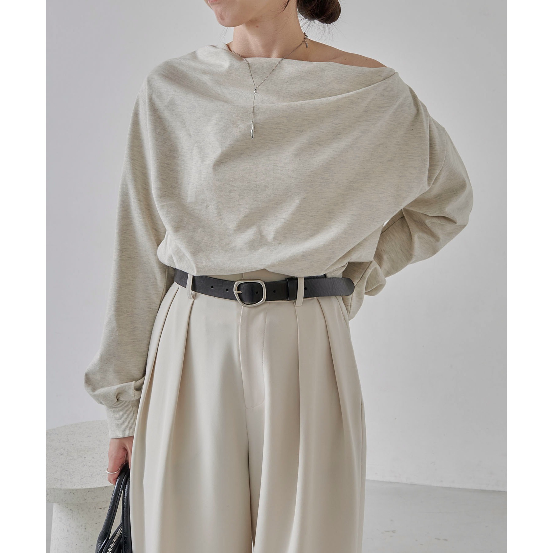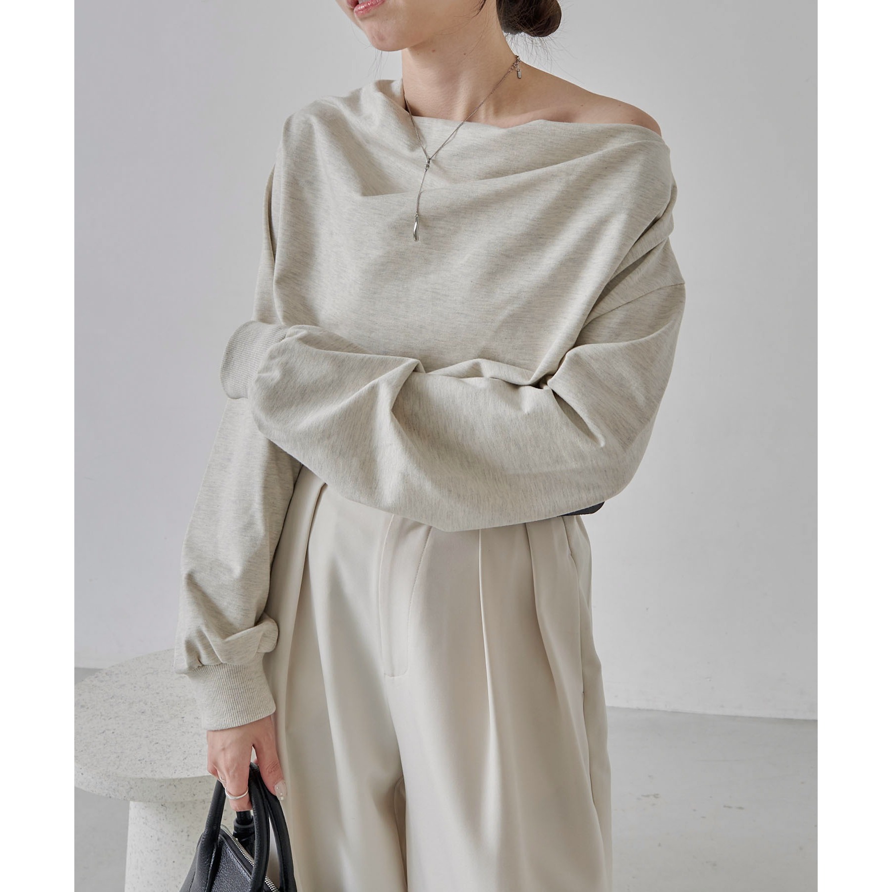 ・ボートネックでも、肩を落としてワンショルダーでも着られる