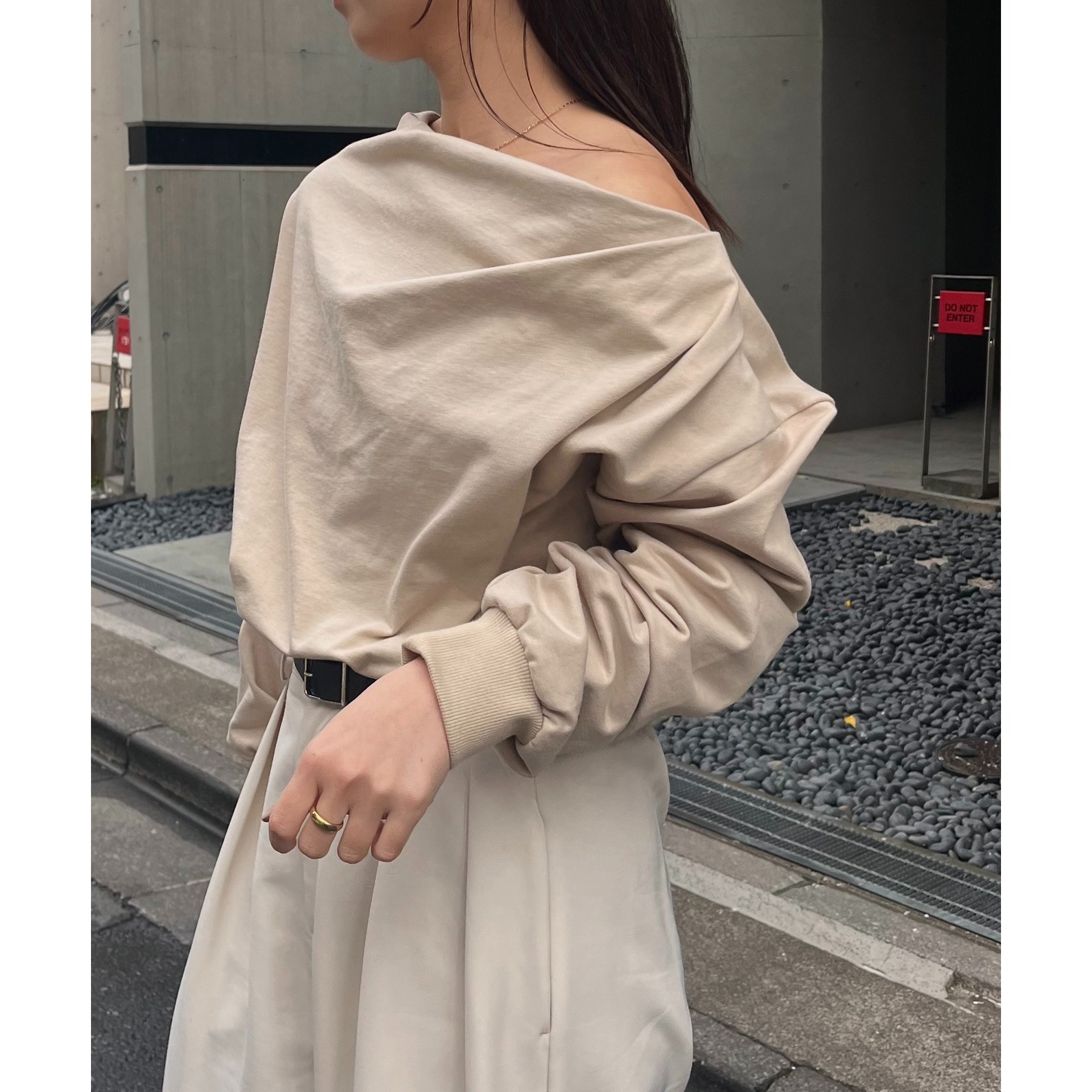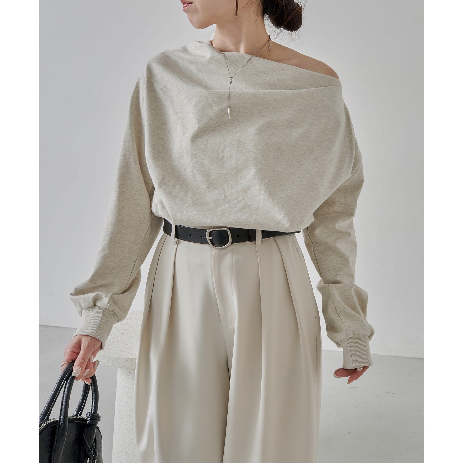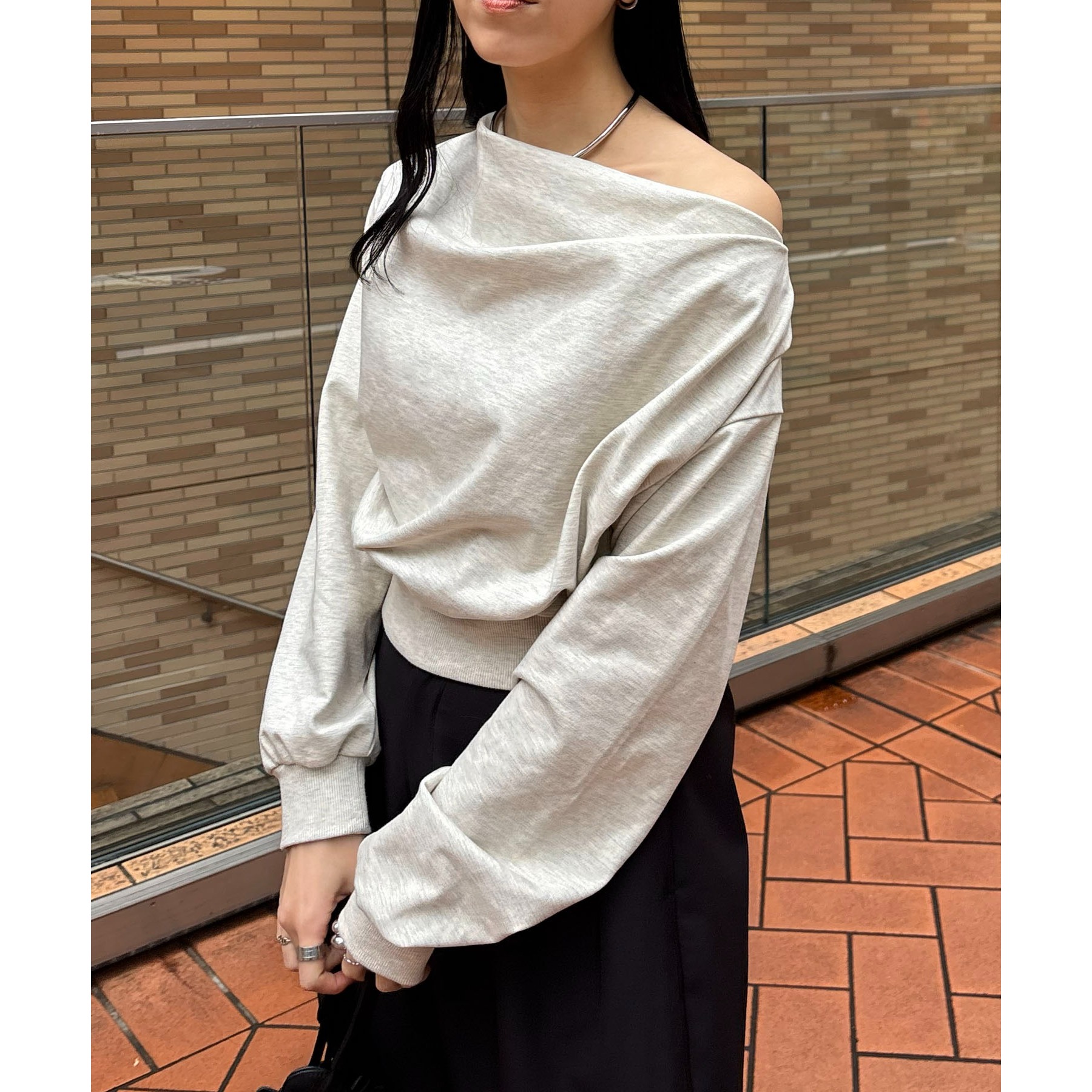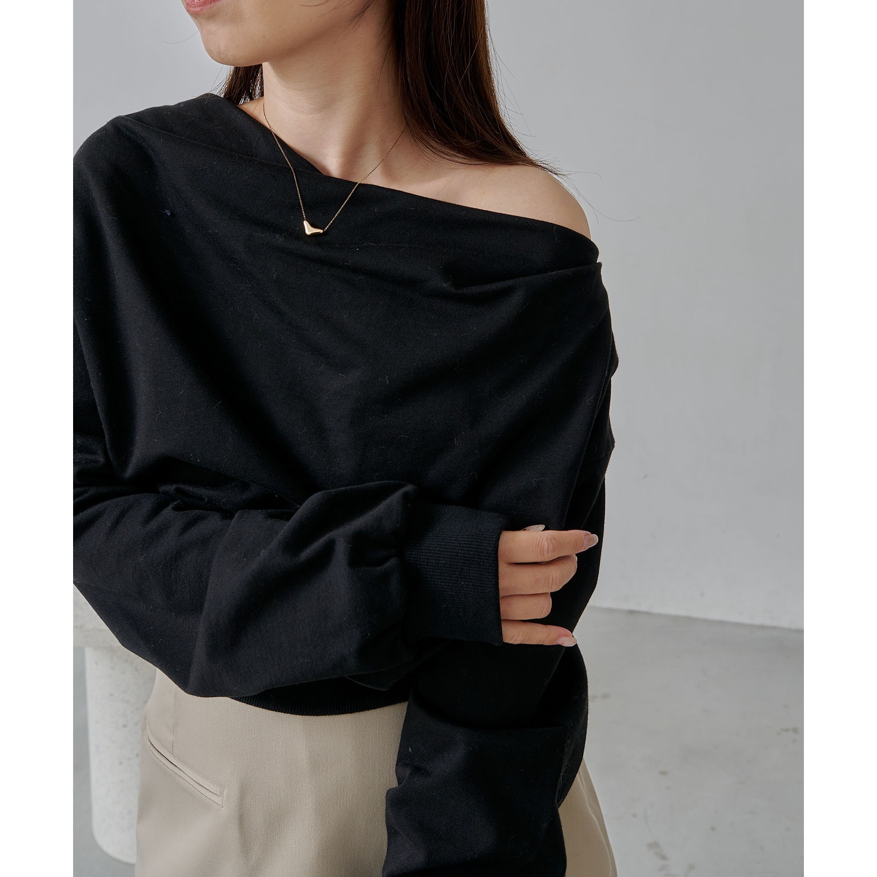 ・ボートネックでも、肩を落としてワンショルダーでも着られる