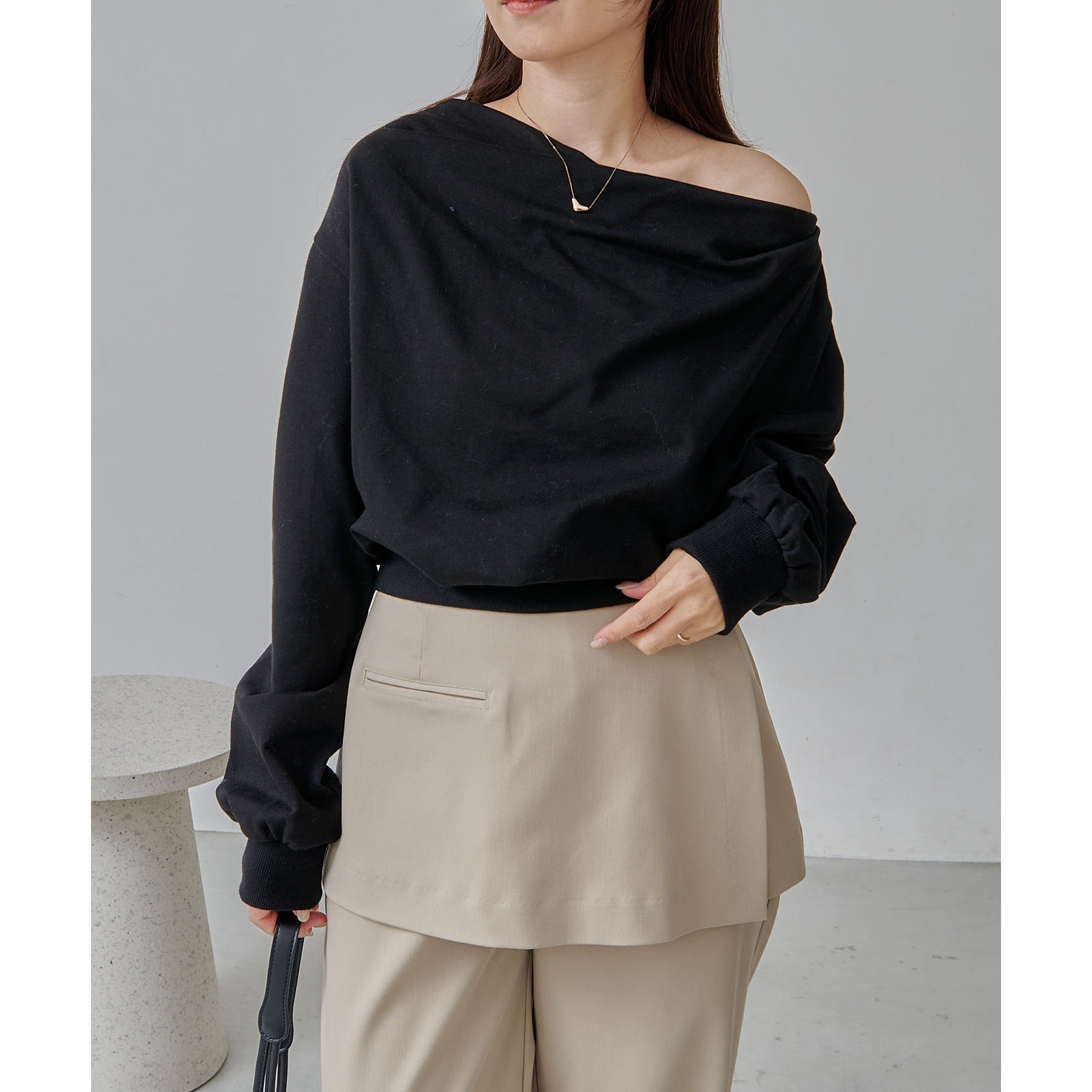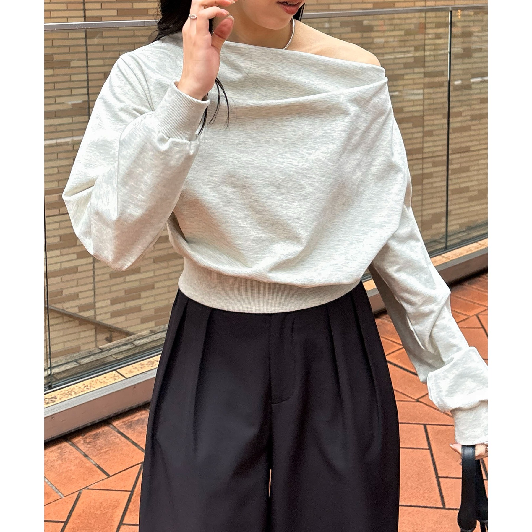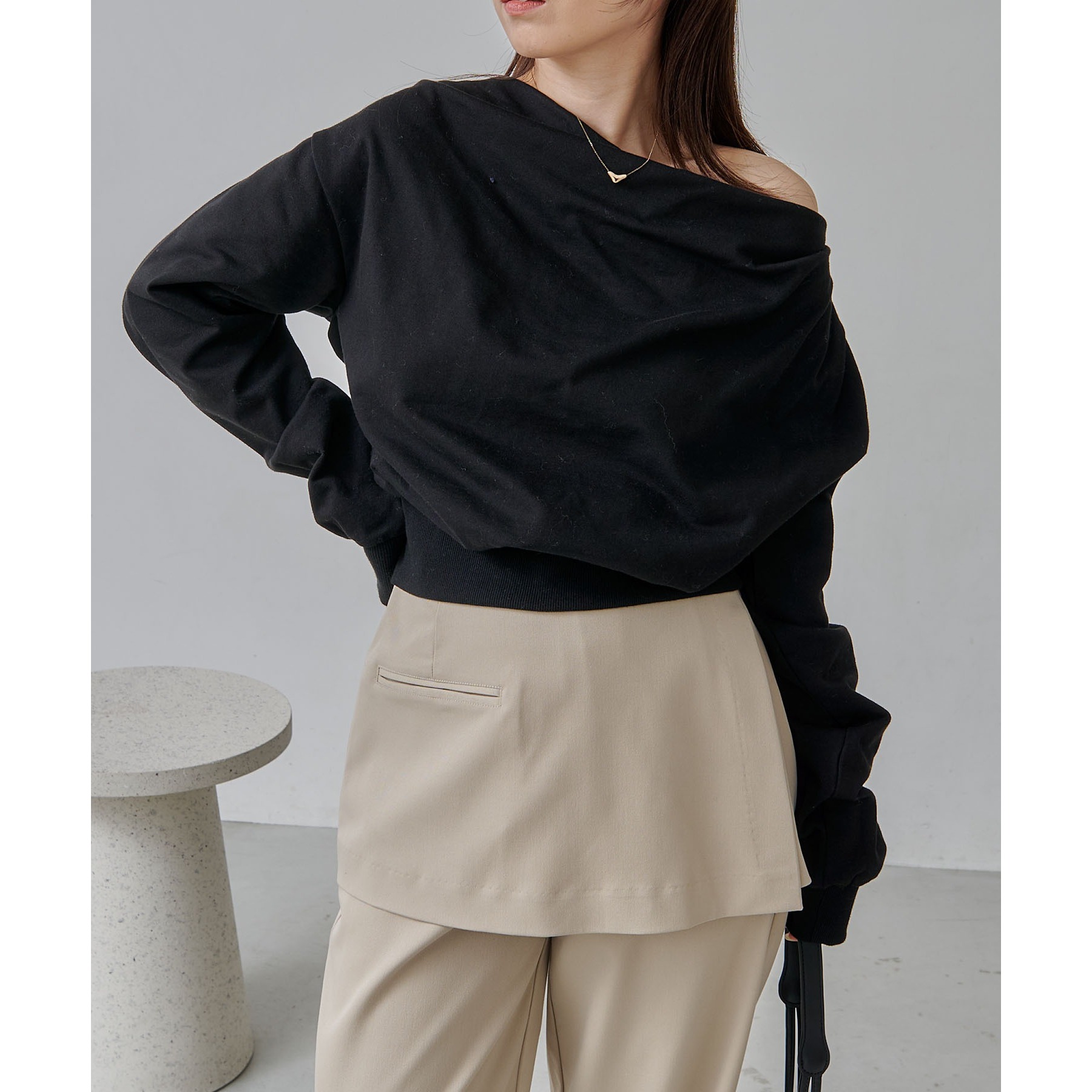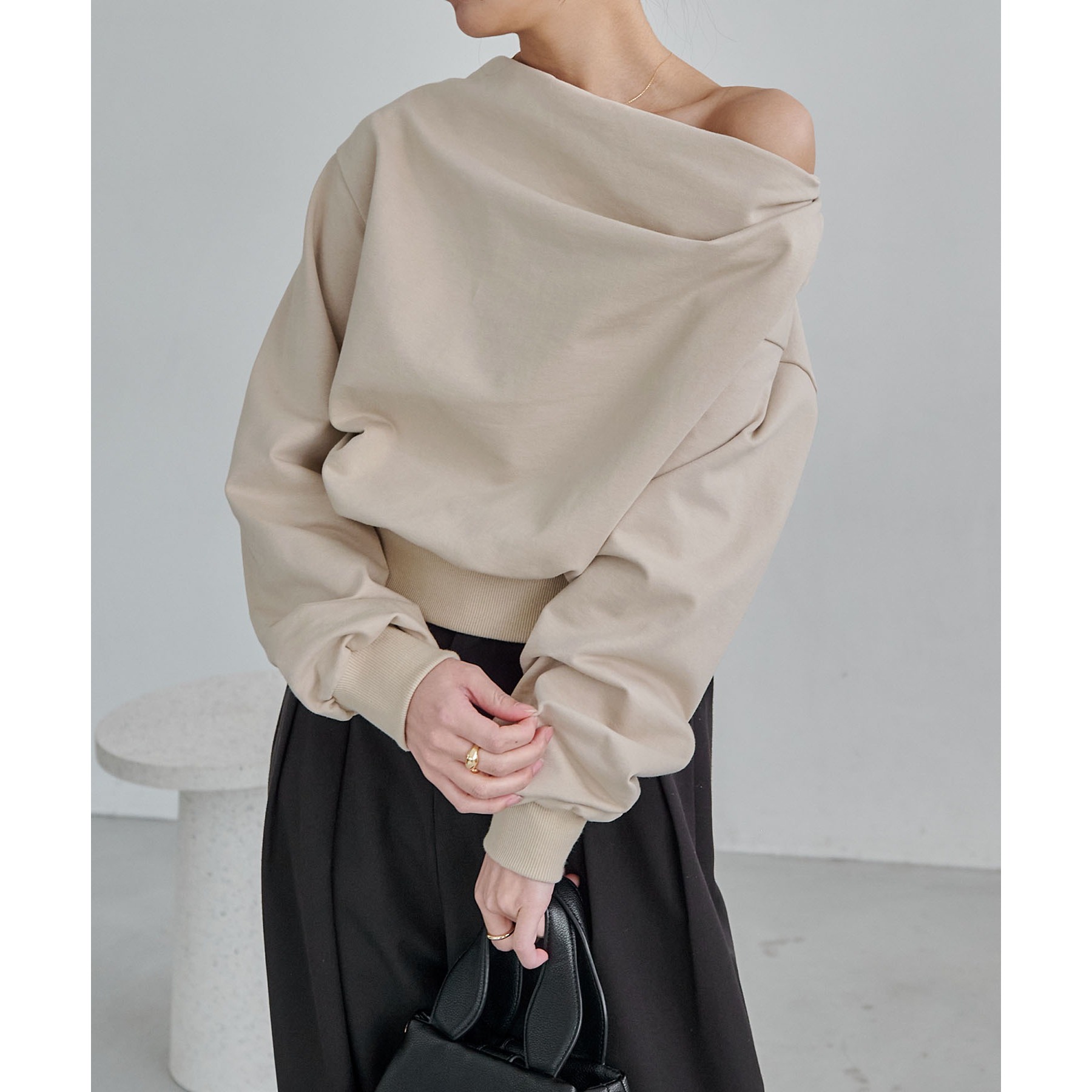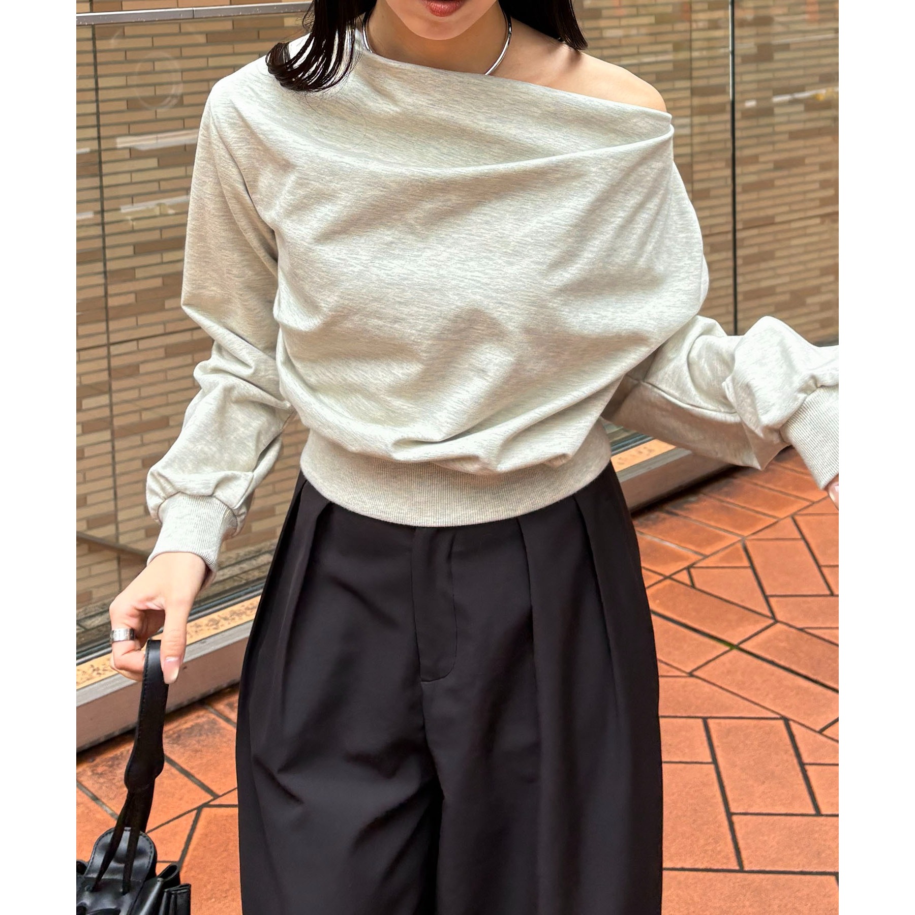 ・ボートネックでも、肩を落としてワンショルダーでも着られる