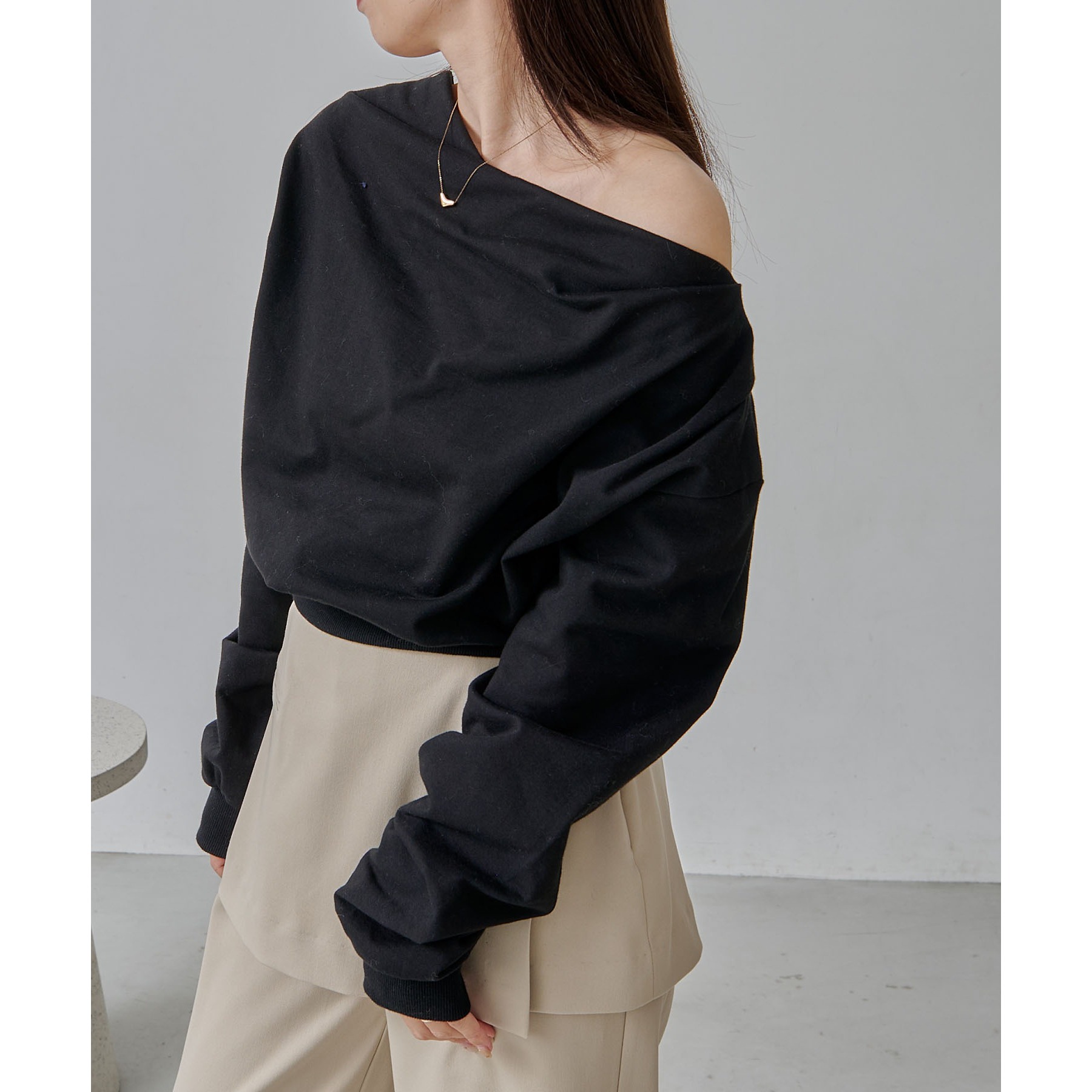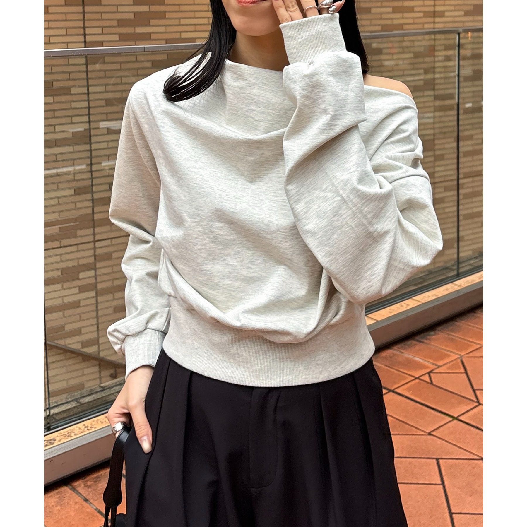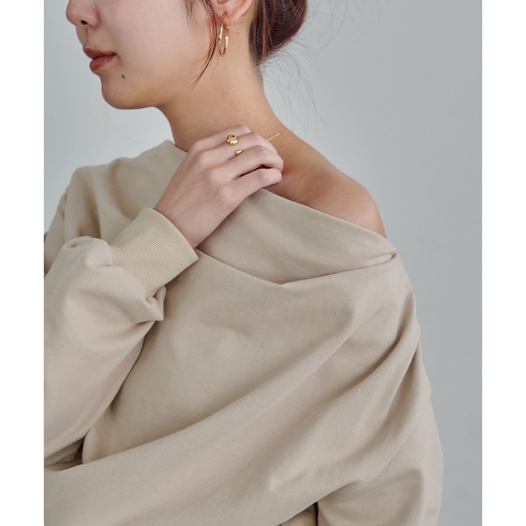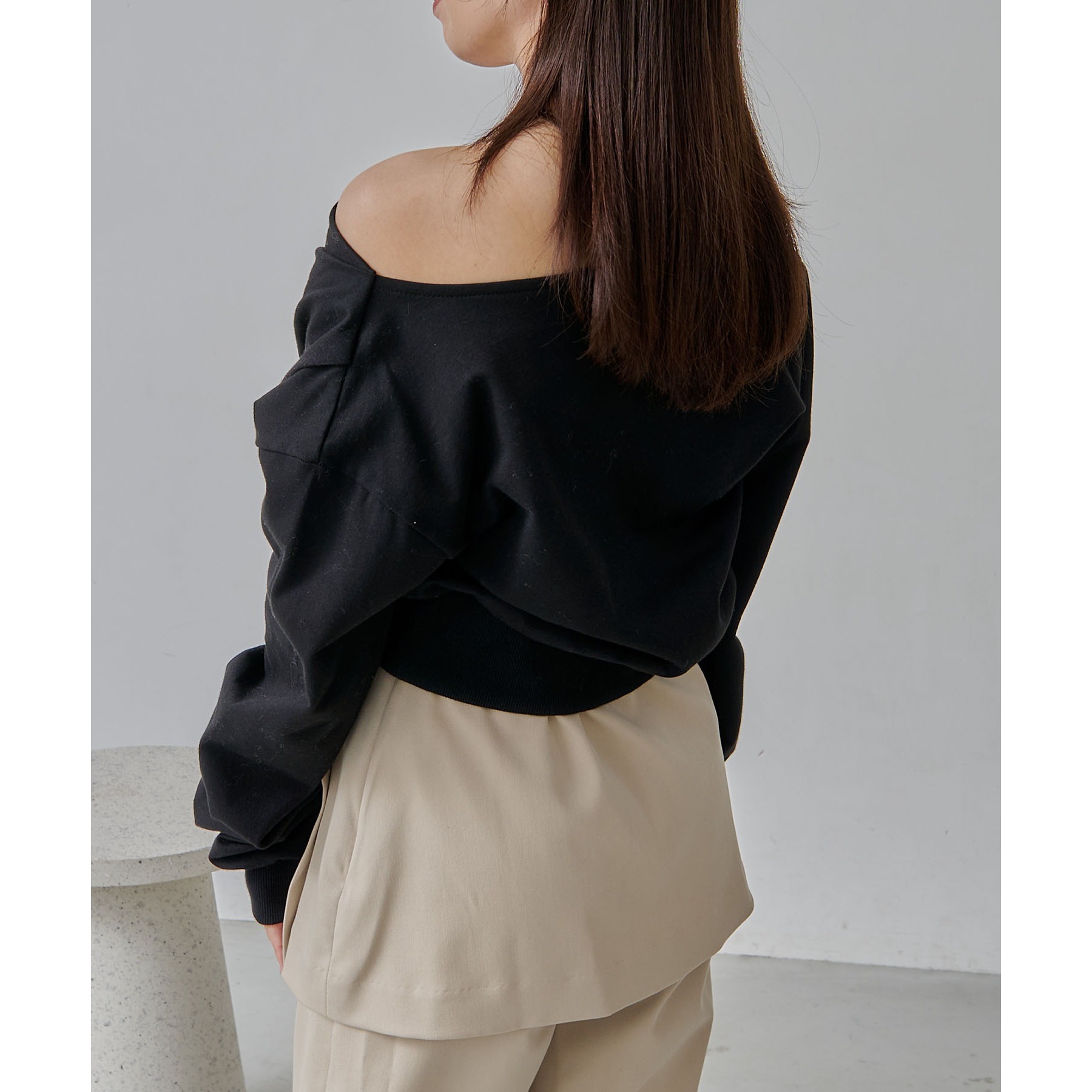 ・ボートネックでも、肩を落としてワンショルダーでも着られる