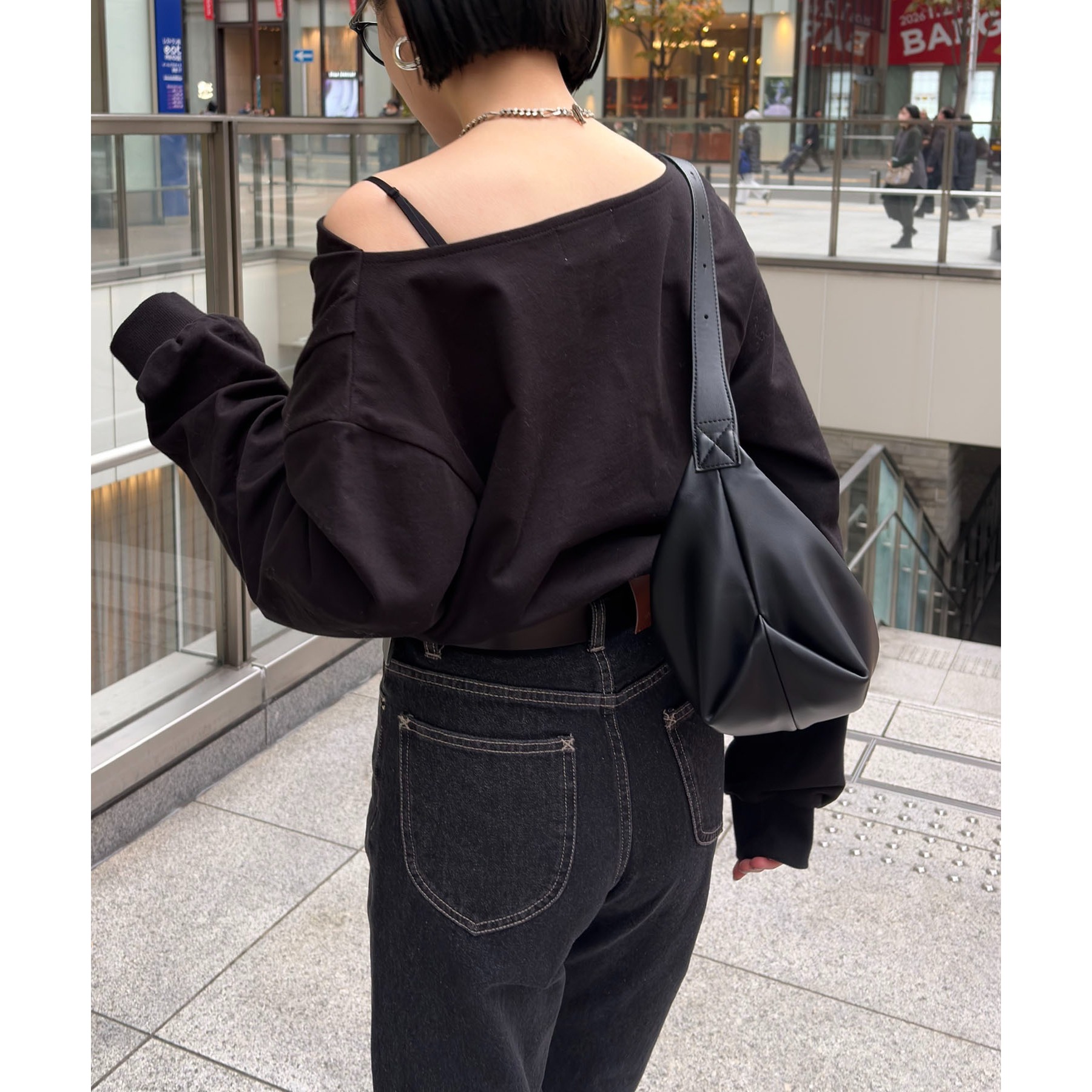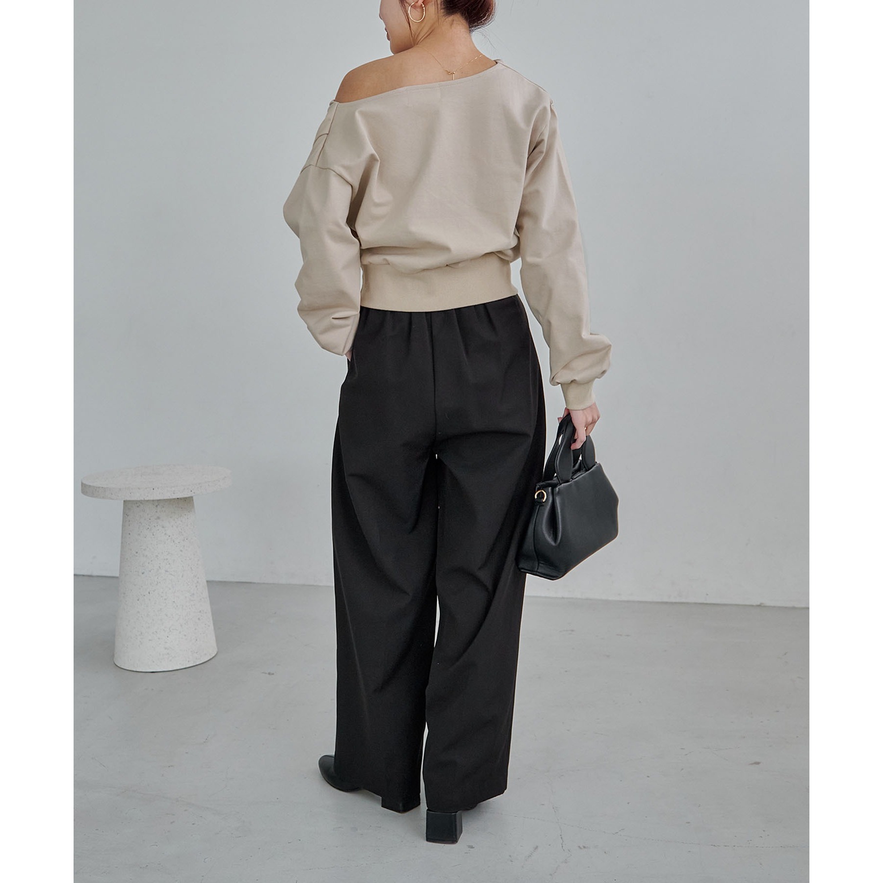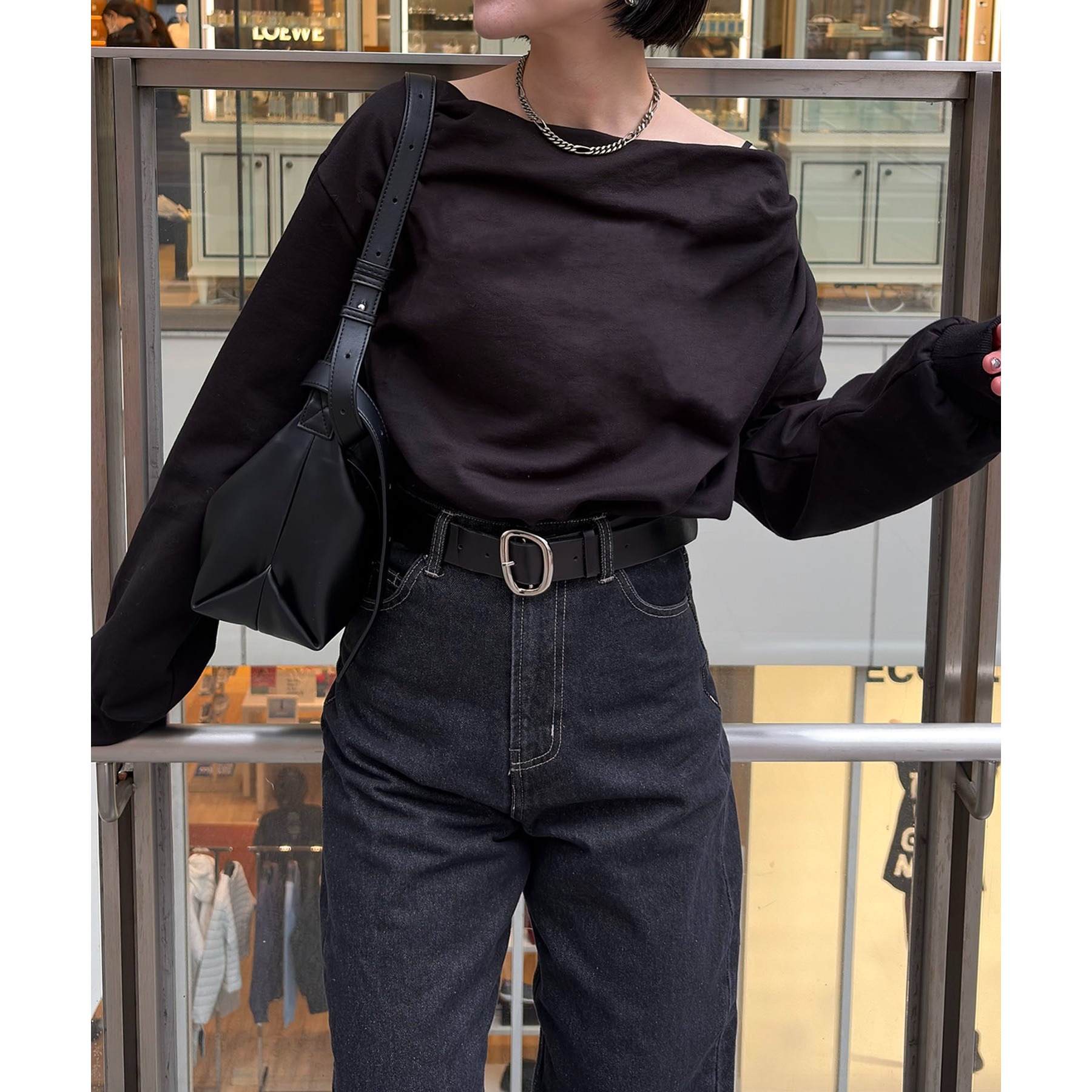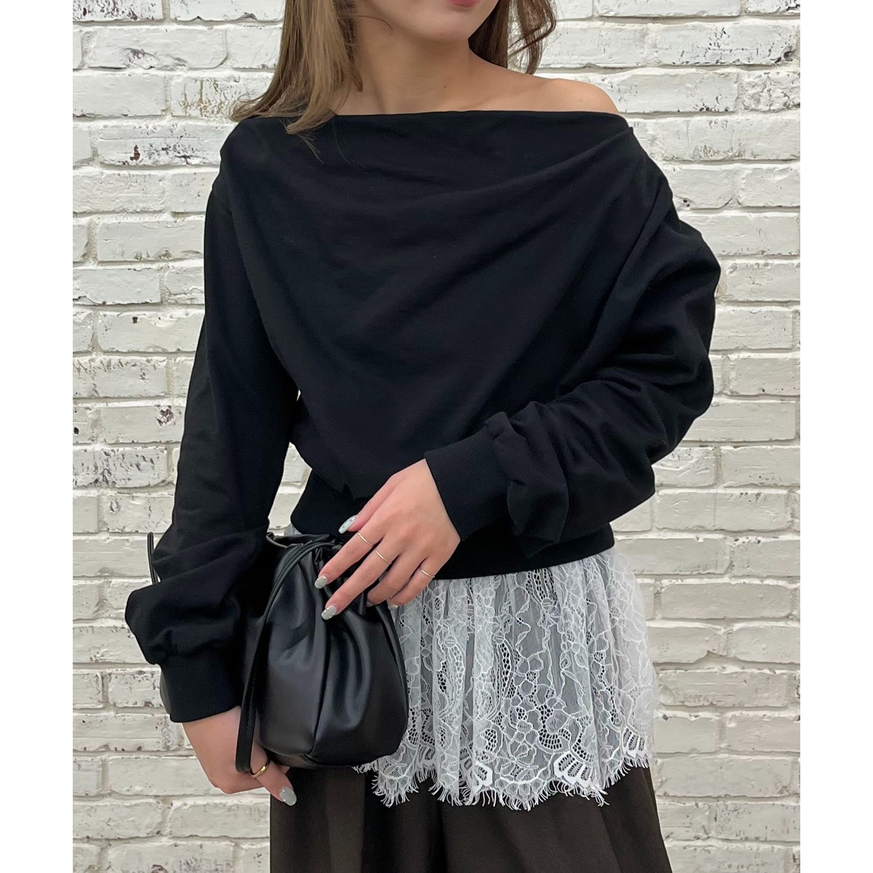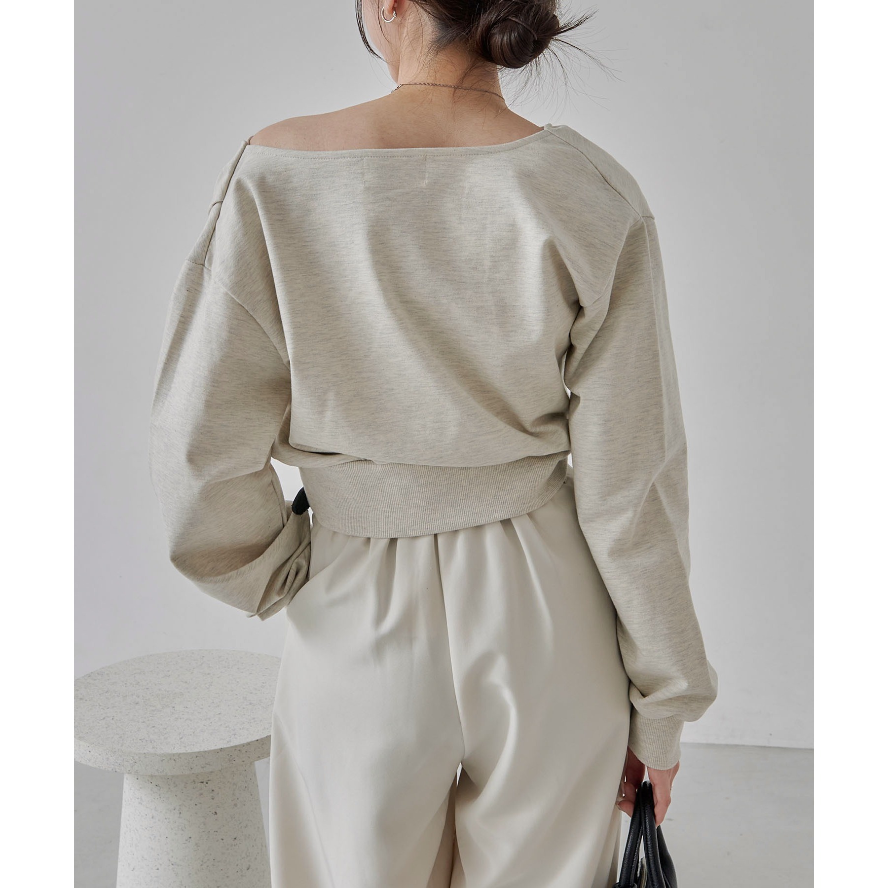 ・ボートネックでも、肩を落としてワンショルダーでも着られる