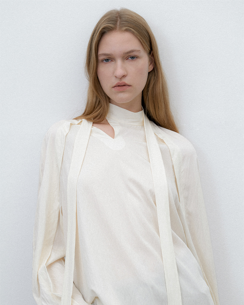 ラグランスリーブのタックとボリュームがフェミニンさを引き立てます。