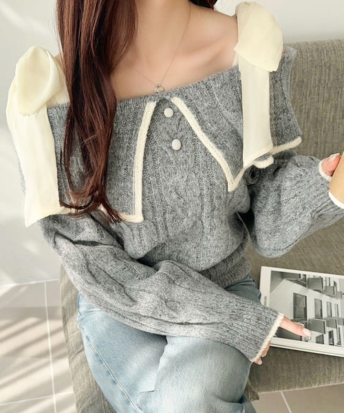 大きめリボンがアクセントのケーブルニットは、オフショルデザインで女性らしさを引き立てます。