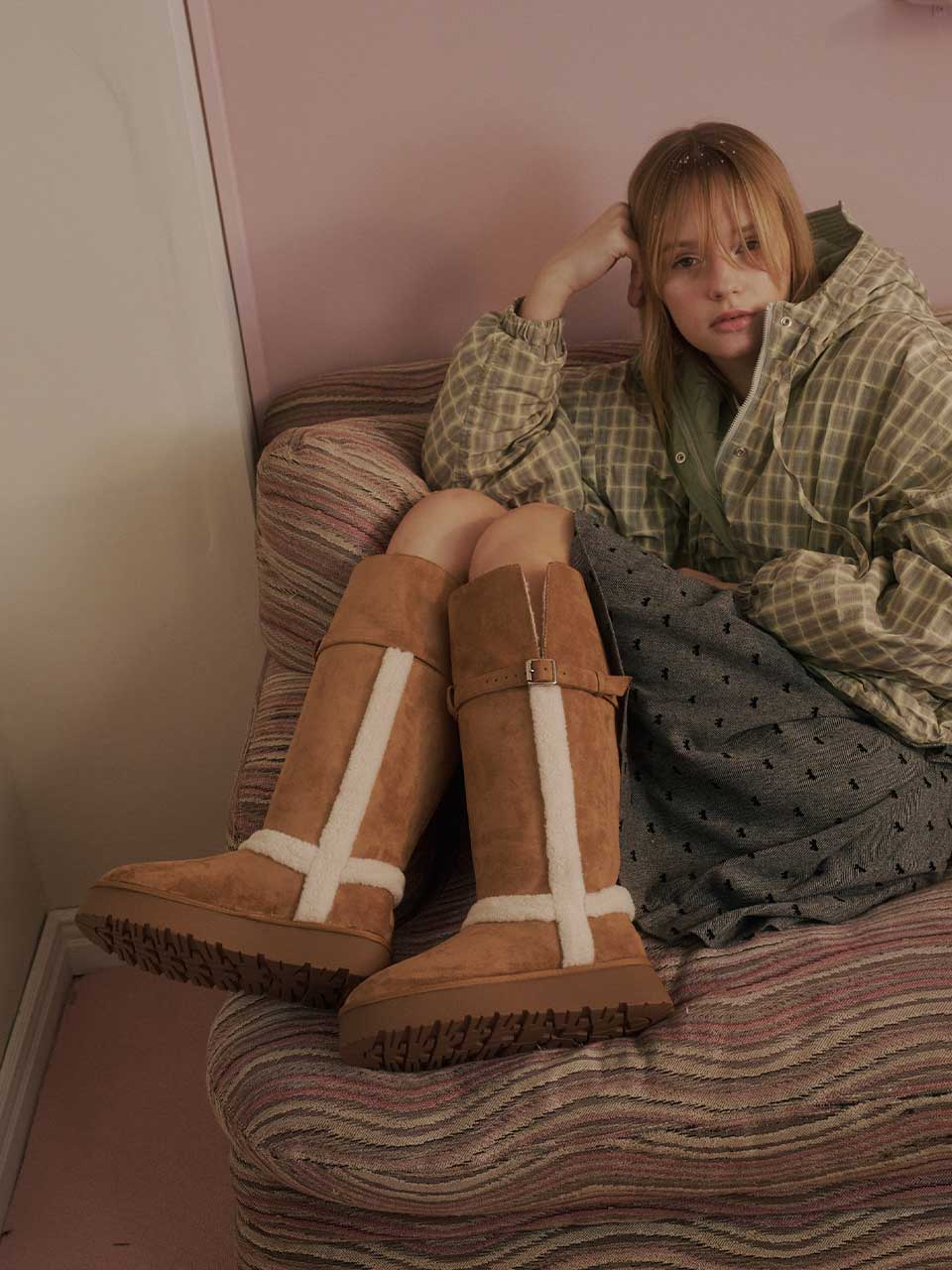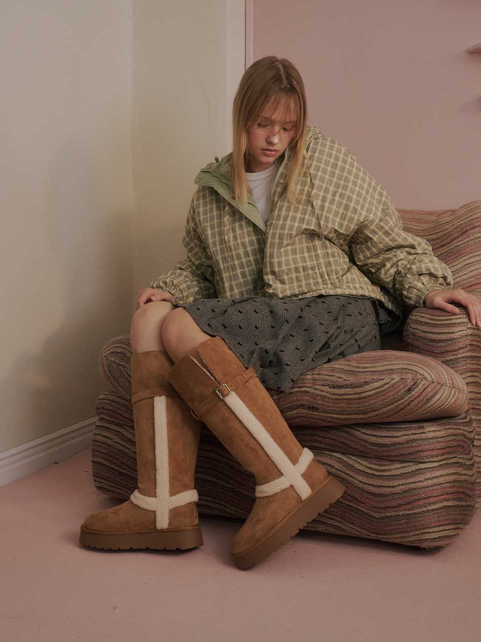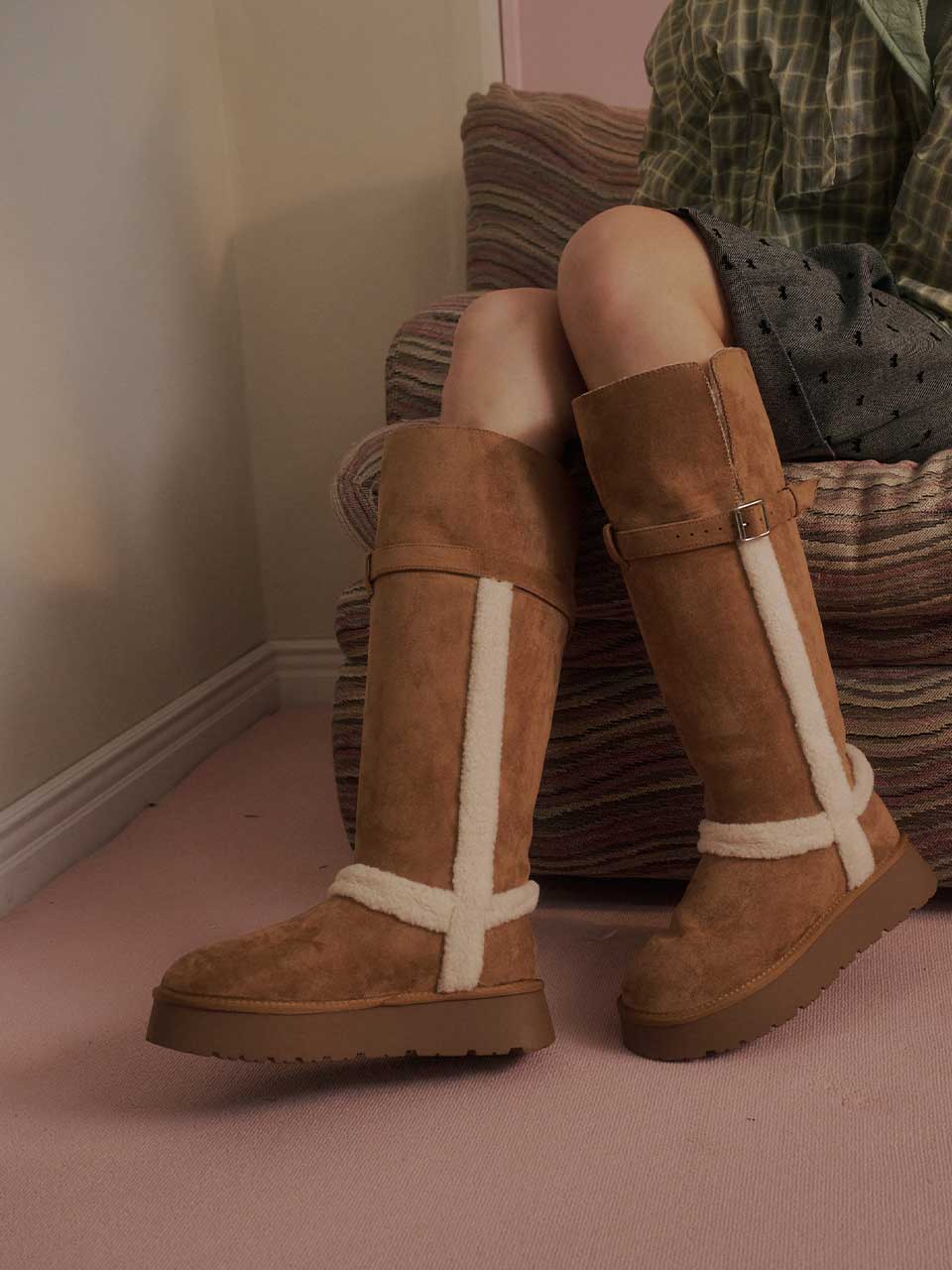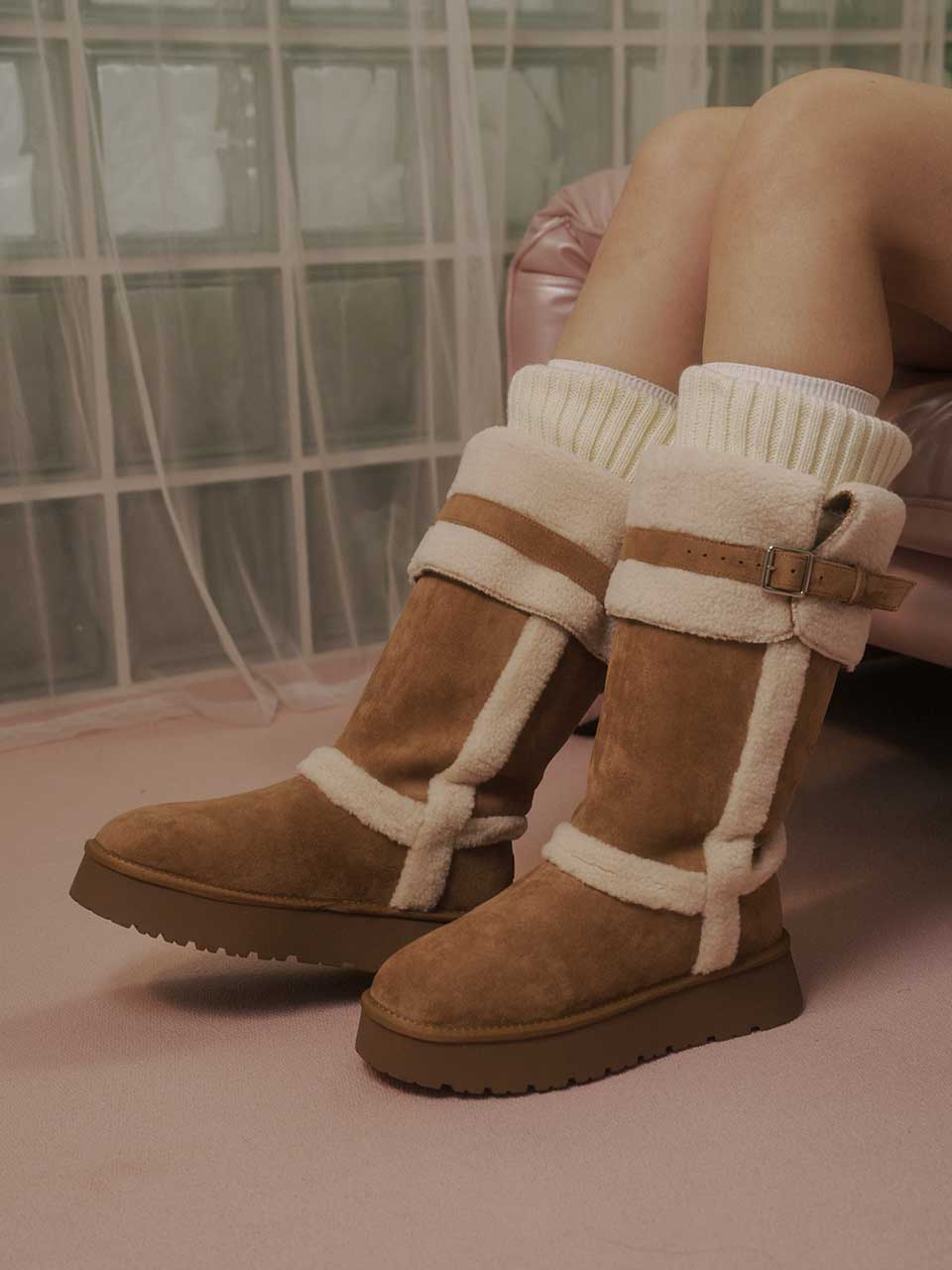 Strap Fur Long Boots - Chestnut