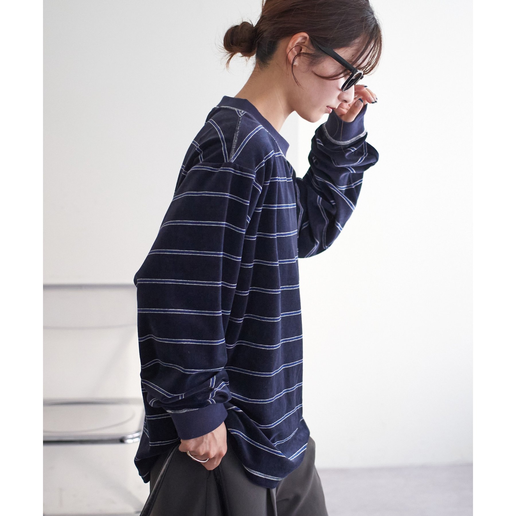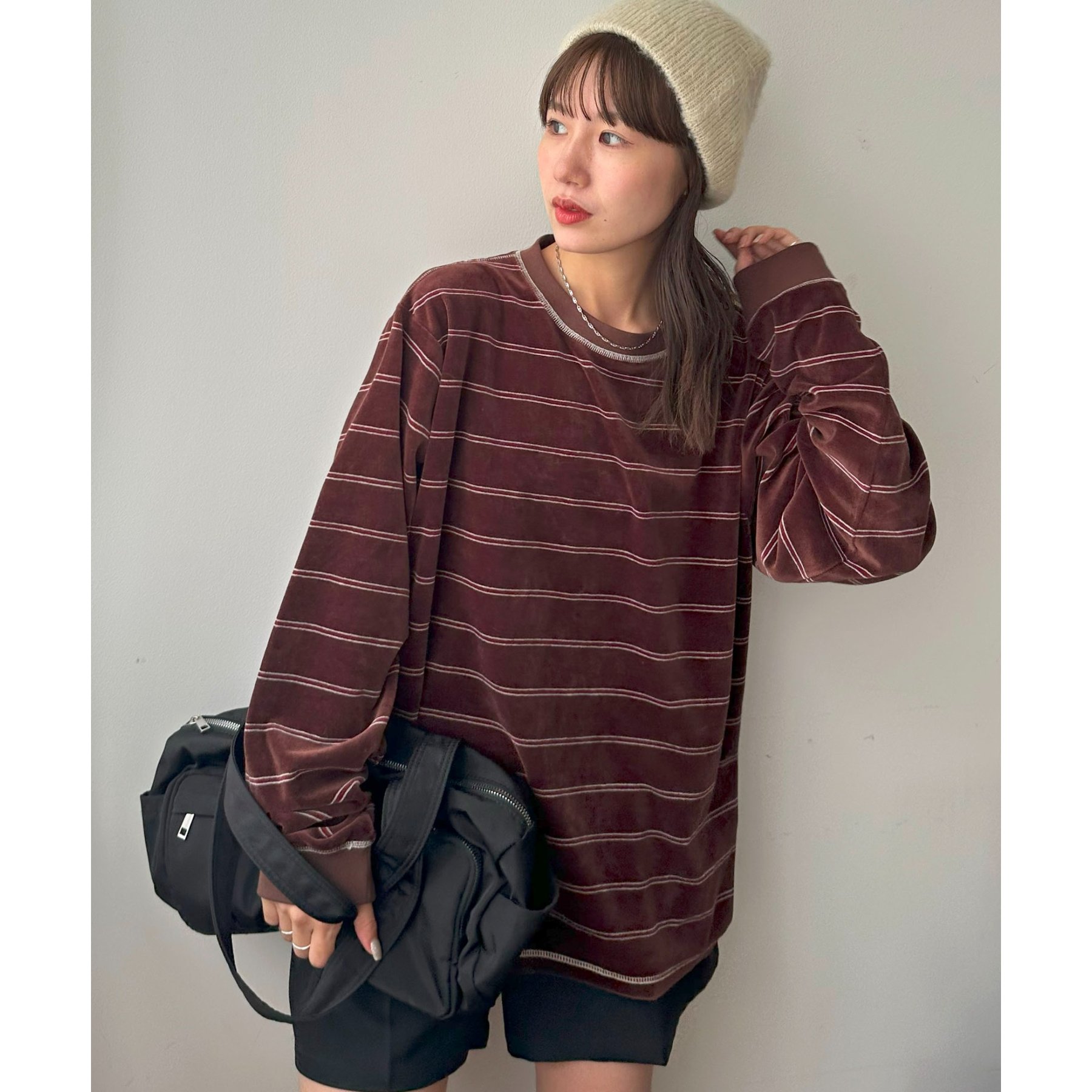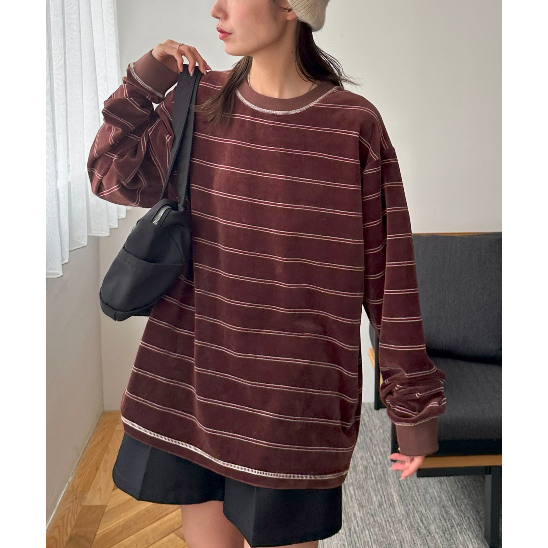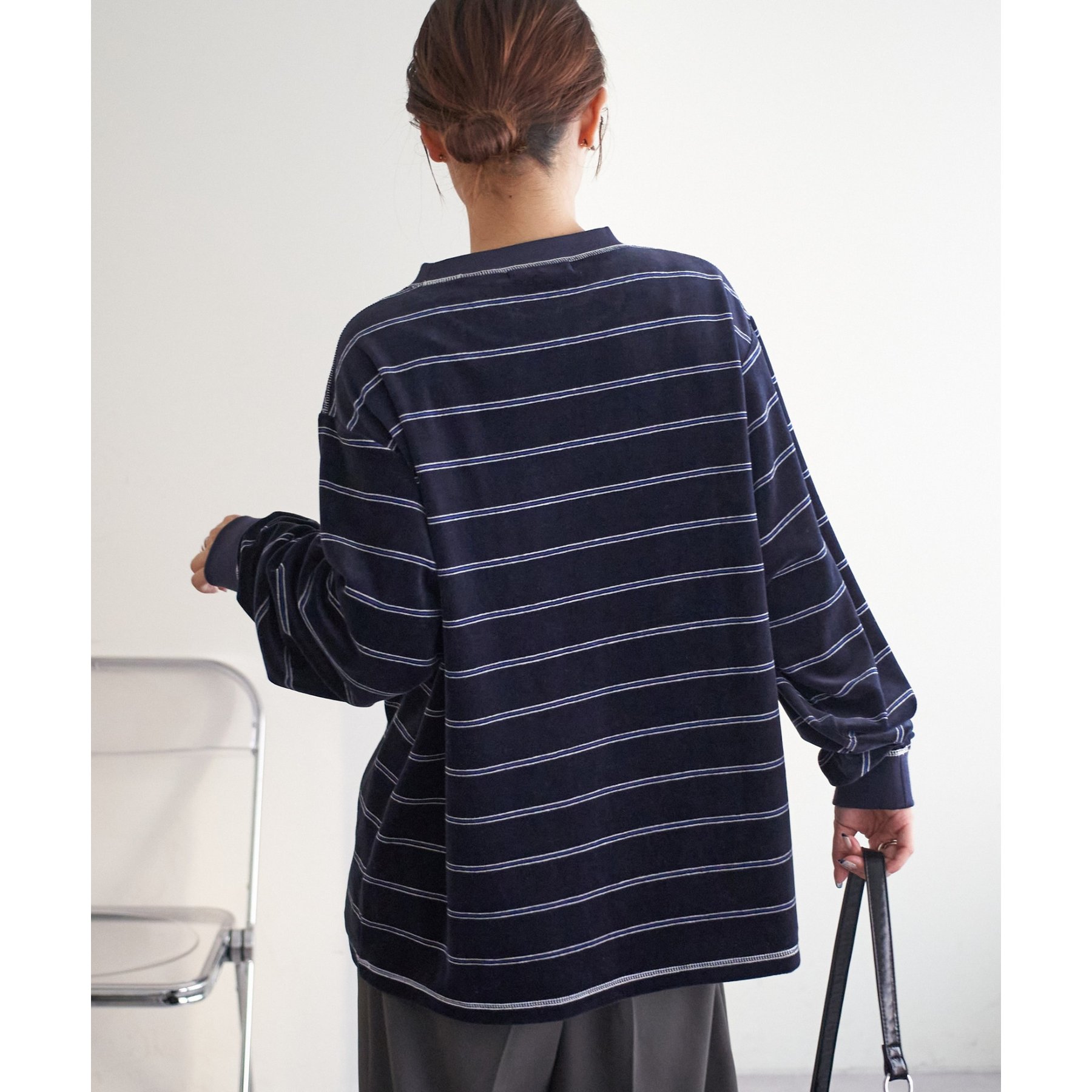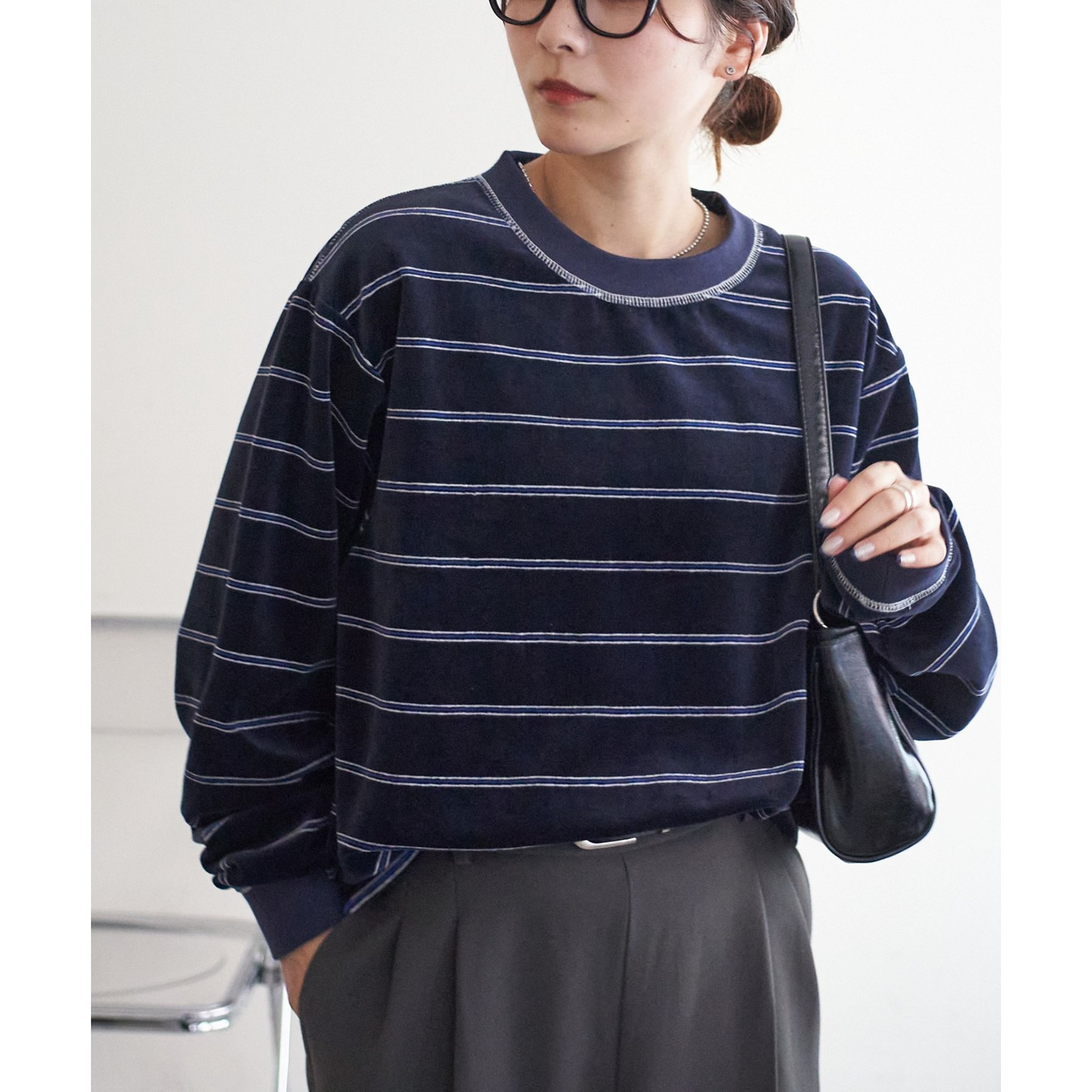 細めのボーダーでカジュアル感を出しながらも、ベロア特有の上品な光沢がコーディネートを格上げしてくれる1枚。