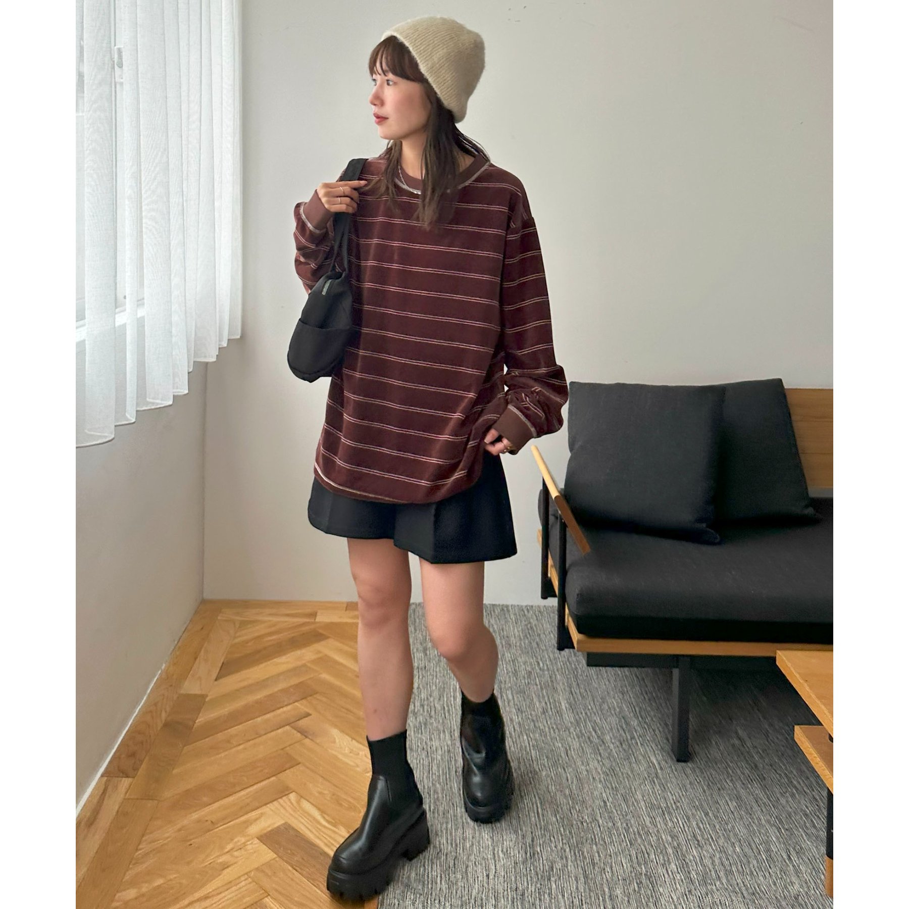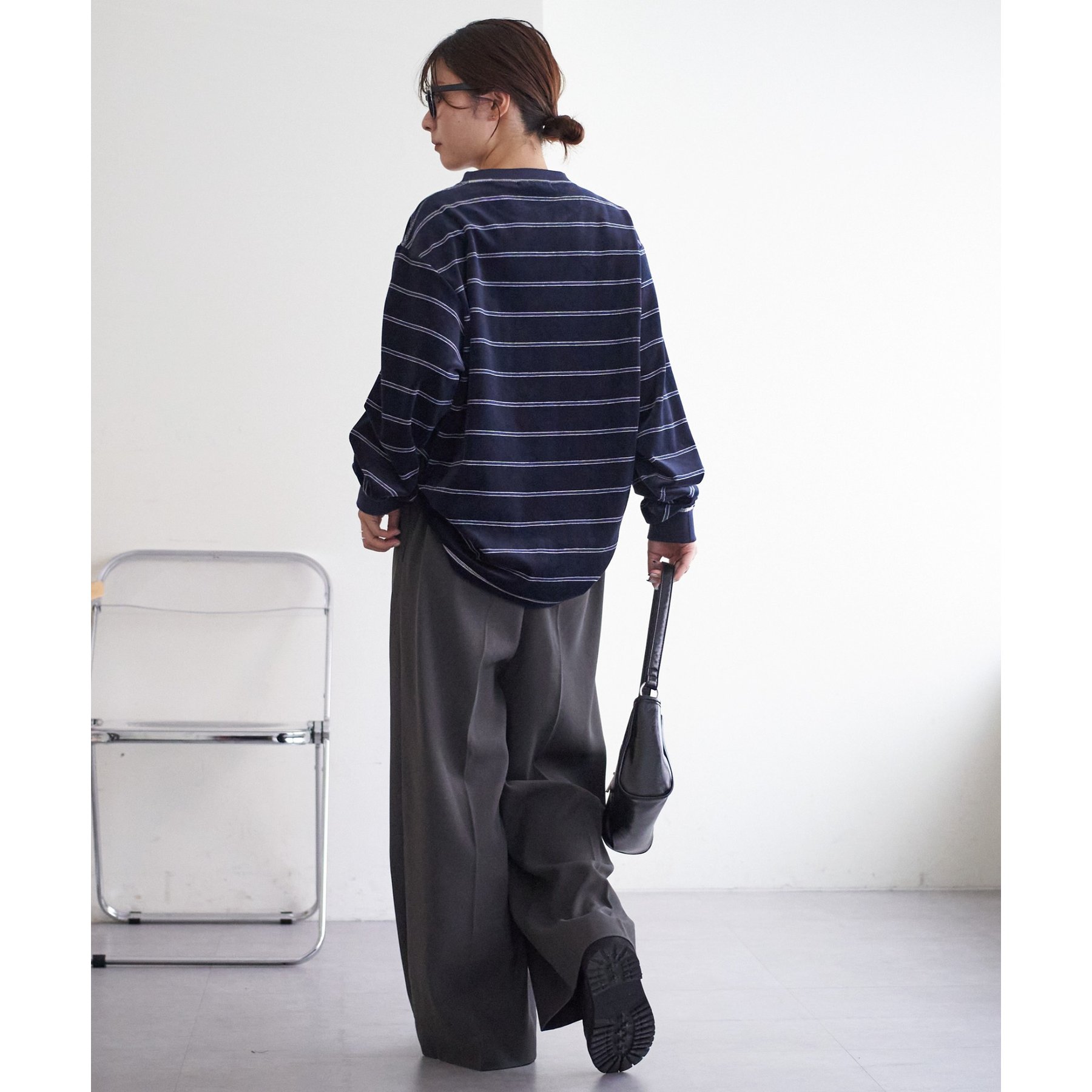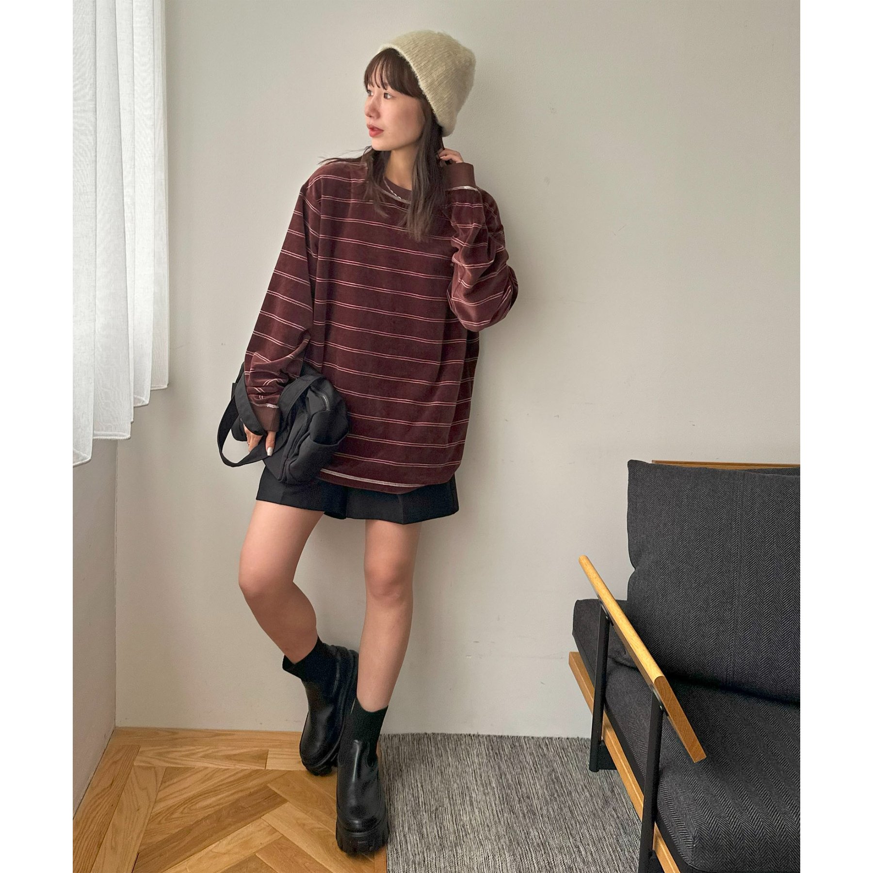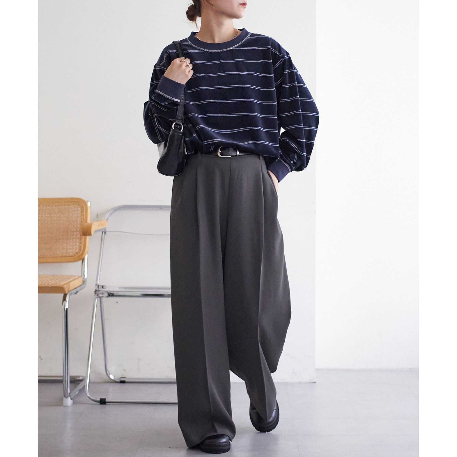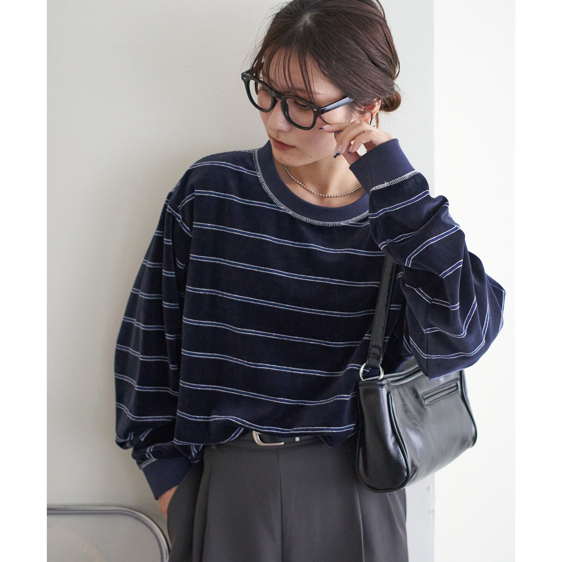 細めのボーダーでカジュアル感を出しながらも、ベロア特有の上品な光沢がコーディネートを格上げしてくれる1枚。