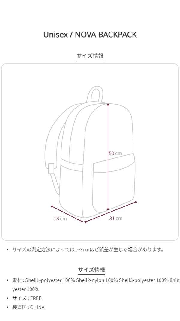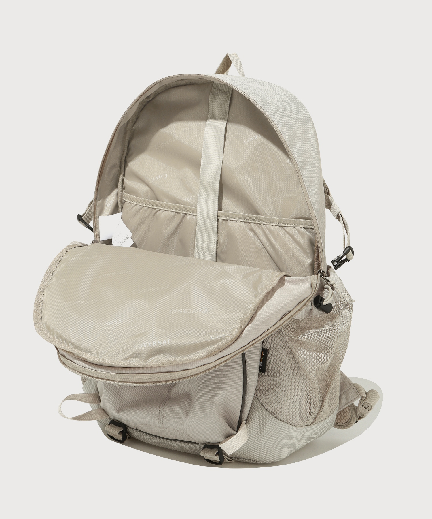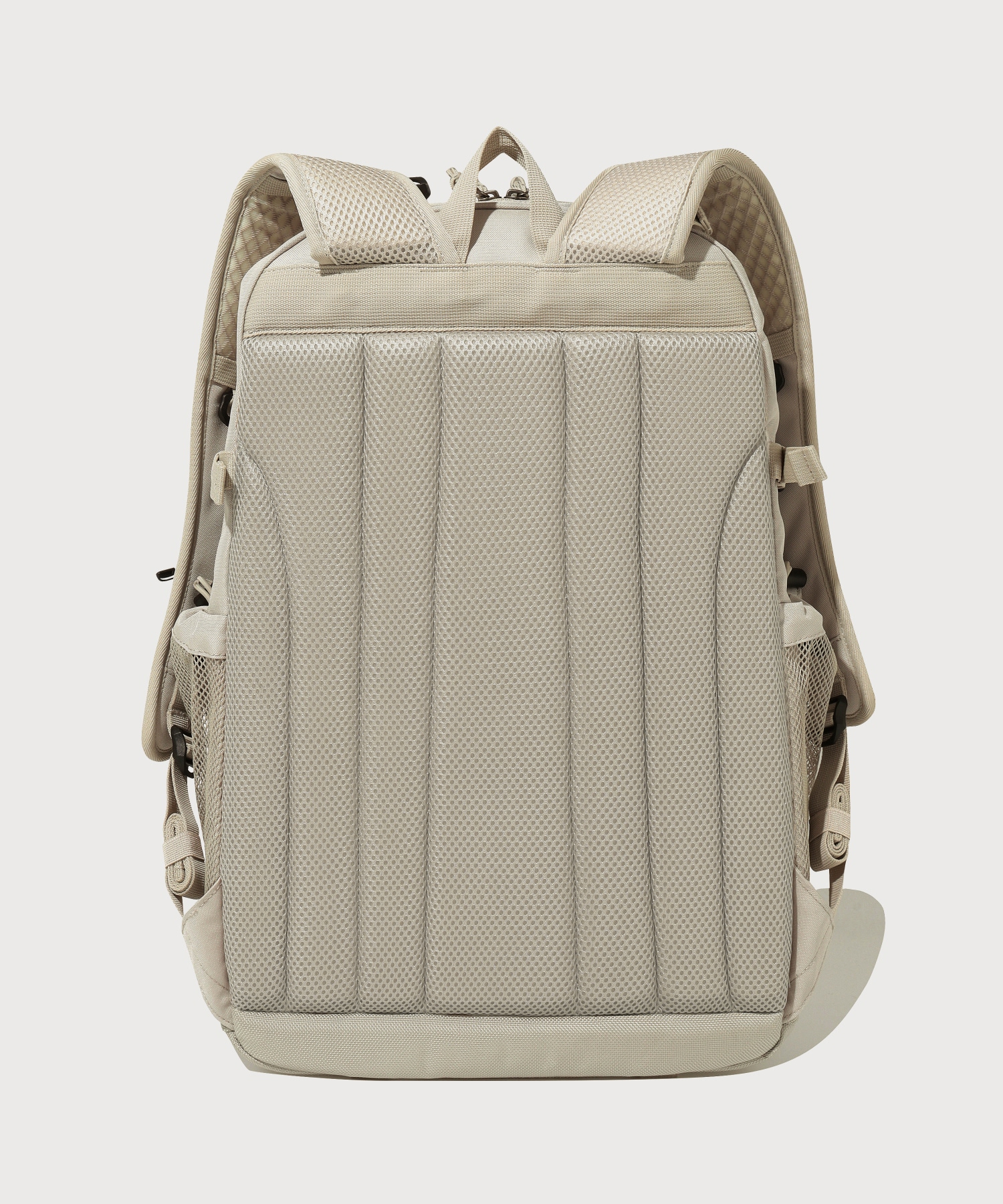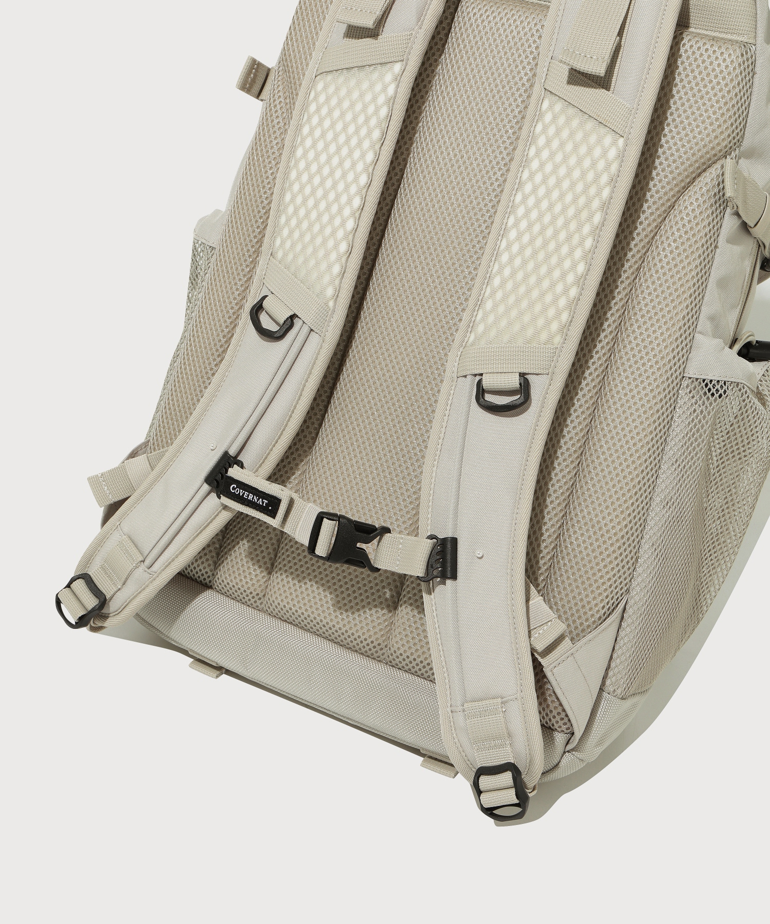 両サイドメッシュポケットとキーリングを掛けることができる波ウェビングディテールで活用度を拡張し、様々なサイズの外・内部収納スペースとメインポケット下部のたるみ防止パッドを適用して安定した収納構造を完成しました。