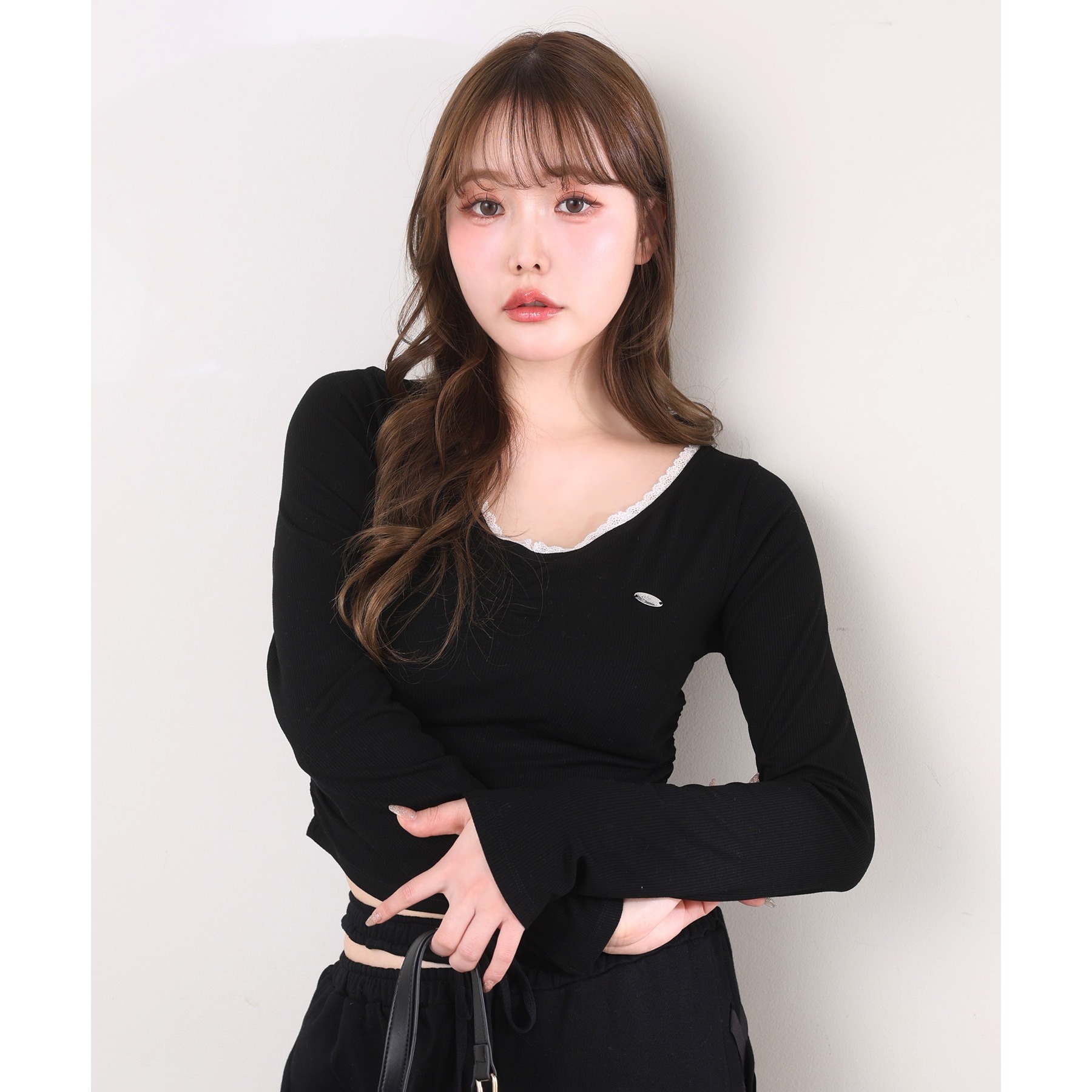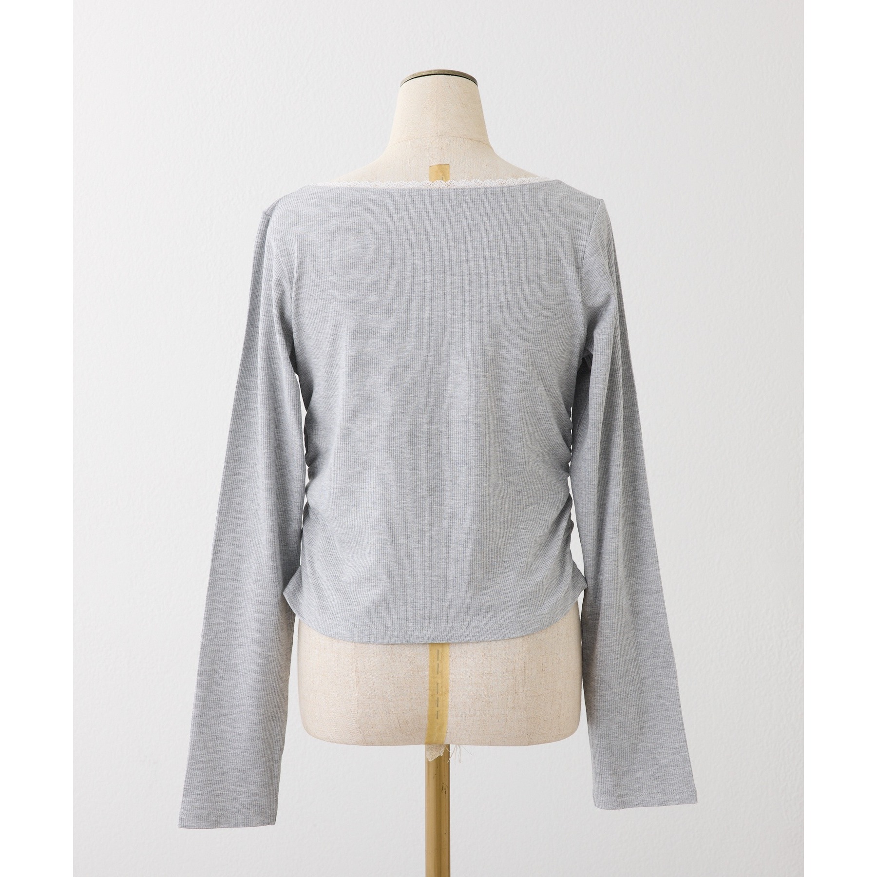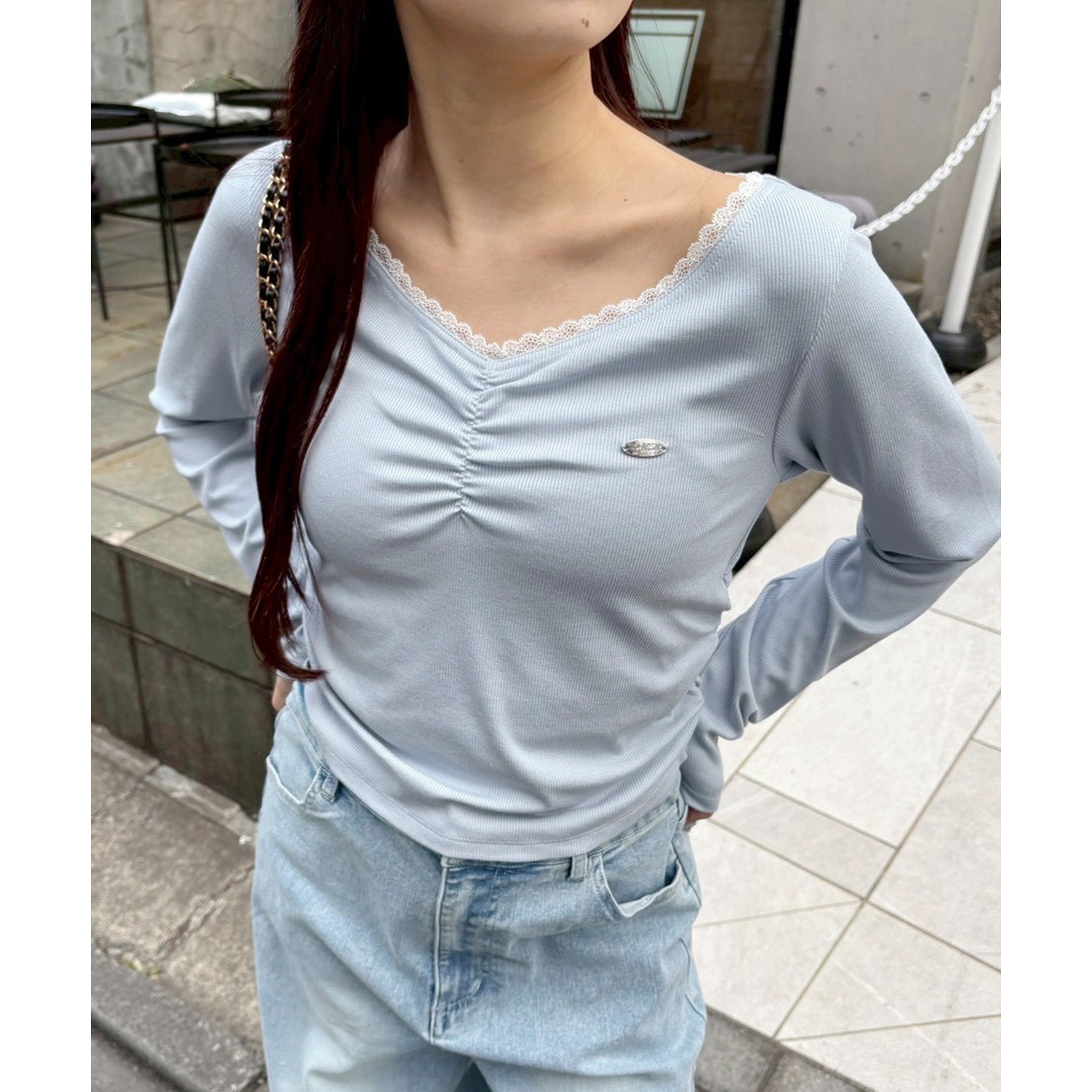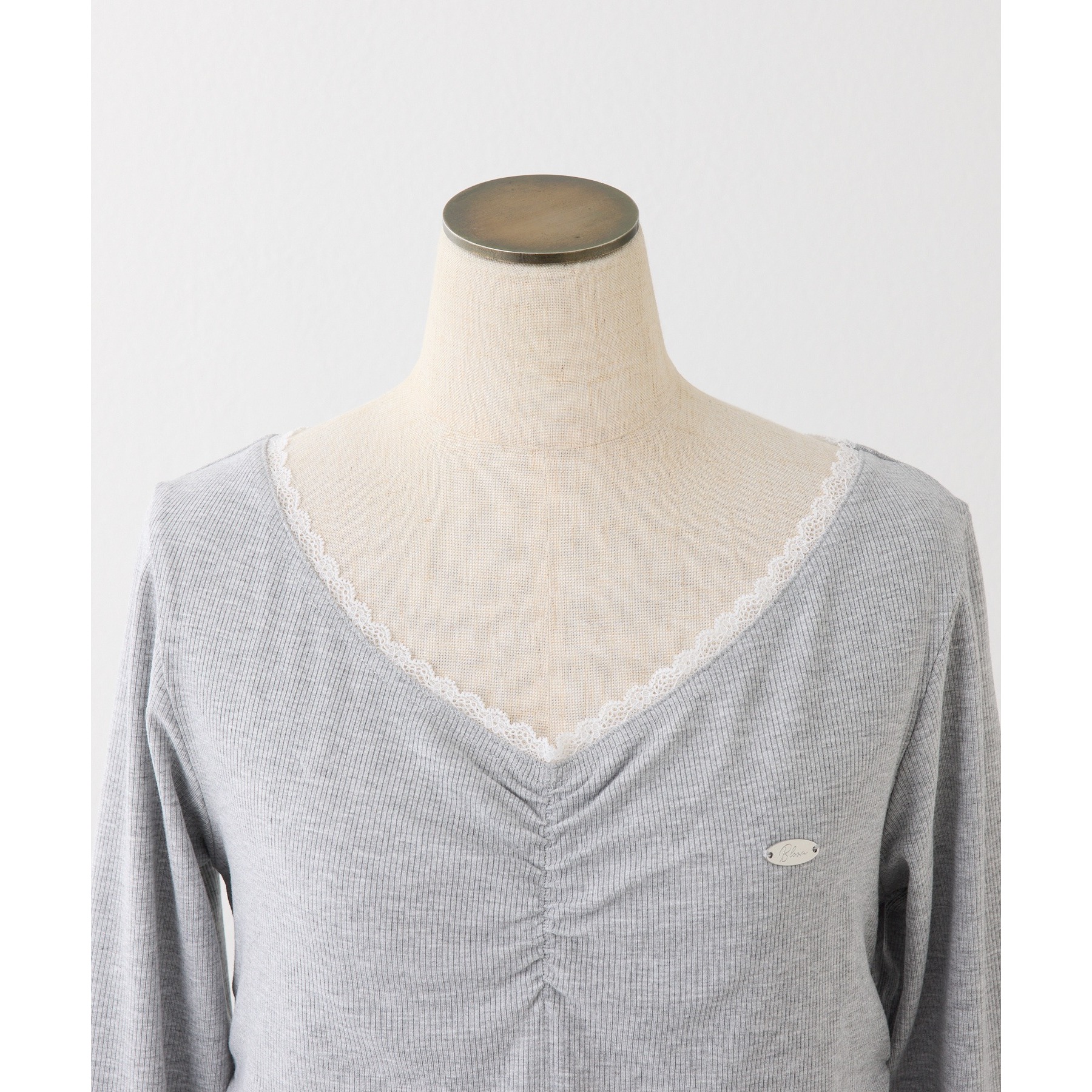 襟元にレースをあしらい、顔まわりを華やかに見せてくれる長袖カットソー。