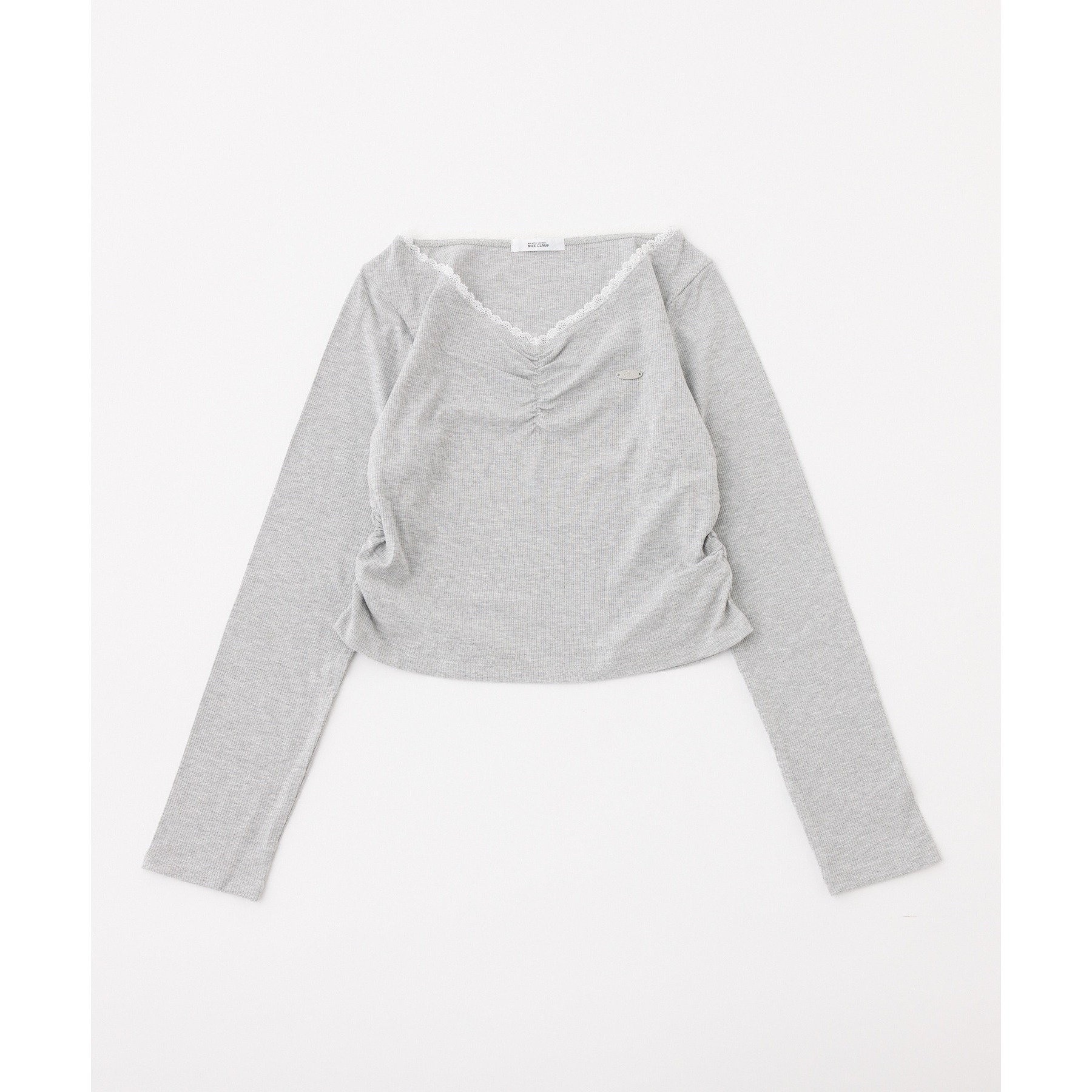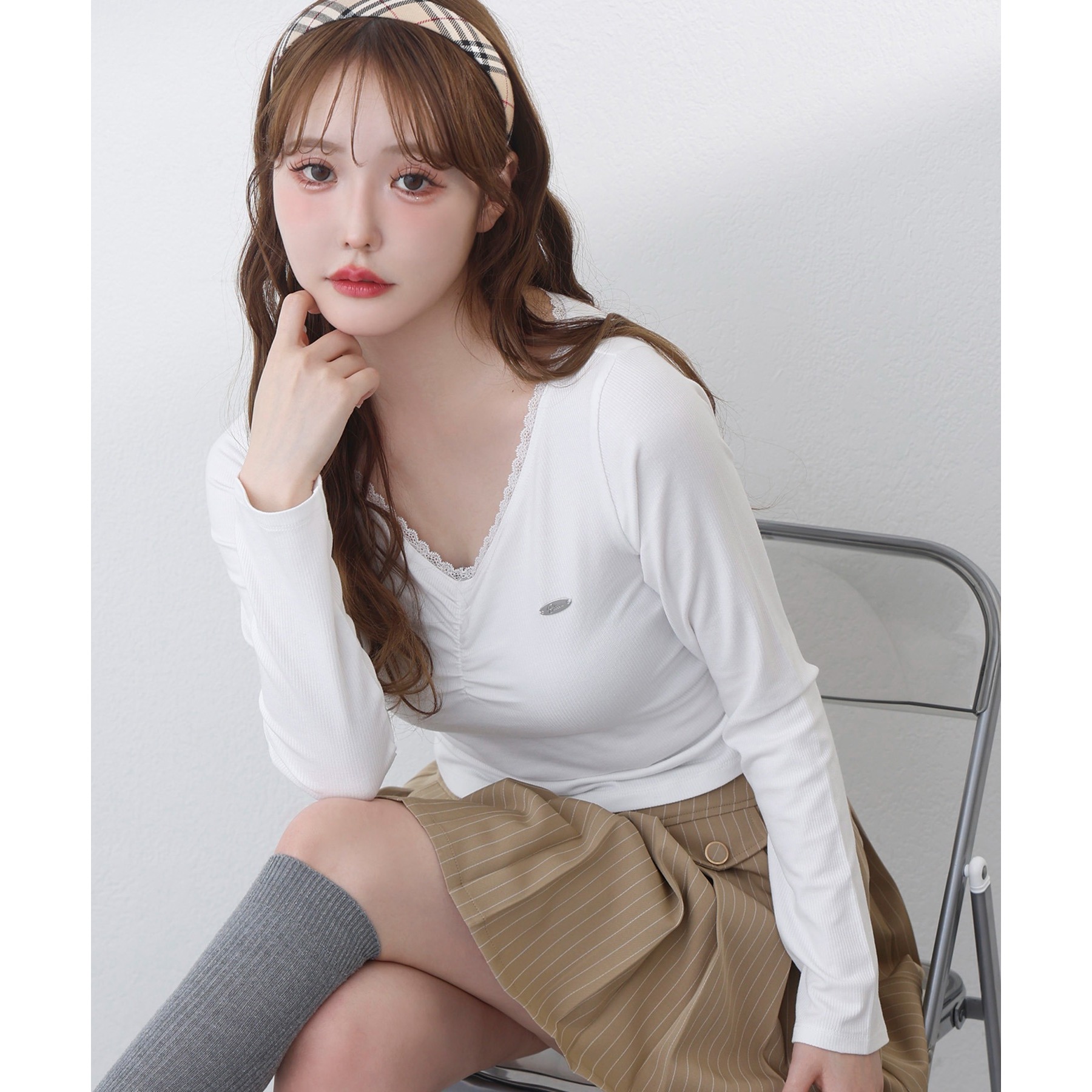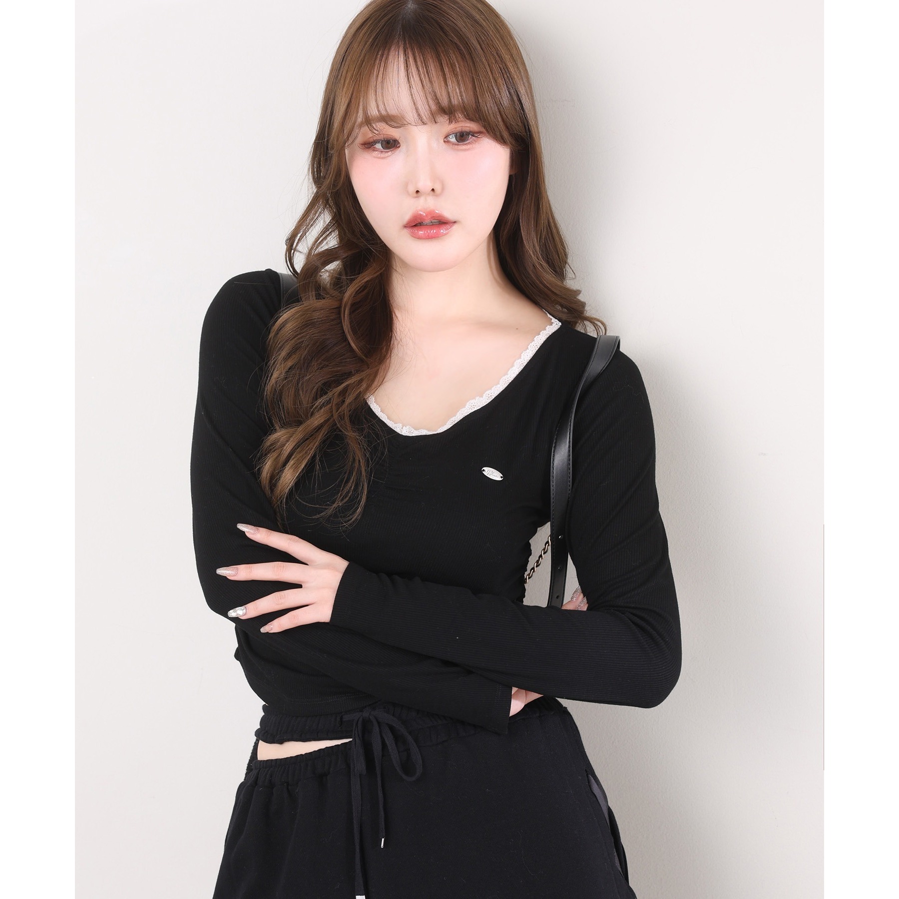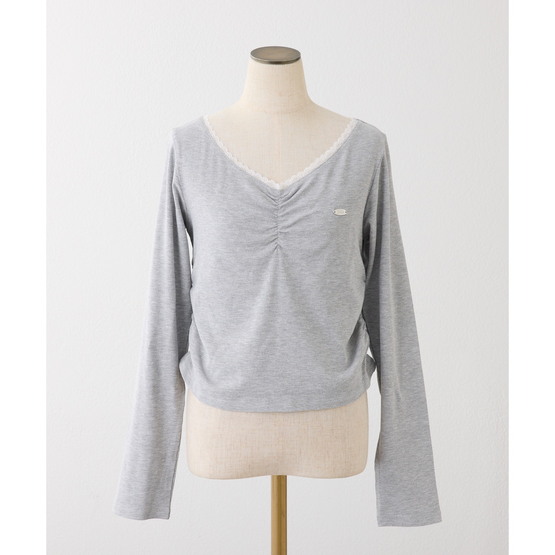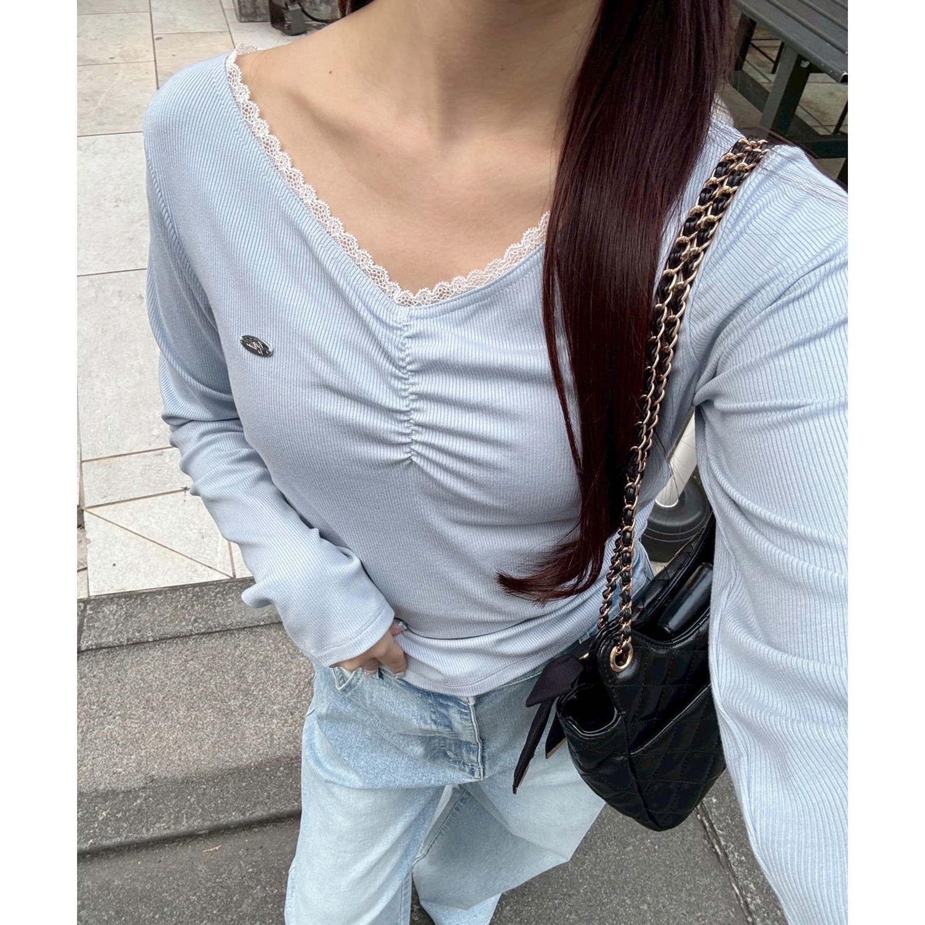 襟元にレースをあしらい、顔まわりを華やかに見せてくれる長袖カットソー。