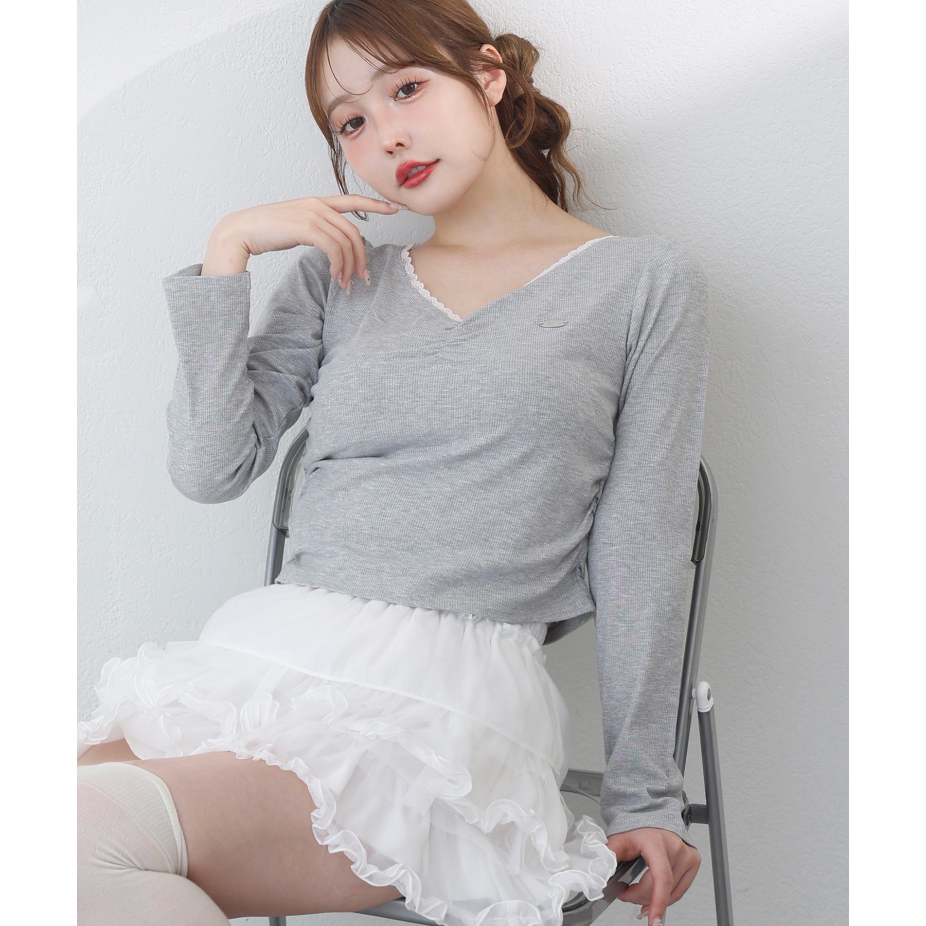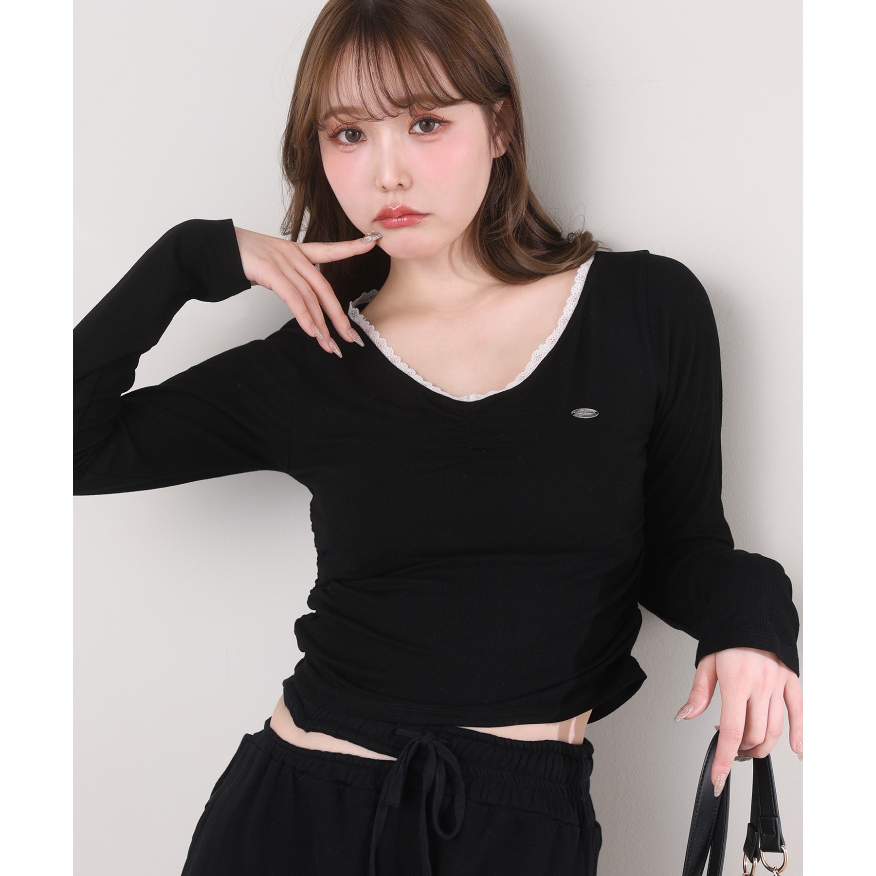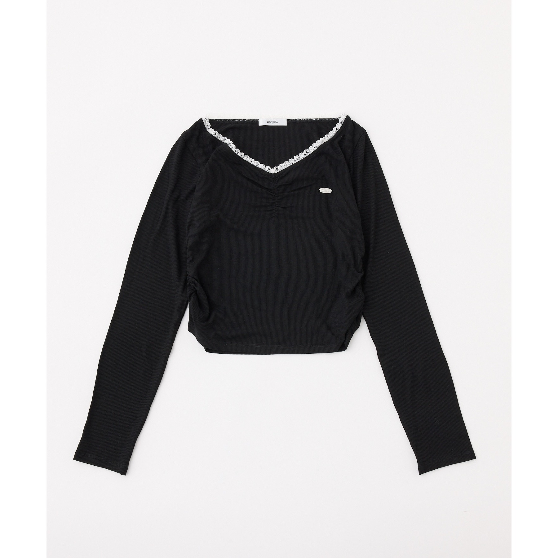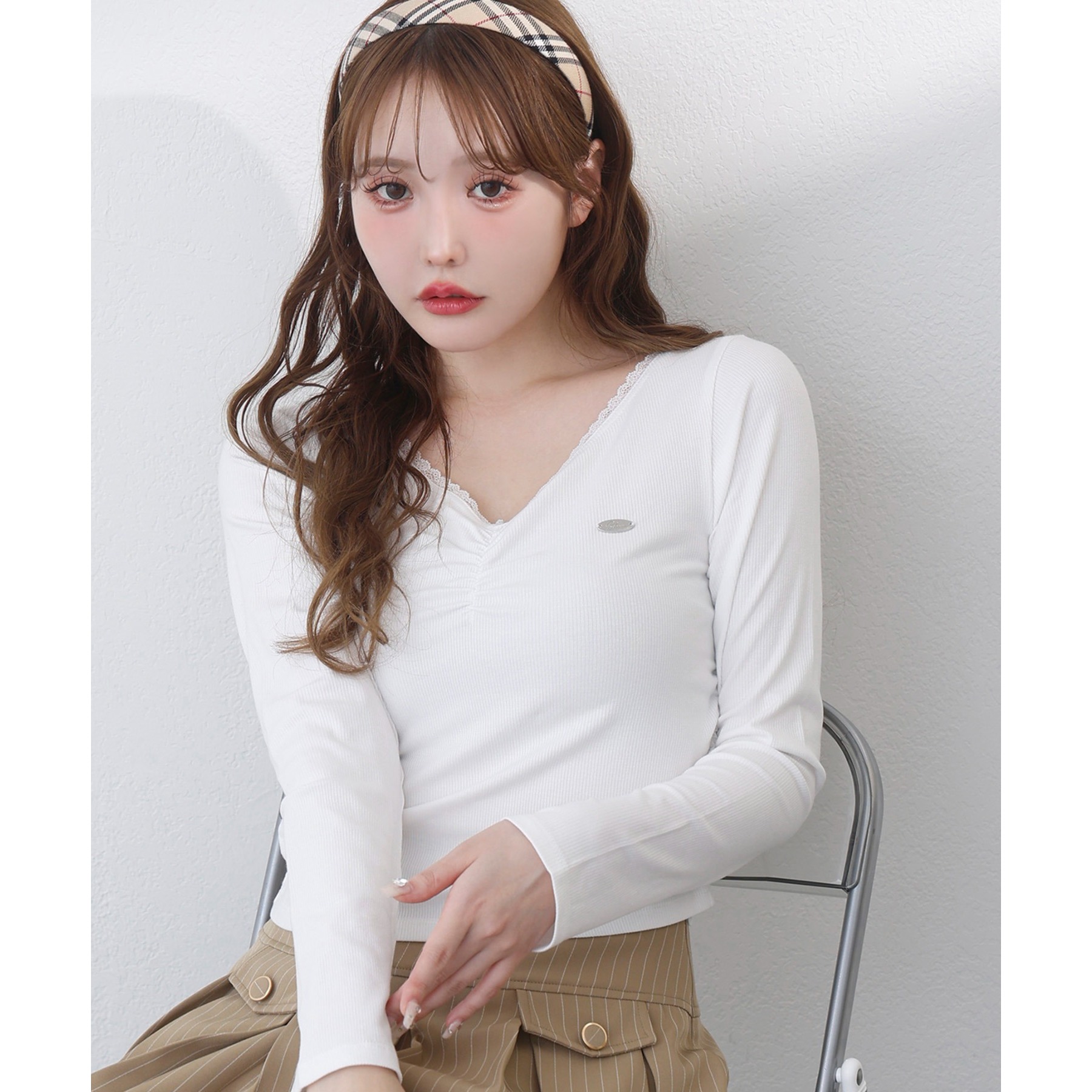 襟元にレースをあしらい、顔まわりを華やかに見せてくれる長袖カットソー。
