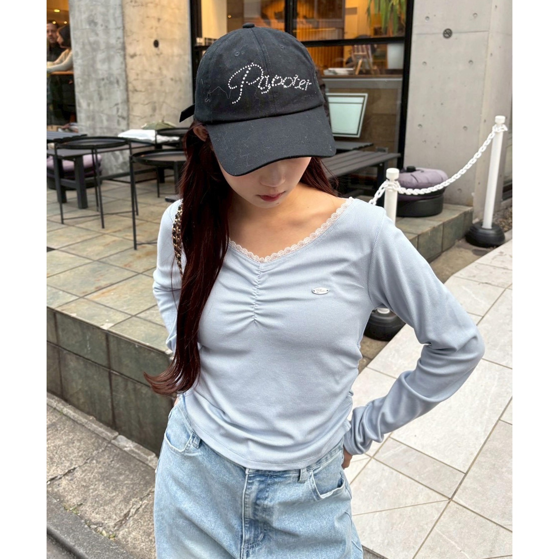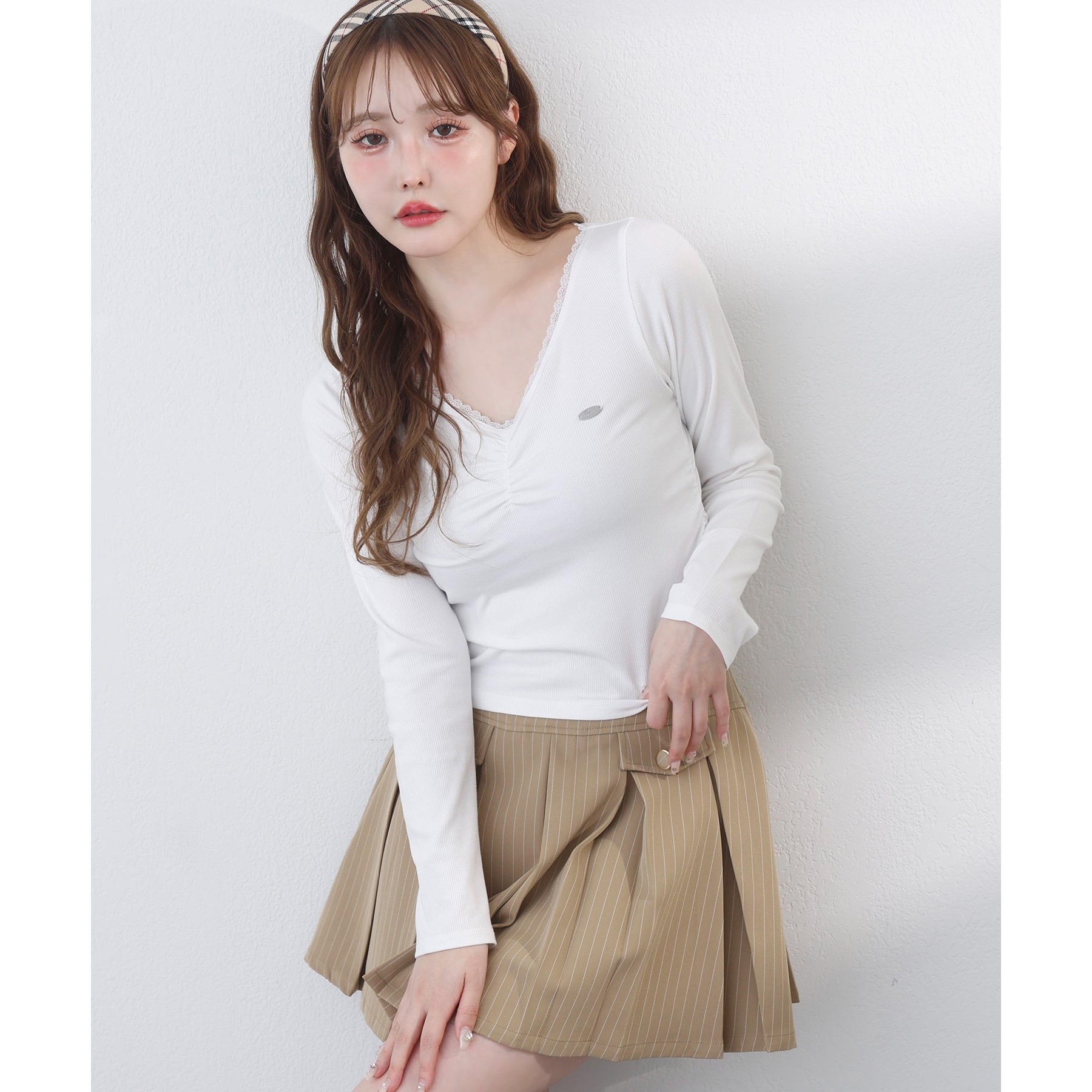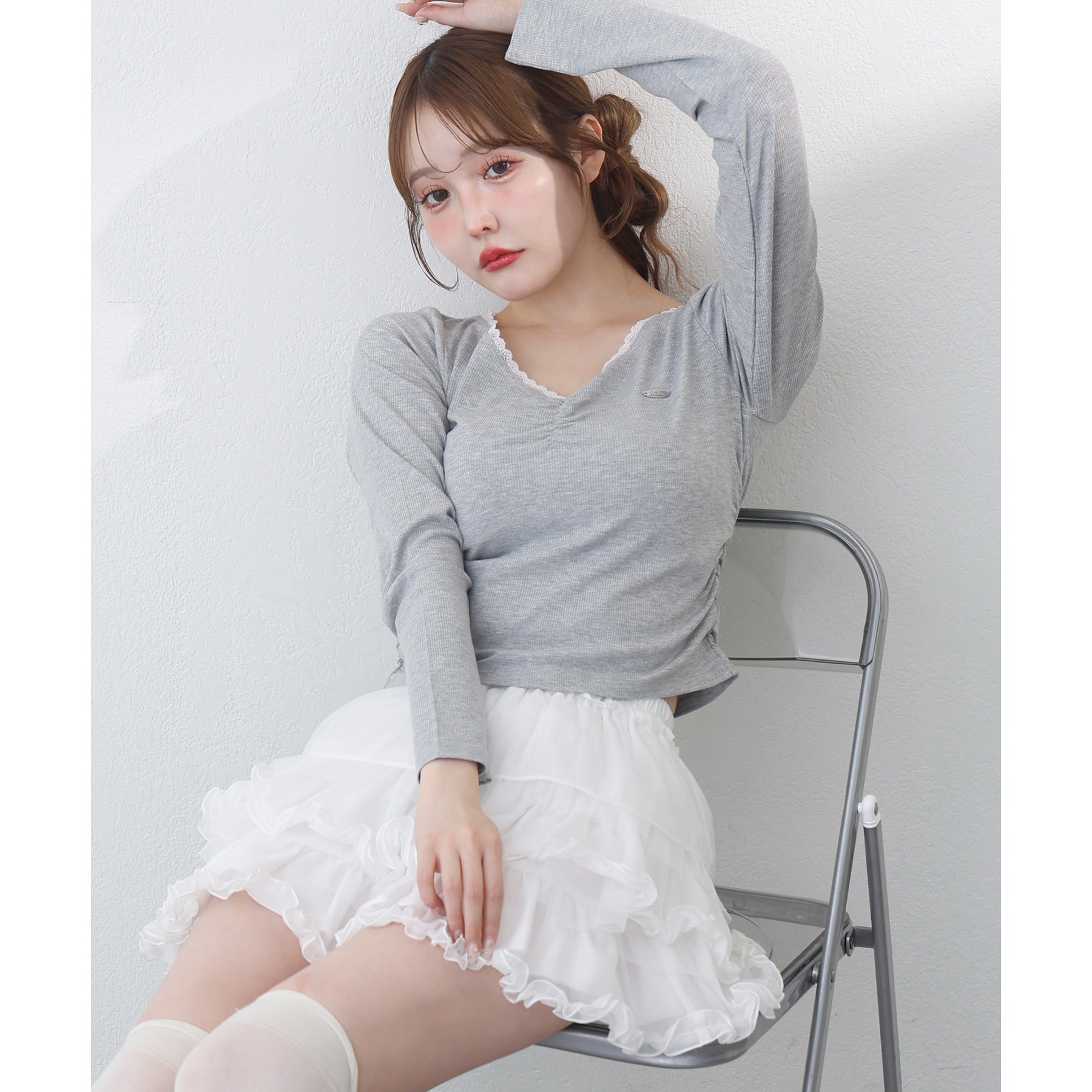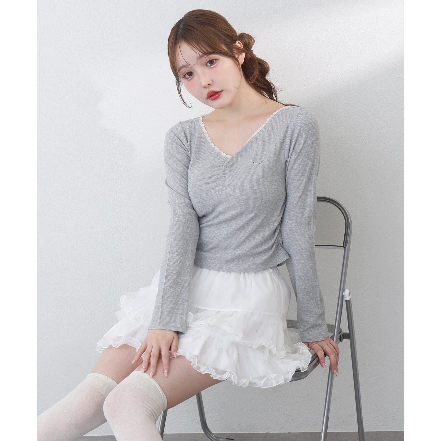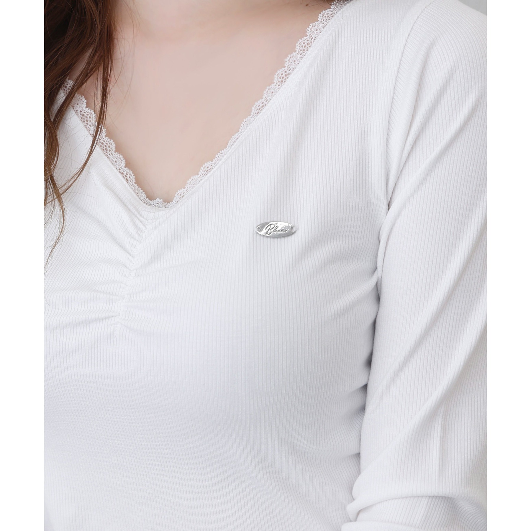 襟元にレースをあしらい、顔まわりを華やかに見せてくれる長袖カットソー。