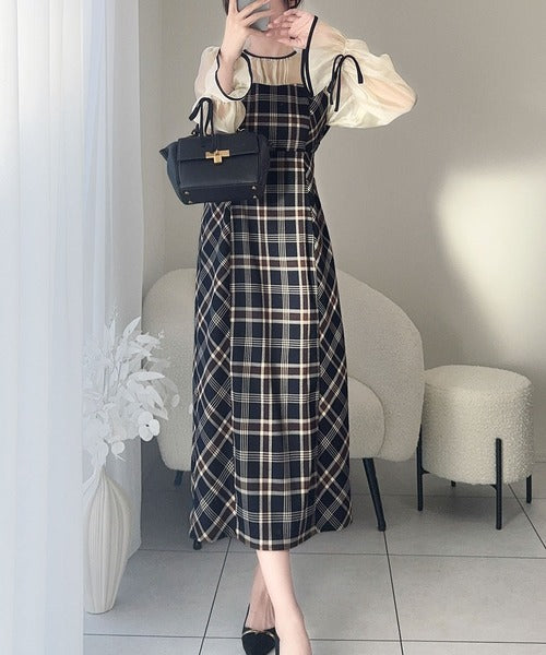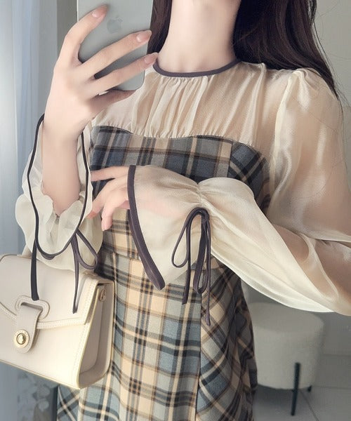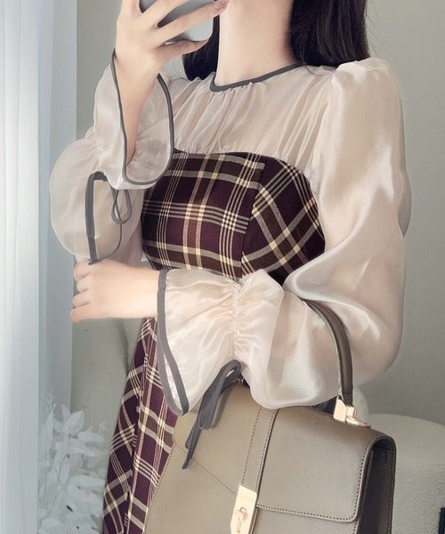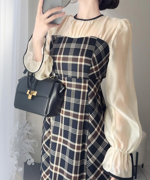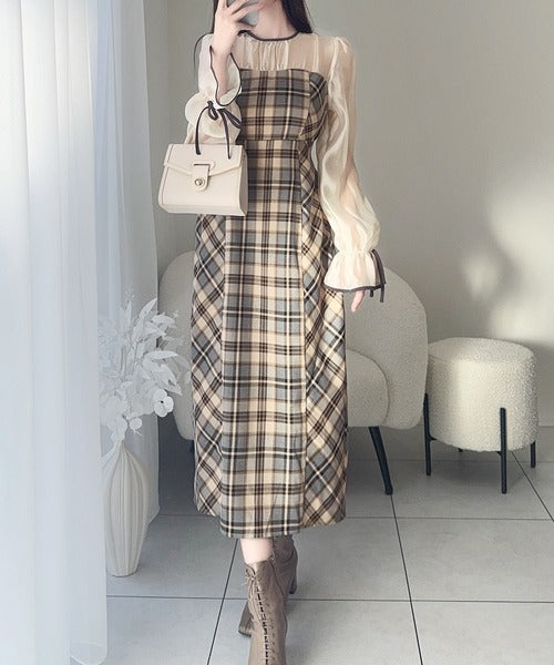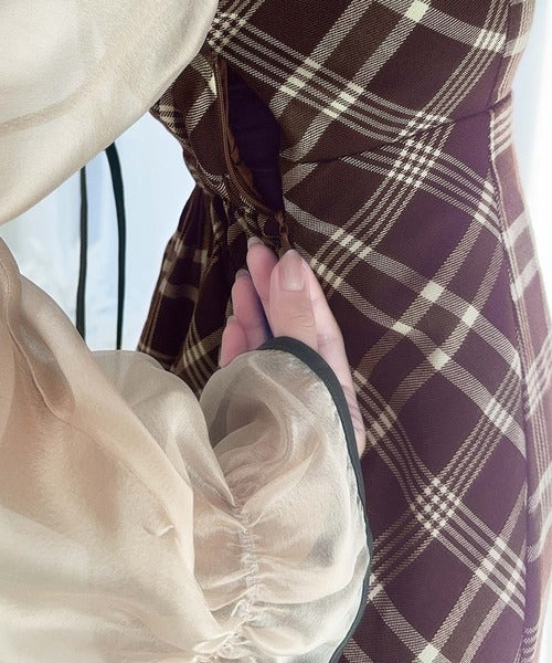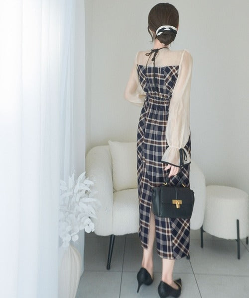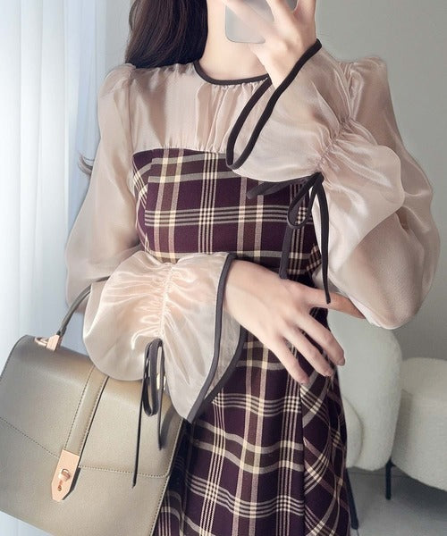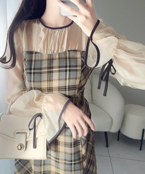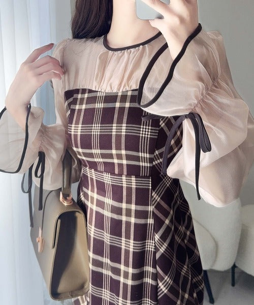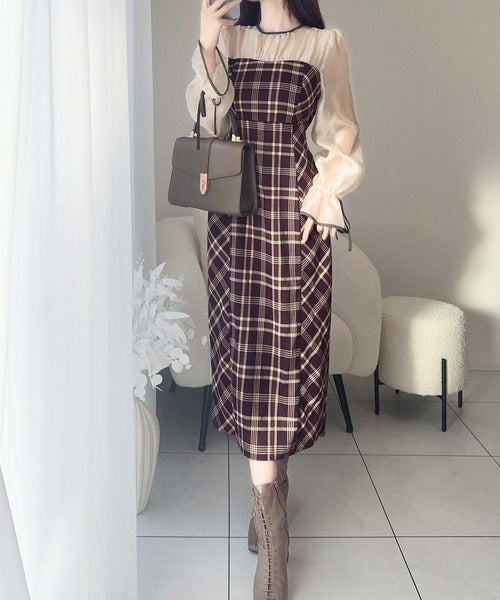 程よい透け感の微シャイニー素材とチェック柄のドッキングワンピース。