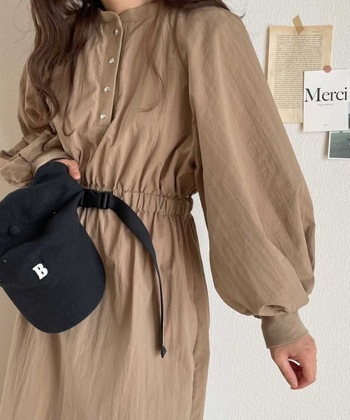 トレンドのバンドカラーとふんわり袖が目を惹くアイテム。