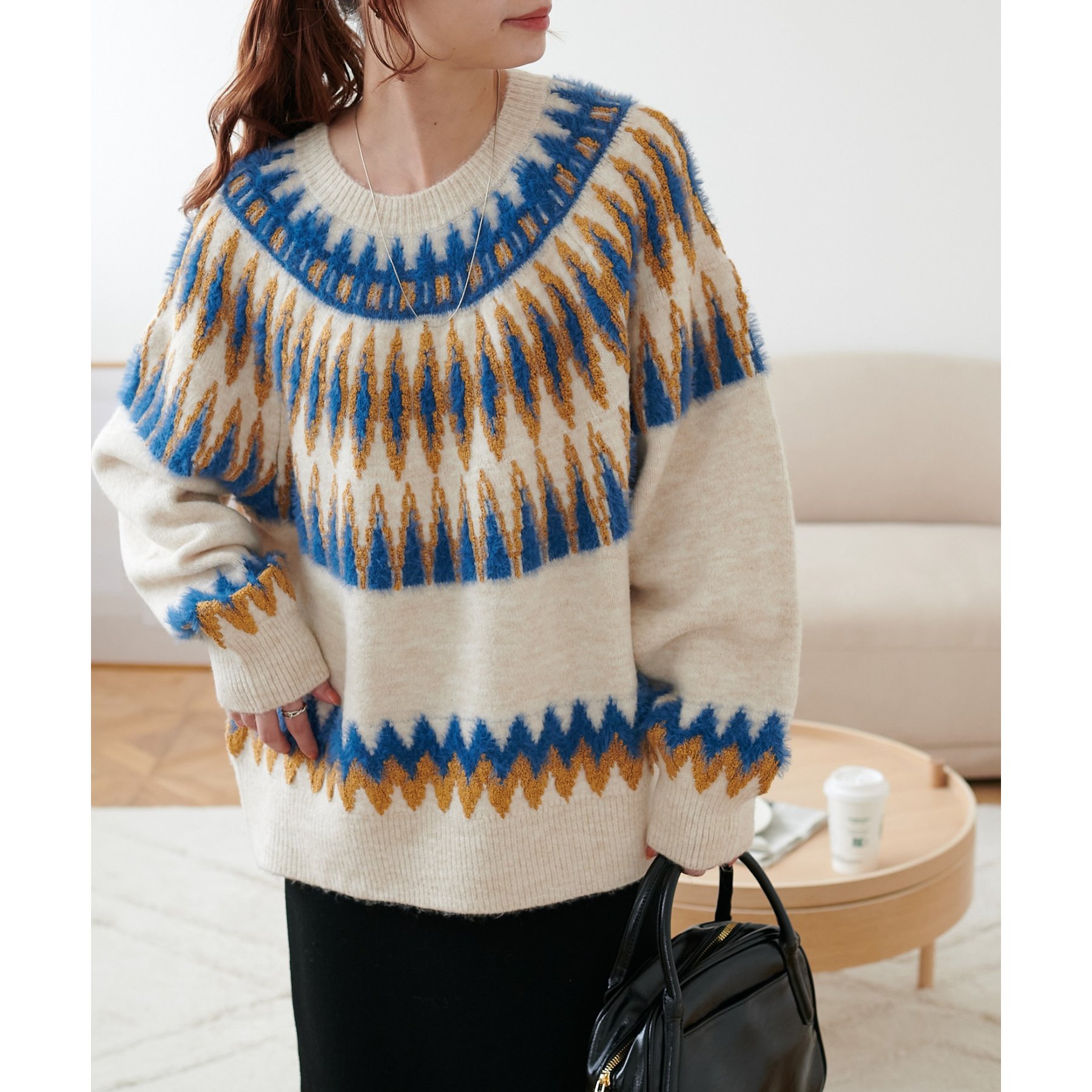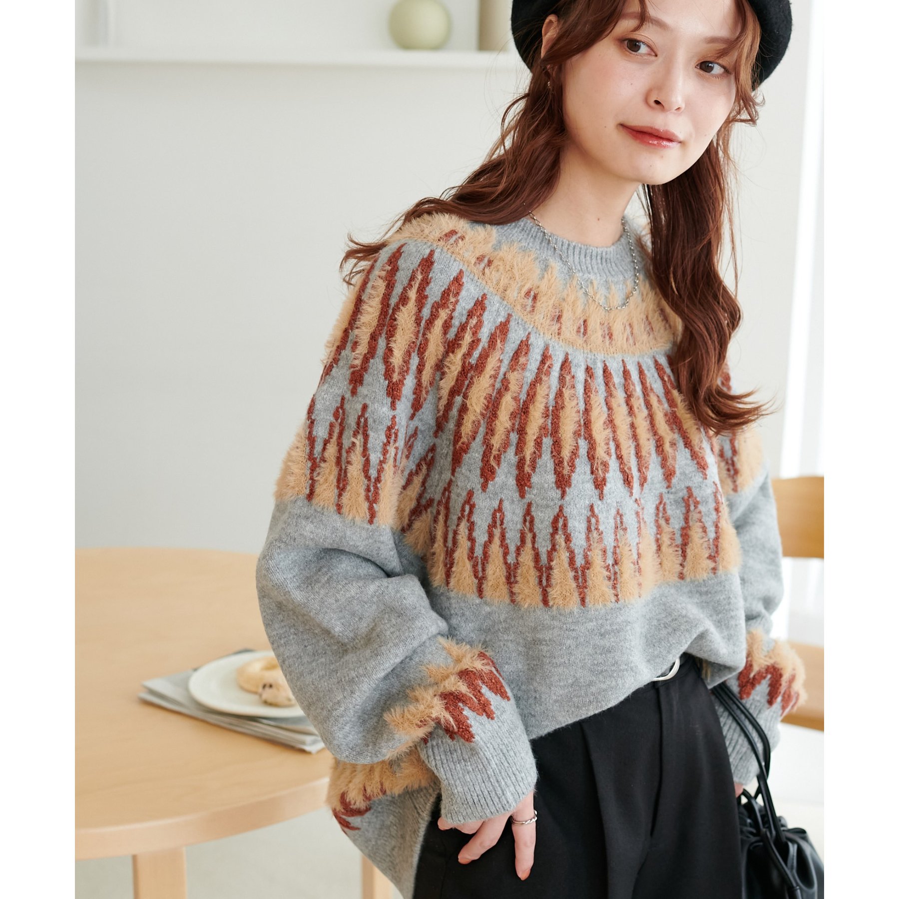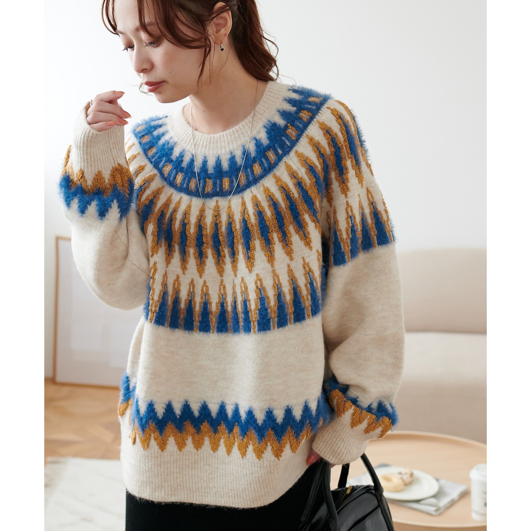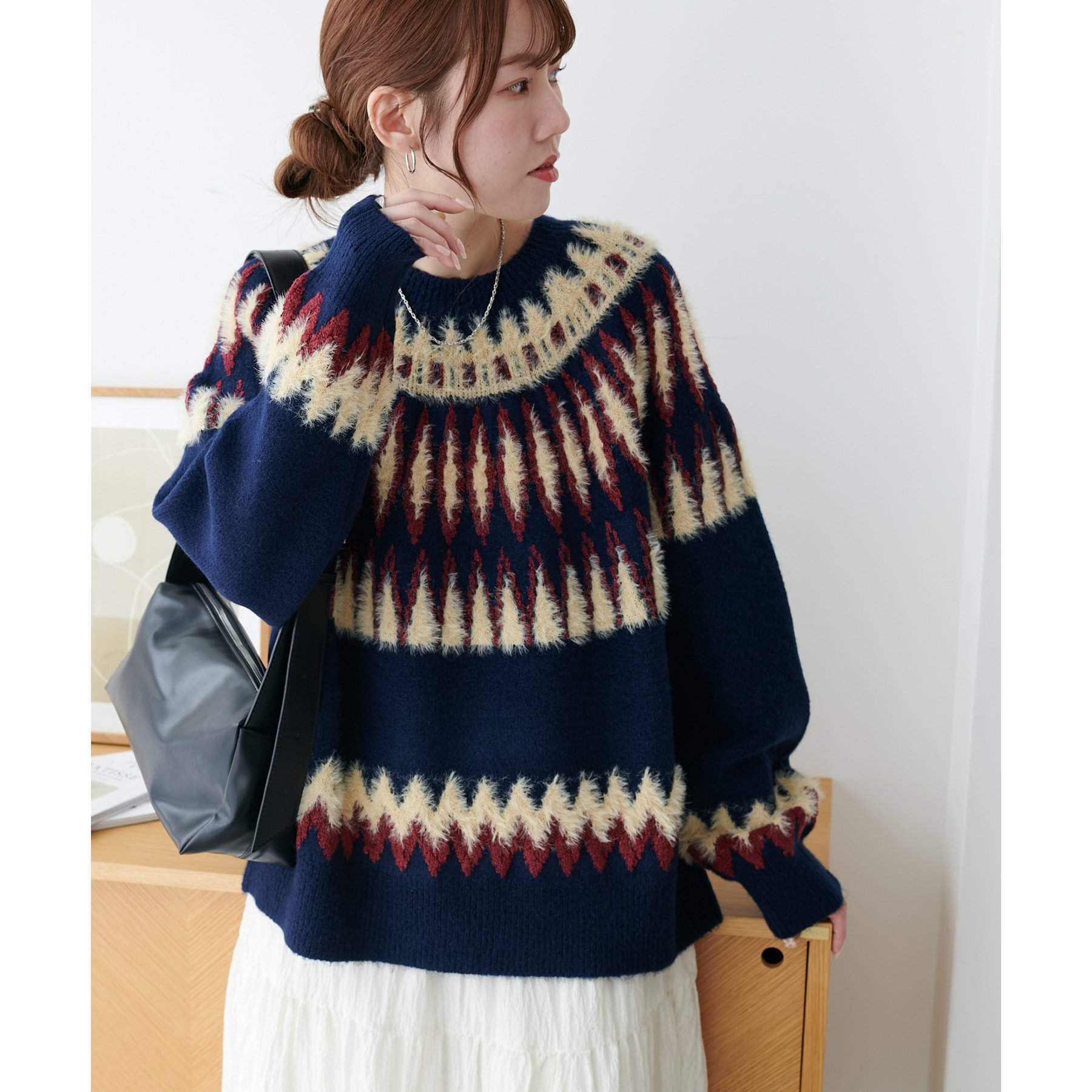 ・シーズンムードを高める求心柄デザインで、アクセントになる配色が目を惹く主役級ニット