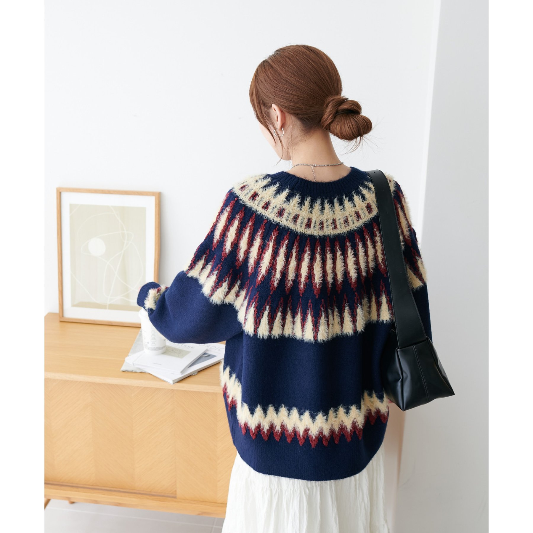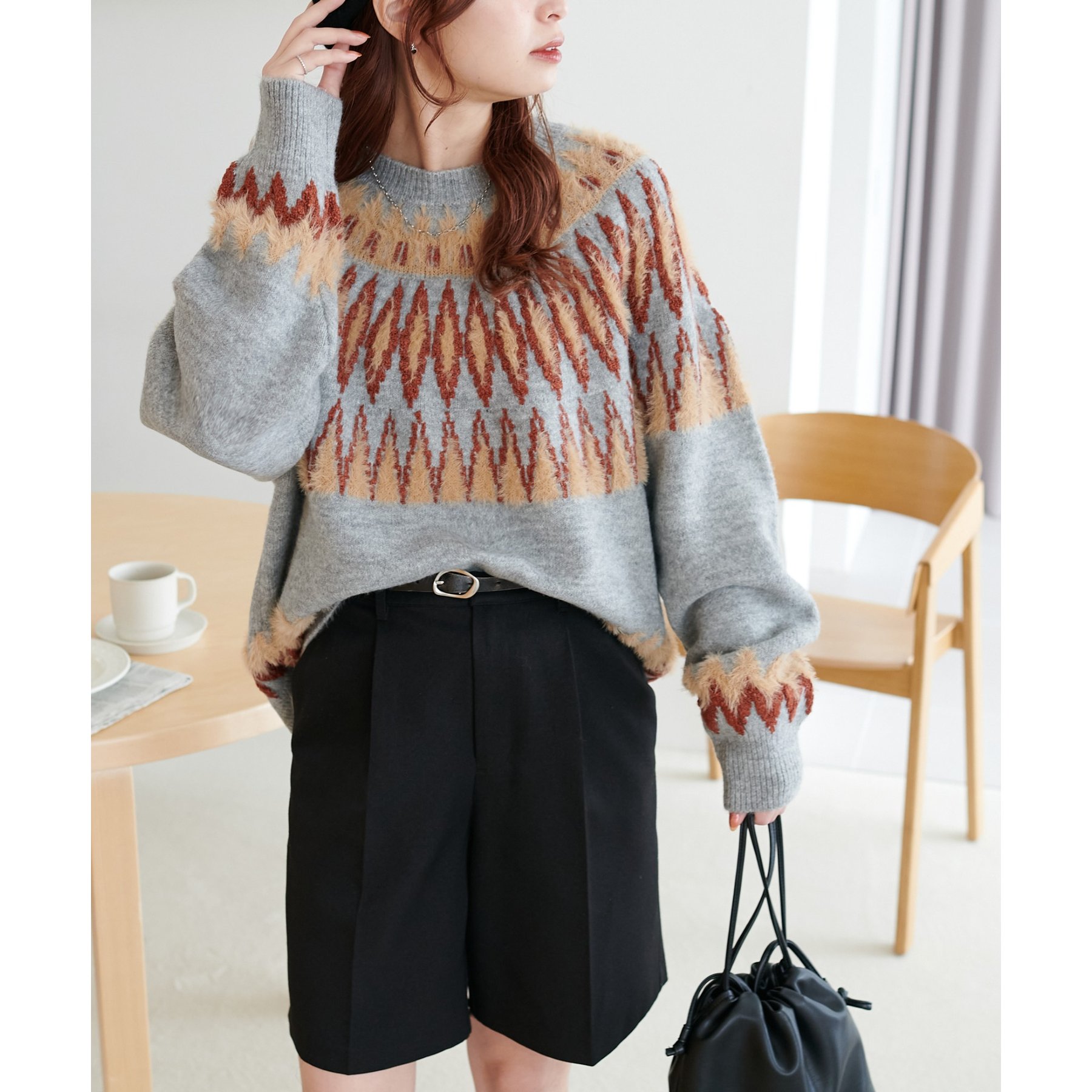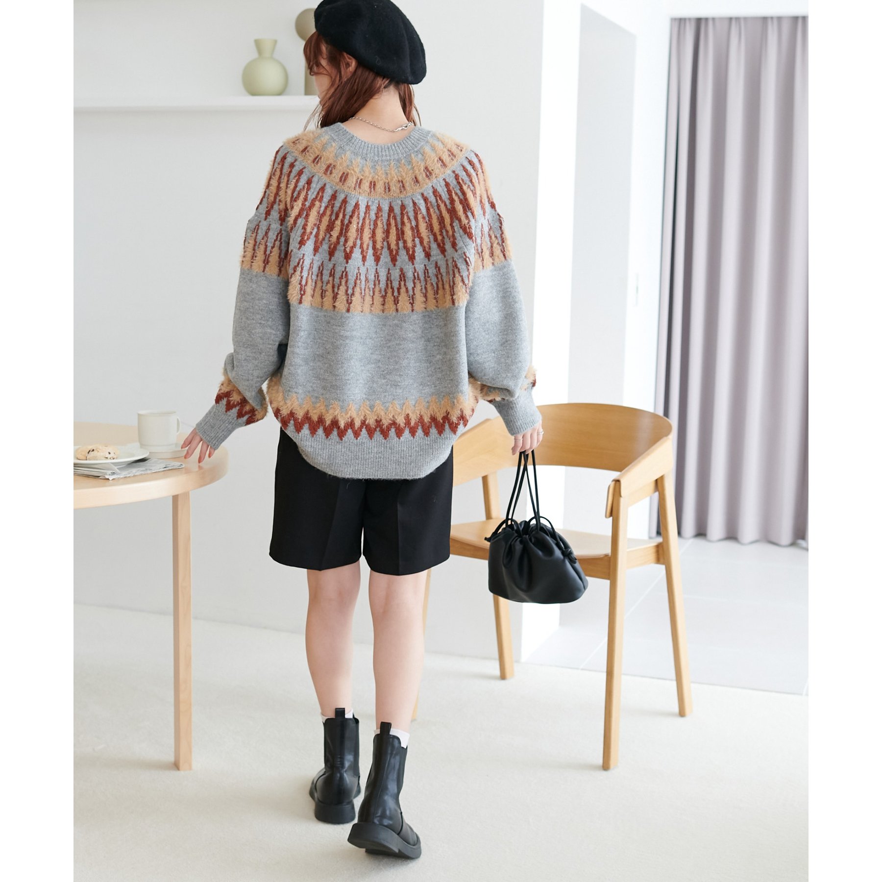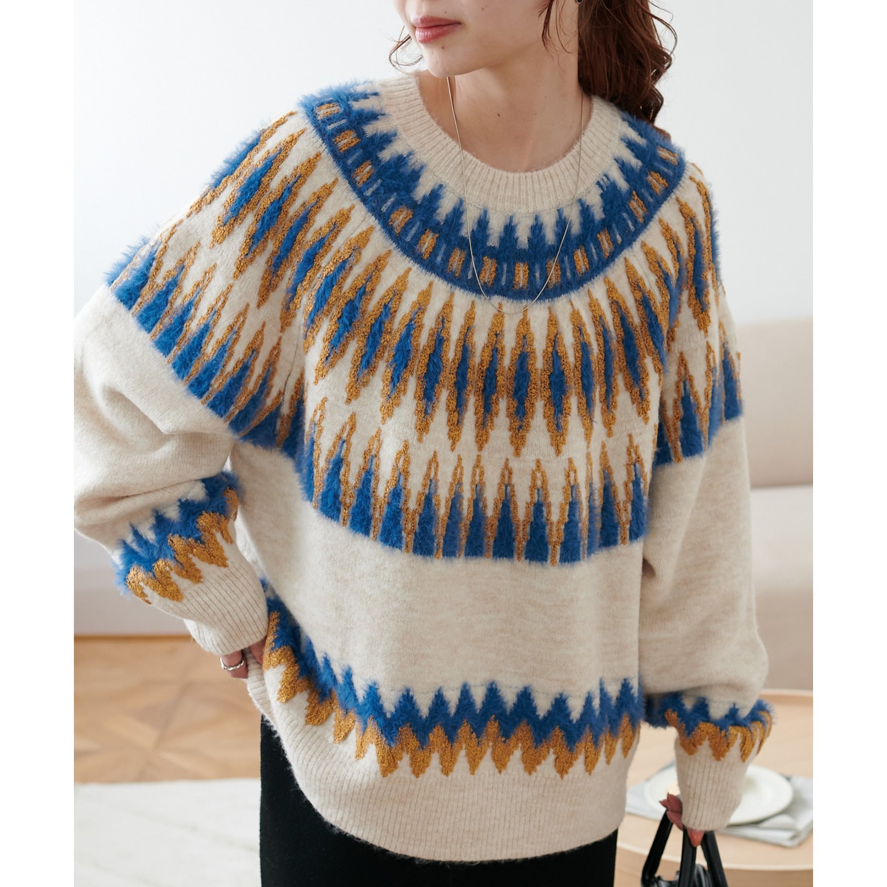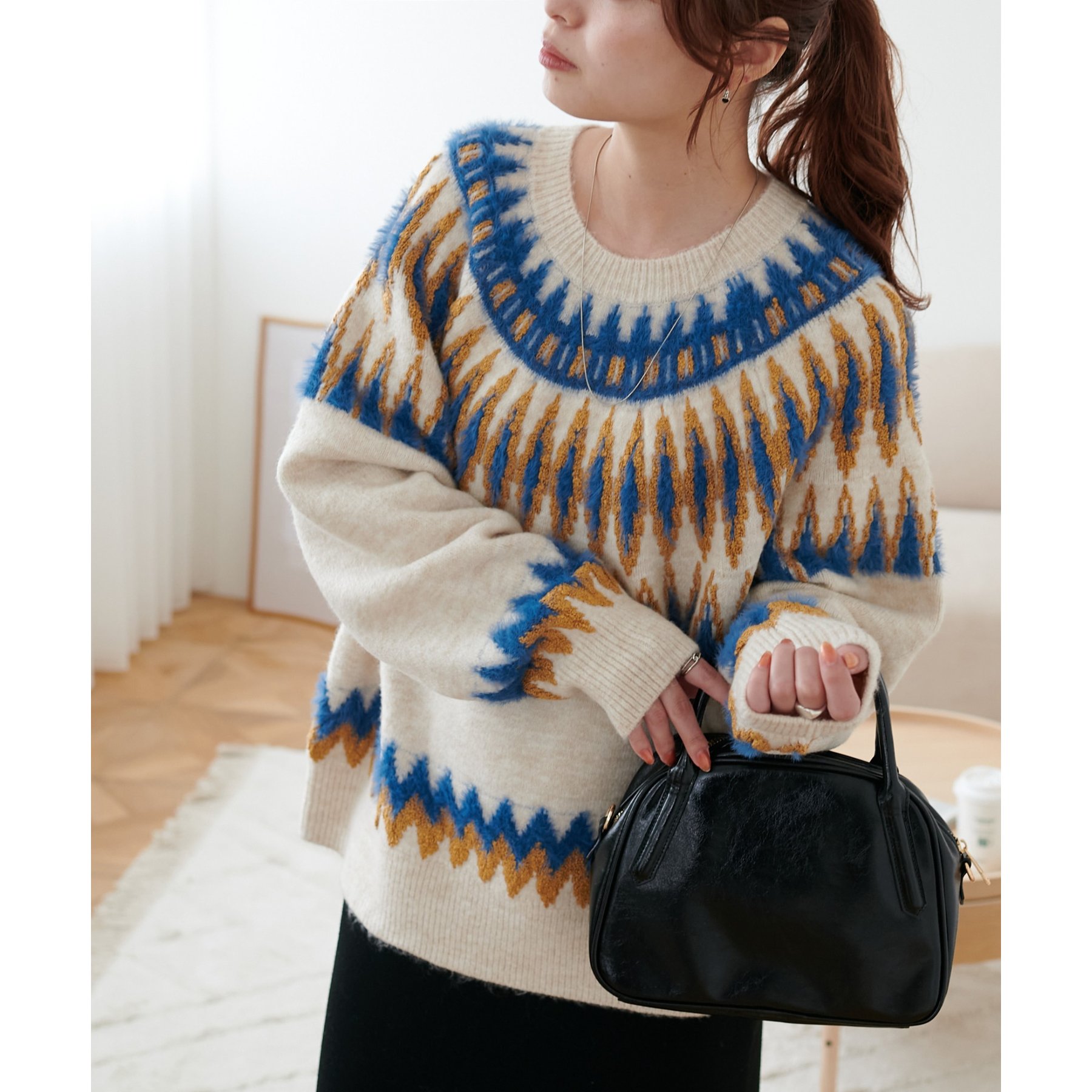 ・シーズンムードを高める求心柄デザインで、アクセントになる配色が目を惹く主役級ニット